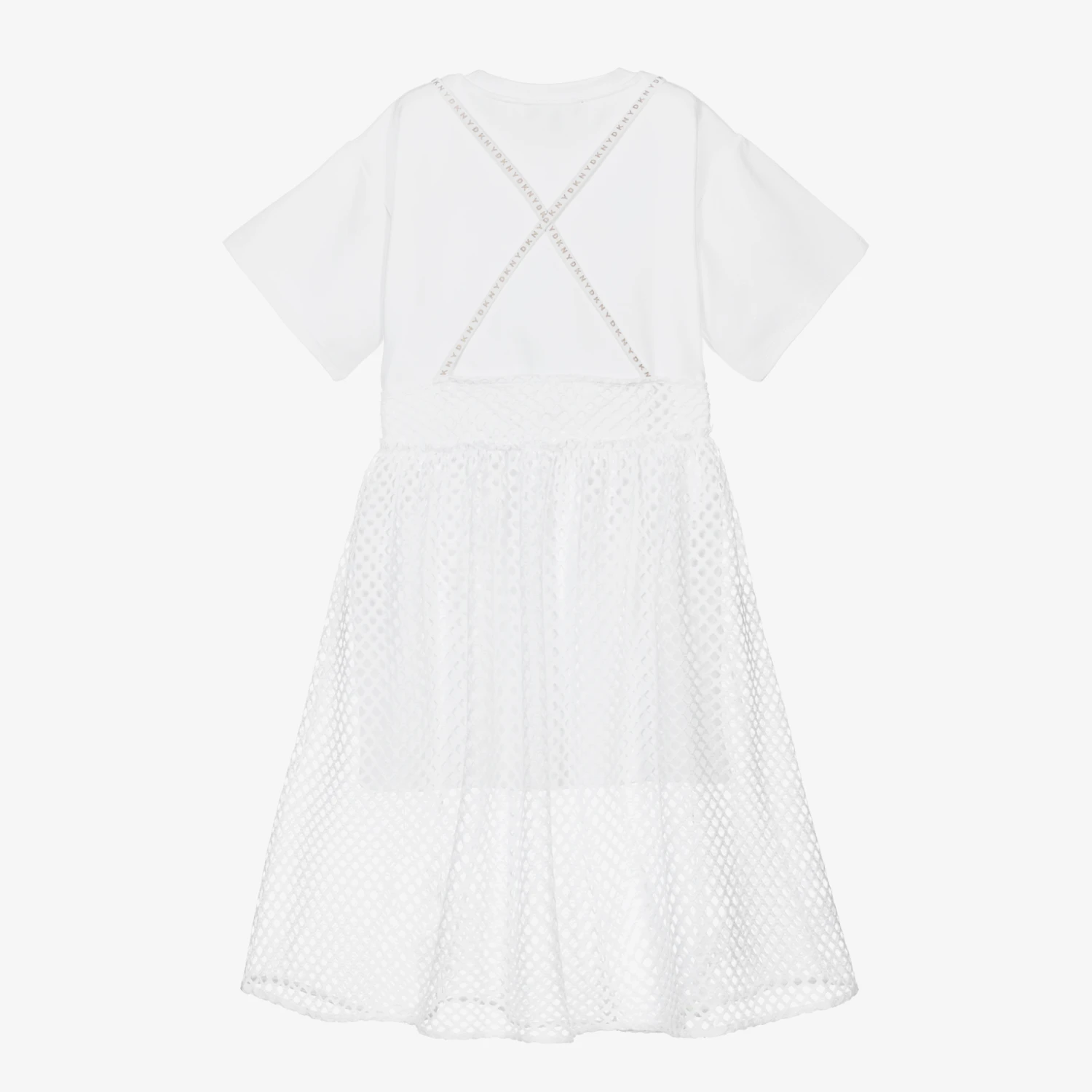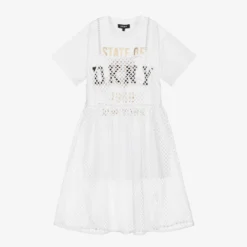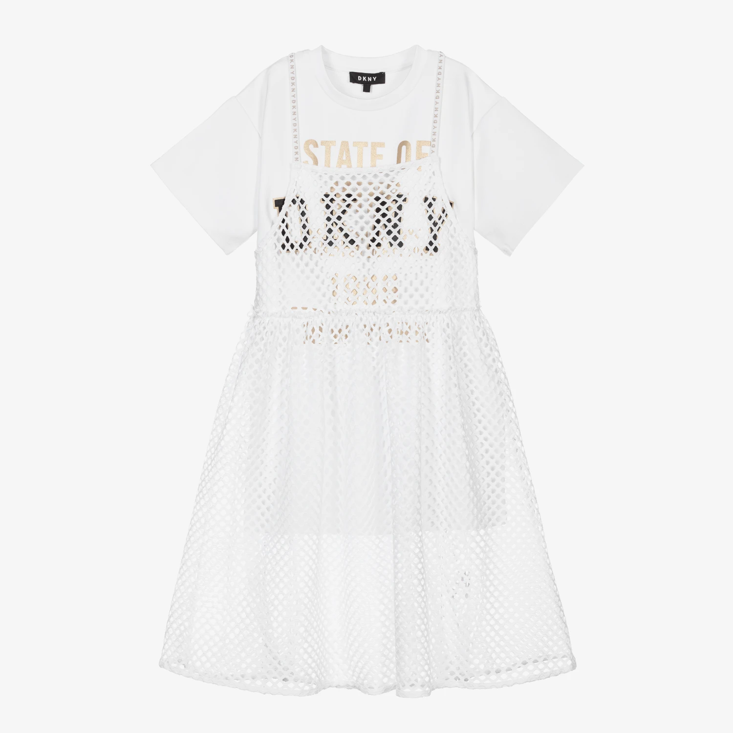 As seen in the main collection, teen girls white 2-in-1 dress by DKNY, made in thick viscose jersey with a polyester mesh overlay. The sporty T-shirt dress, printed with a black and gold ‘State of Mind’ logo, pairs with a mesh overlay dress with white and gold logo straps for a streetwear-inspired look.