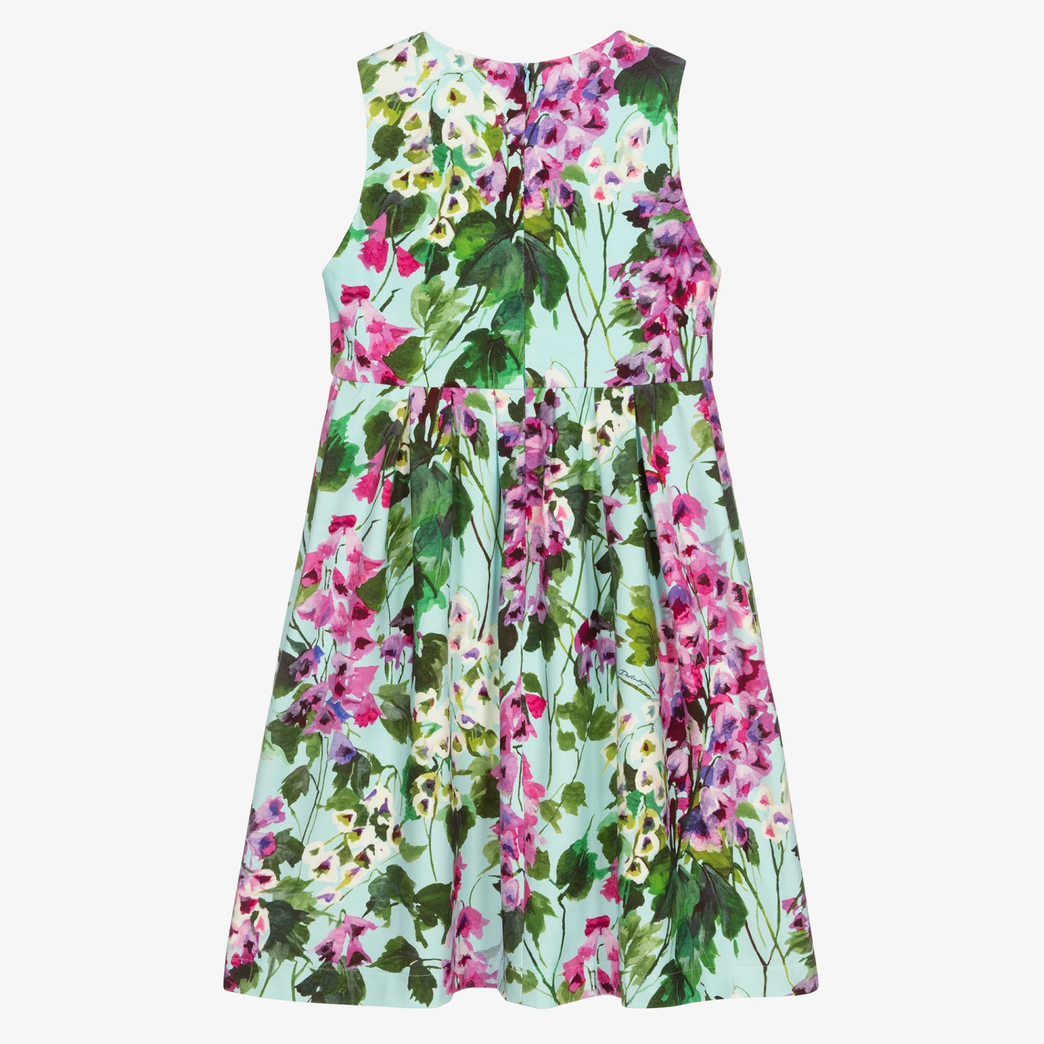 Pale blue floral cotton dress for teen girls by luxury Italian brand Dolce & Gabbana. Soft, stretchy and comfortable, there is a beautiful bellflower and subtle logo print in shades of purple, pink and green. This stylish sleeveless dress has a lightweight cotton lining on the bodice and a concealed zip on the back.