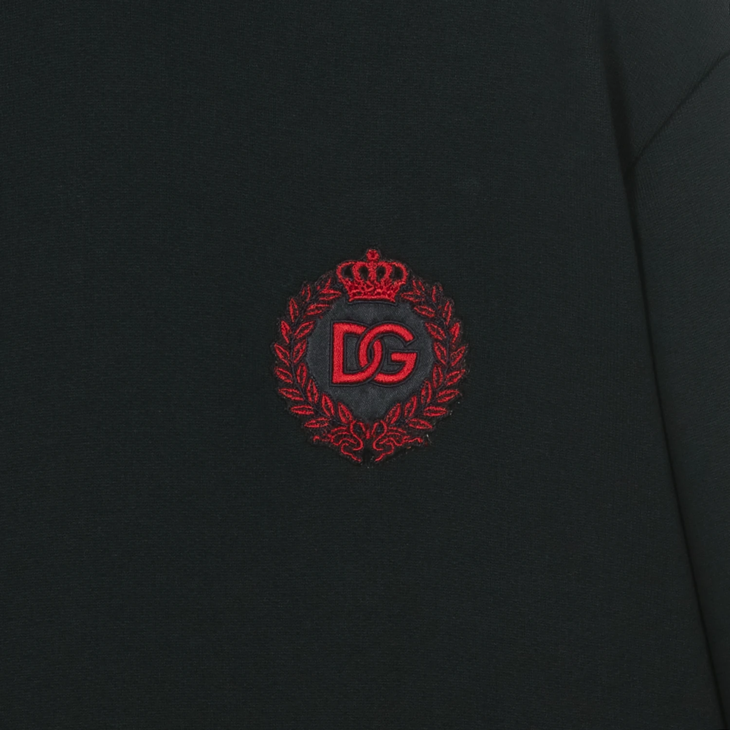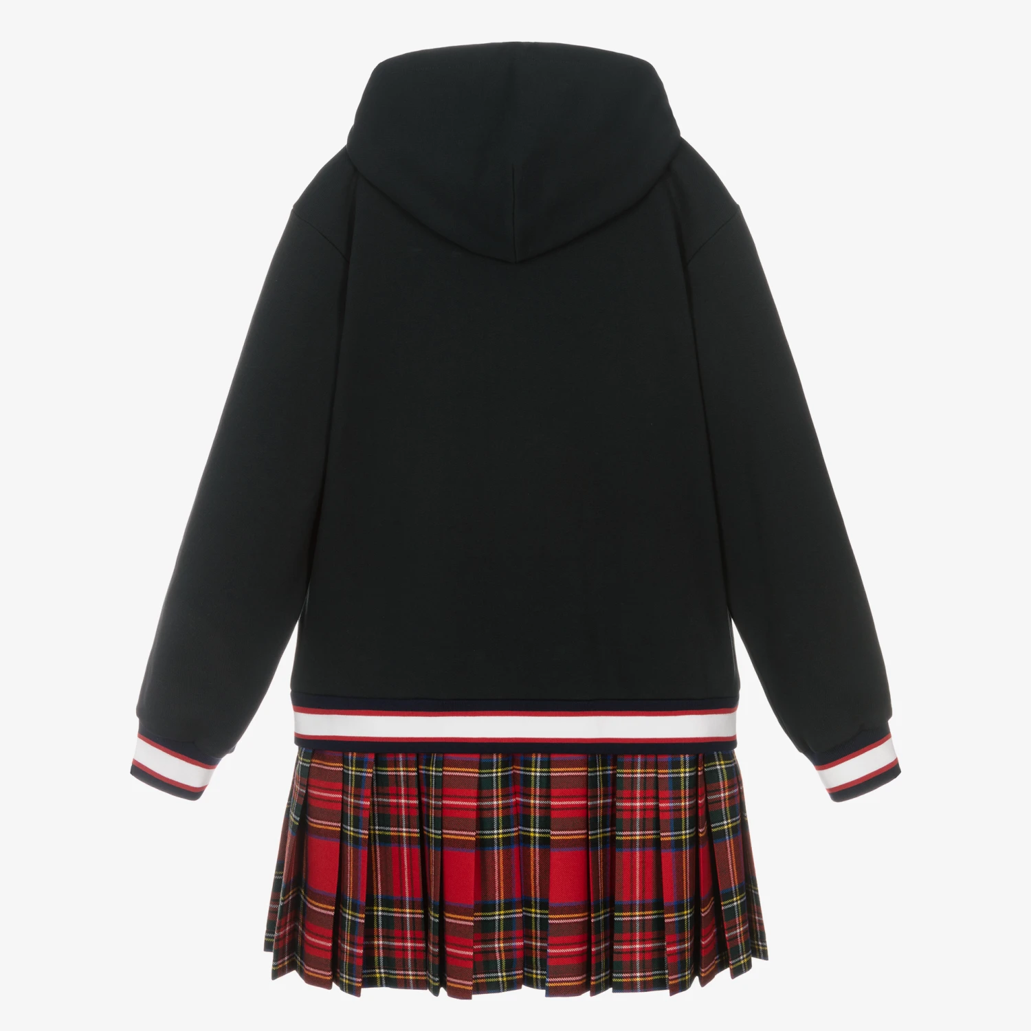 Navy blue hoodie dress for teen girls by luxury brand, Dolce & Gabbana. On the chest is an eye-catching red embroidered crest, featuring the designer’s crossover DG logo. Stylish and comfortable, it has a cotton jersey bodice and a dropped waist, with a pleated red tartan skirt in a soft cotton and wool blend. The ribbed cuffs and waistband are striped in red, white and blue.