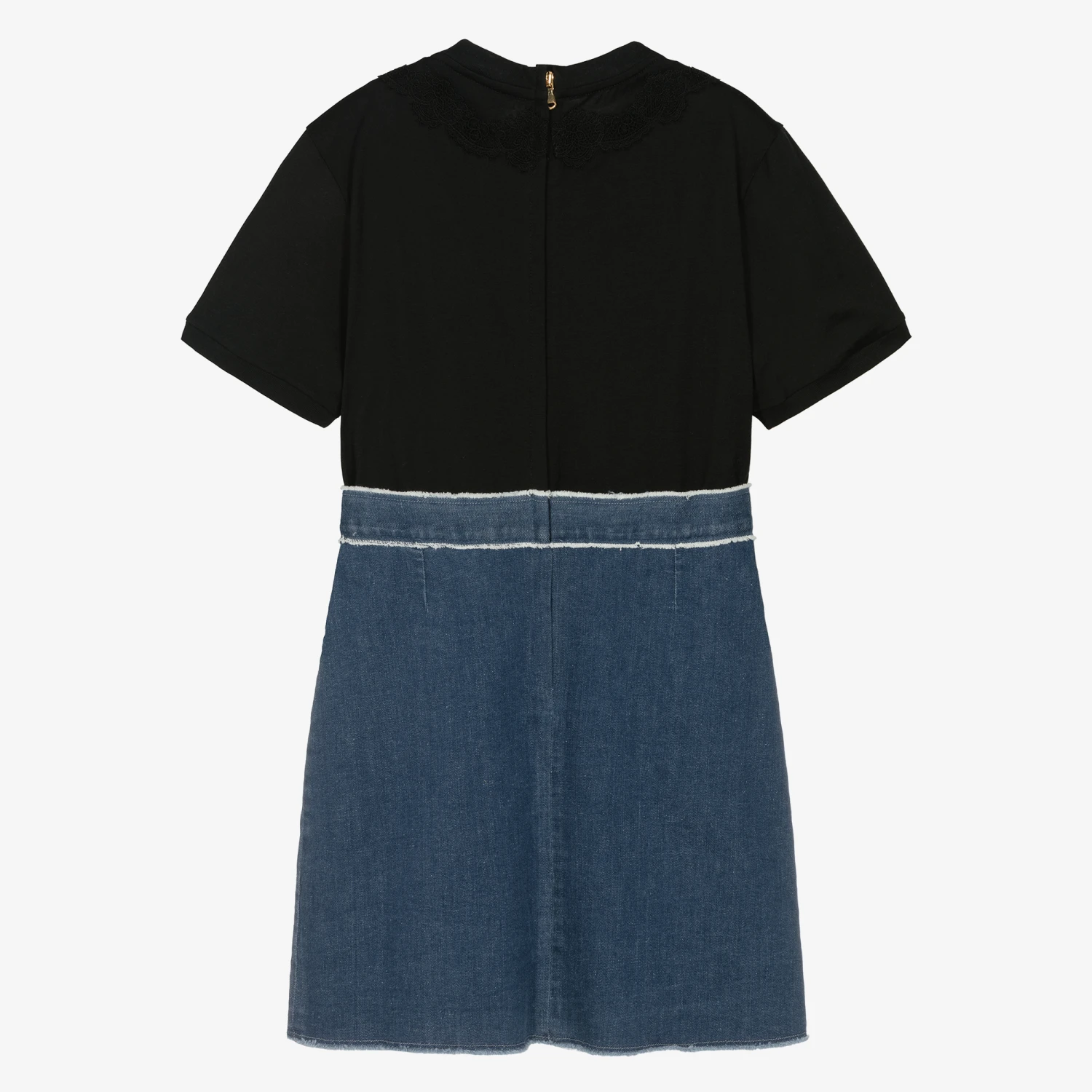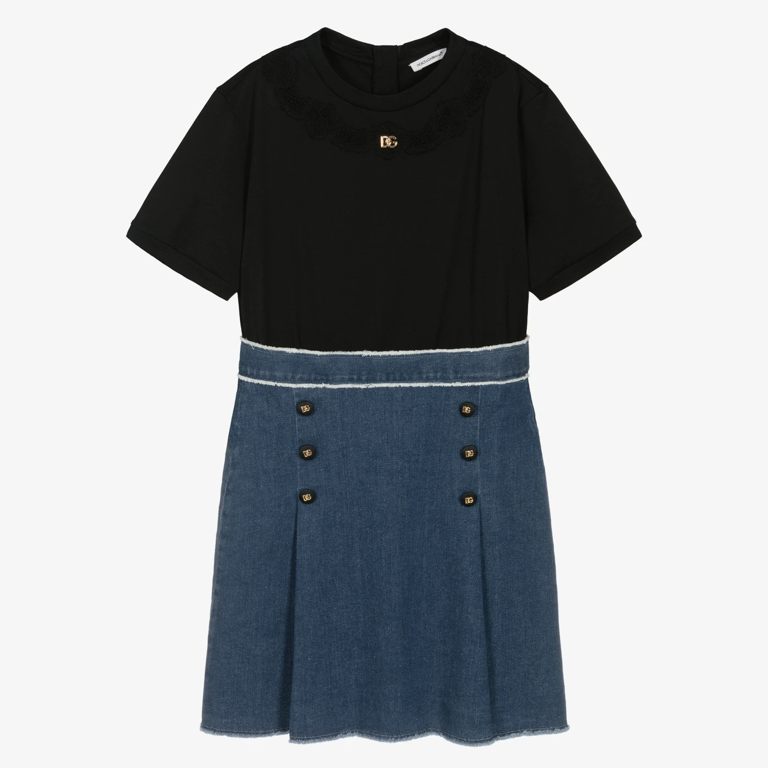 From luxury Italian brand Dolce & Gabbana, stylish dress for teen girls with gold crossover DG logo detailing for a designer touch. Made to look like a black jersey top tucked into a blue denim skirt, this fun dress fastens with a gold zip on the back for fuss-free dressing. This easy-to-wear cotton dress has tonal lace trim on the top, raw edges on the waist hem and pleats for a casual preppy look.
