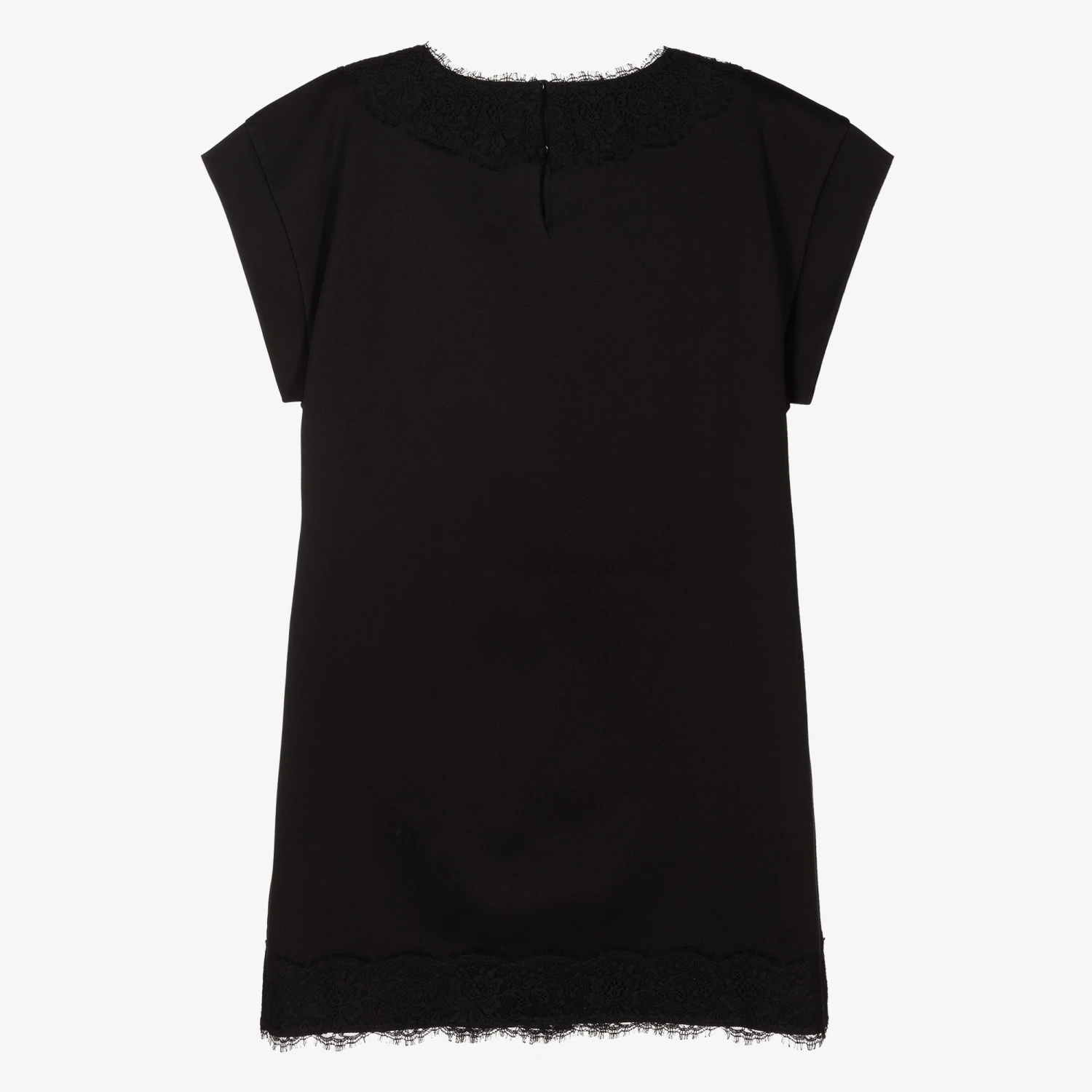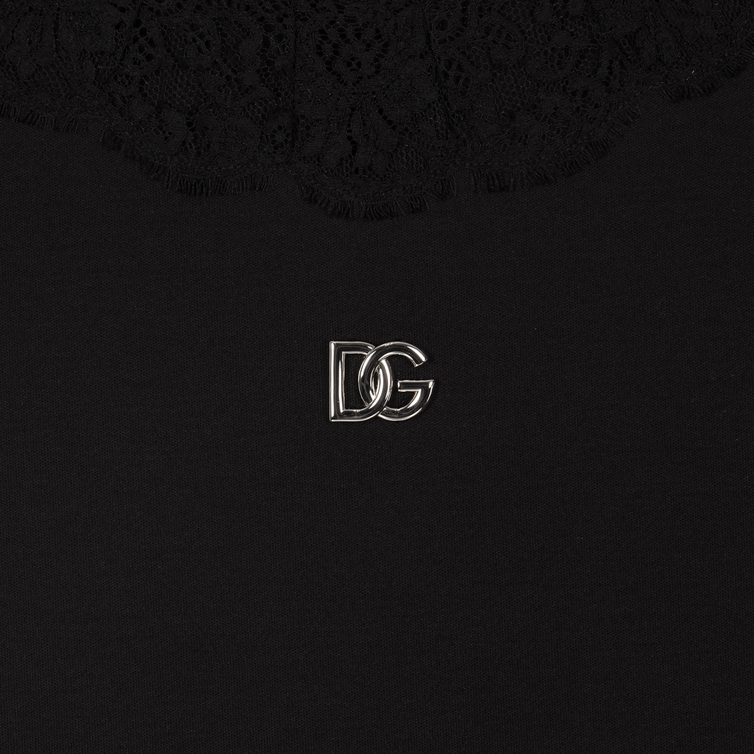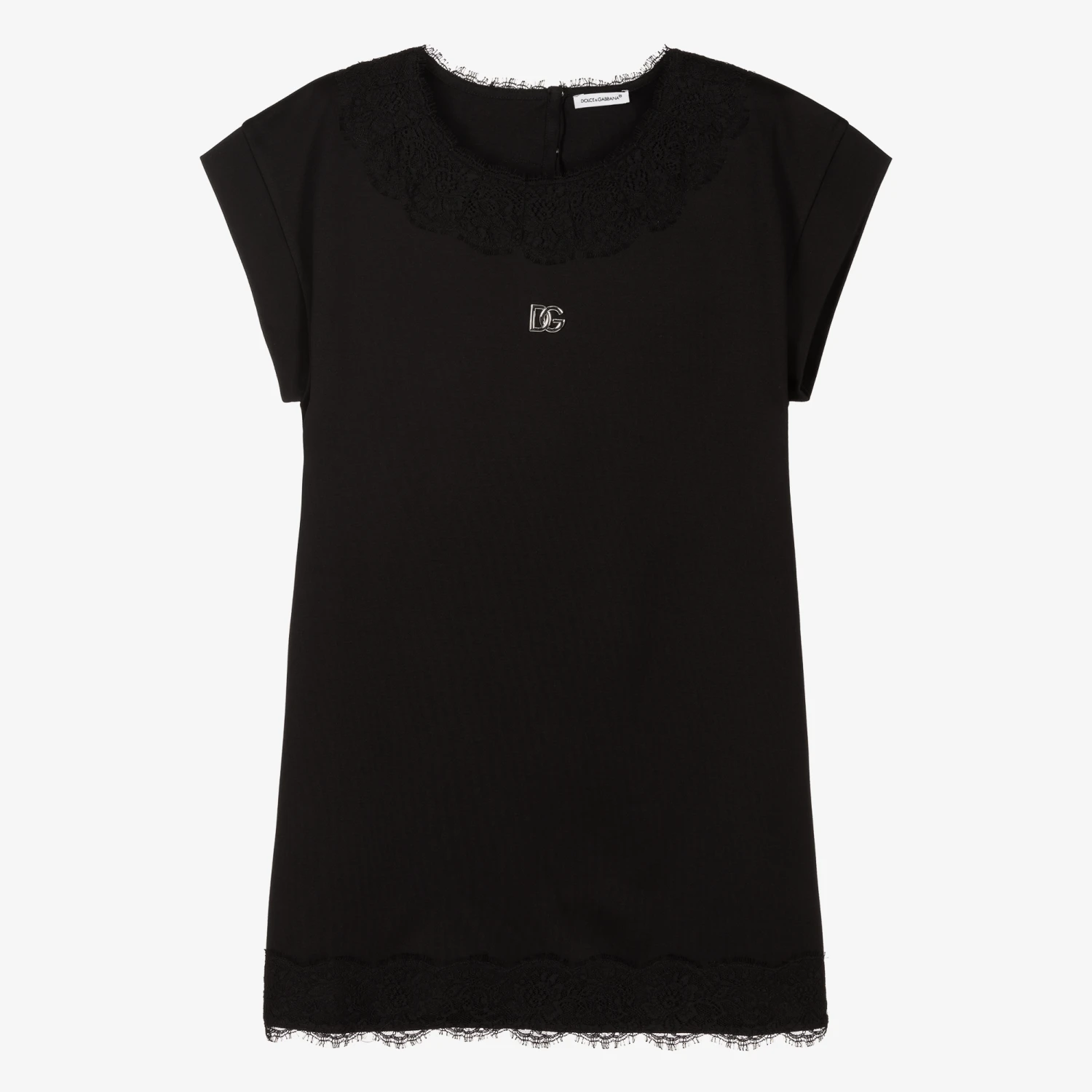 Black cotton jersey dress for teen girls by luxury Italian brand Dolce & Gabbana, with raw lace trims and a pewter crossover DG charm on the front. As seen in the main collection, this soft and stretchy dress has a boxy fit, and fastens with concealed poppers on the back.