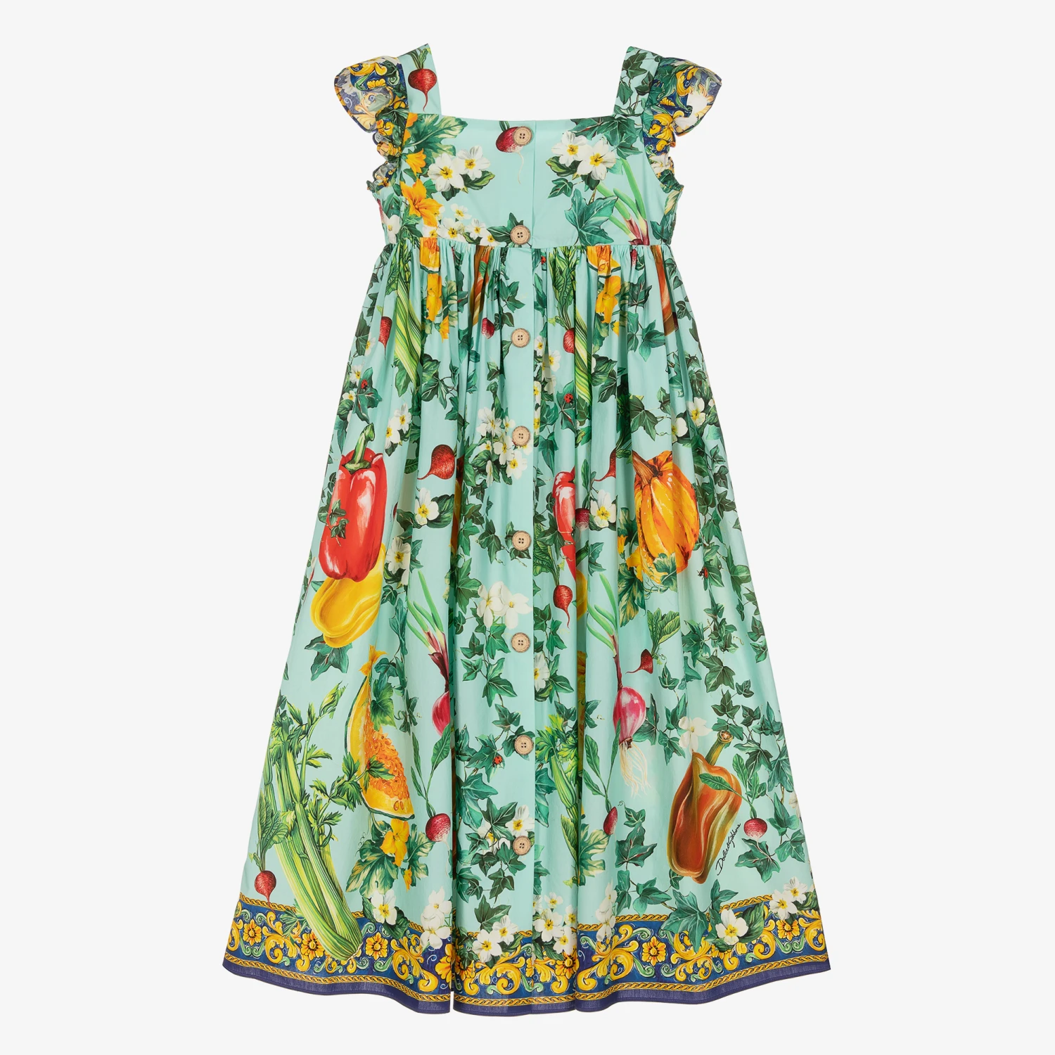 Infused in opulence, this aqua blue dress for teen girls is from luxury fashion house, Dolce & Gabbana. Reminiscent of the Sicilian garden, this dress is patterned in floral Mediterranean vegetables for an elegant farmer girl look. It is signed with the brand’s signature script logo throughout, adding a delicate designer touch. There is a square neckline with decorative rustic buttons, and royal blue trims in a gold acanthus leaf design. Beautifully ruched at the back, this lightweight cotton poplin dress fastens with a concealed zip fastening.