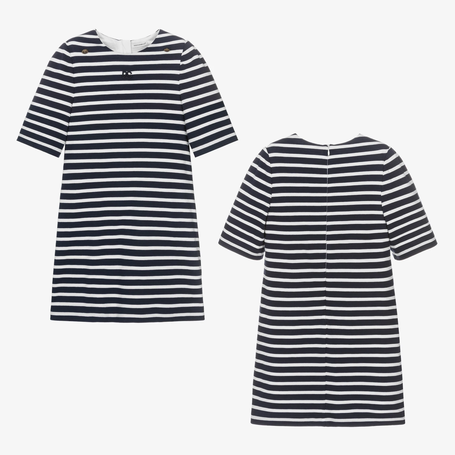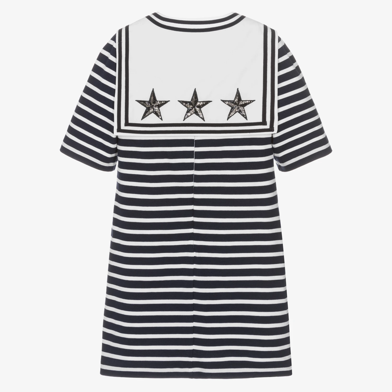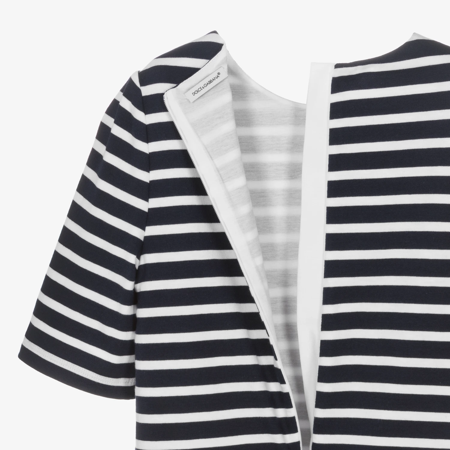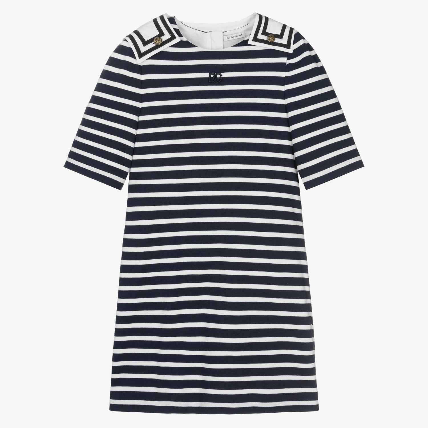 A timeless dress for teen girls by luxury brand Dolce & Gabbana, in a navy blue and white Breton stripe with the iconic crossover DG logo on the front. Made in soft cotton jersey, this sailor-style dress has a removable collar, embellished with sequin star appliqués for added style. Lined for added comfort, it has decorative gold buttons on the shoulders and longer length sleeves for a classic, nautical look.