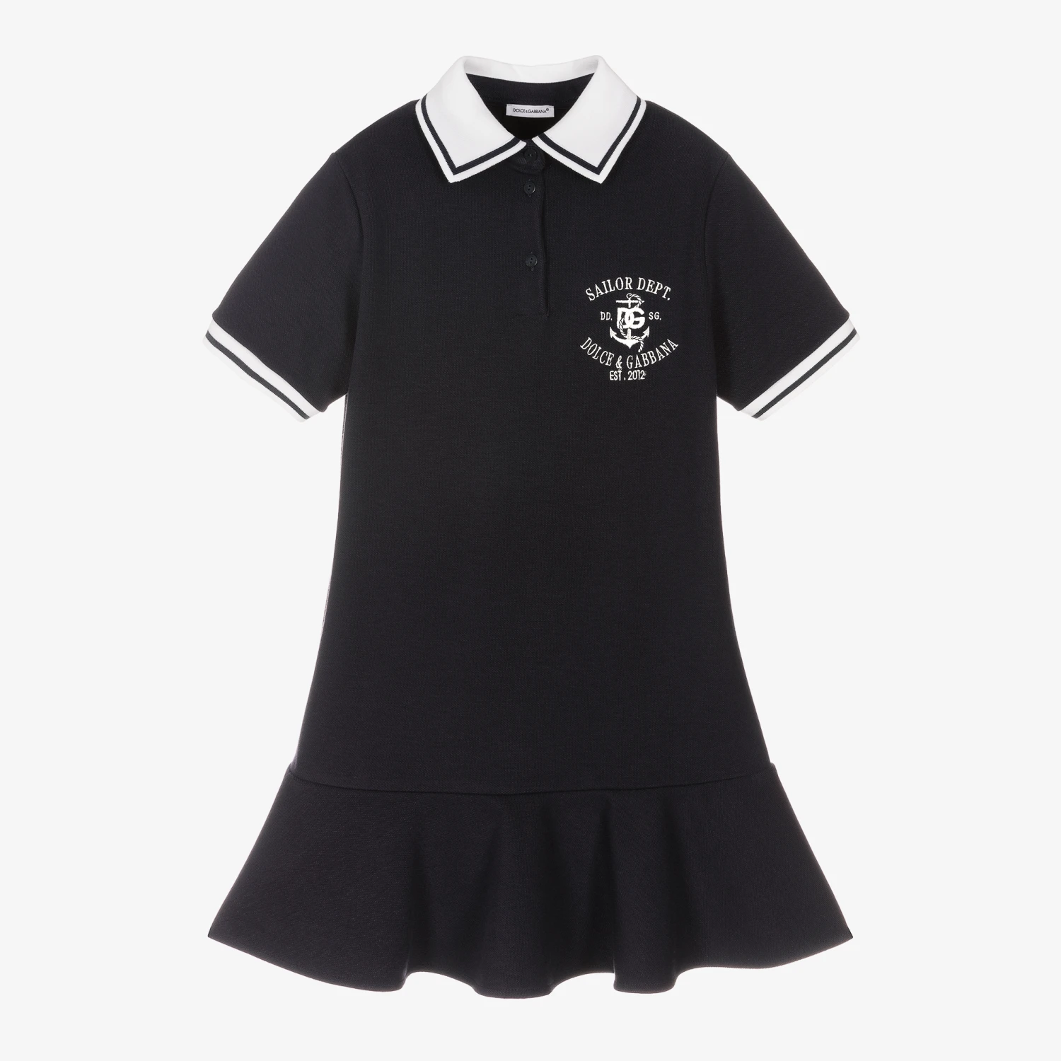 Lovely navy blue nautical-inspired polo dress for teen girls, by Italian designer Dolce & Gabbana, with a white anchor logo embroidery on the chest. This sailor dress has a white ribbed collar and cuffs with a navy blue stripe. Smart and styled with timeless elegance, it has a pretty ruffled hem for a feminine silhouette. For that added luxurious feel, it is made from super soft viscose blend piqué with branded button fastening.