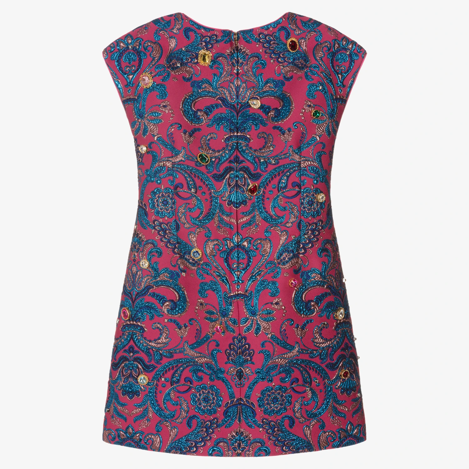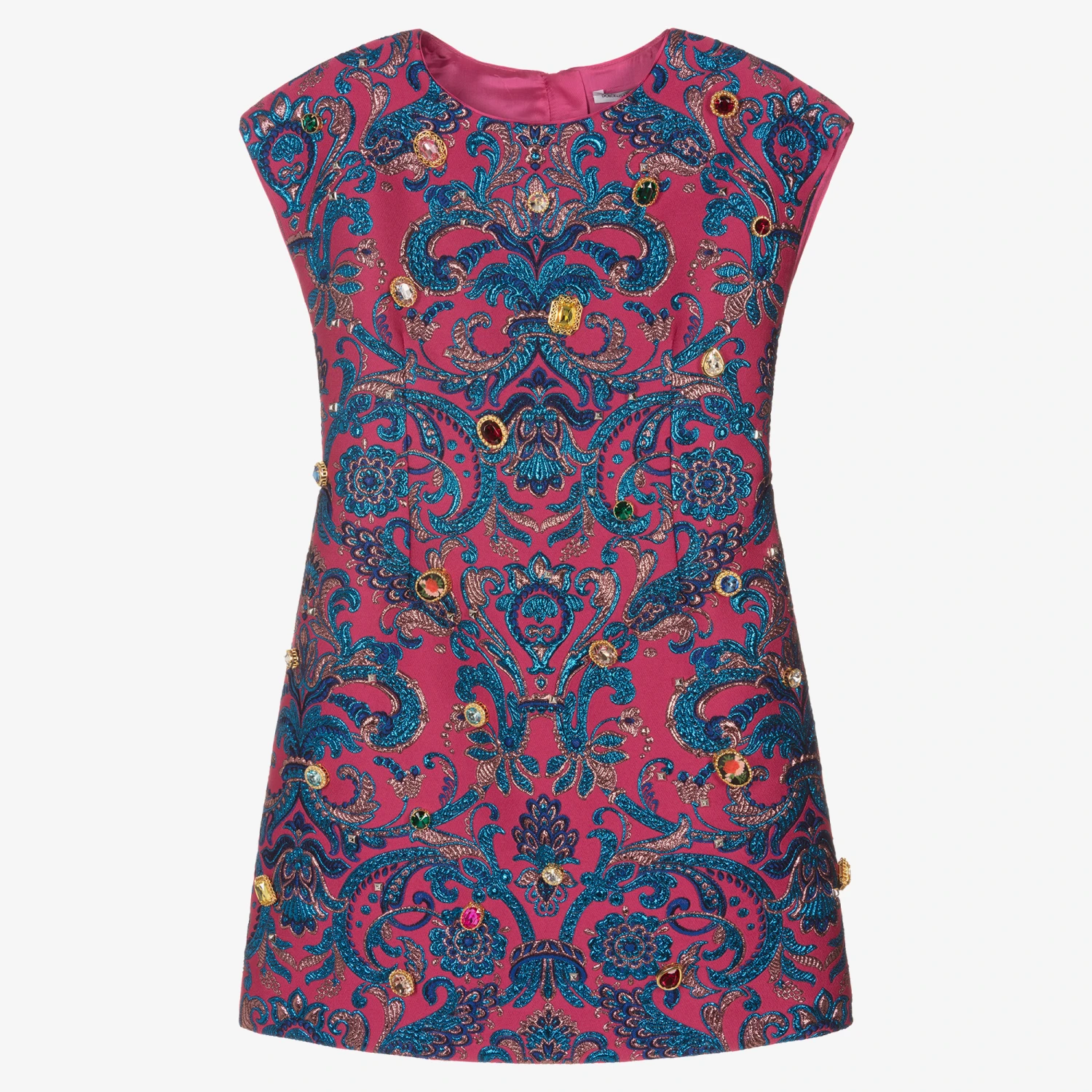 Teen girls Mini-me pink and blue lurex jacquard dress by Dolce & Gabbana. This stunning design is woven in a vibrant silk blend, with a bright metallic blue floral pattern, embellished with jewel cabachons, studs and cameos. There is a zip on the back to fasten and it is fully lined in silky viscose satin.