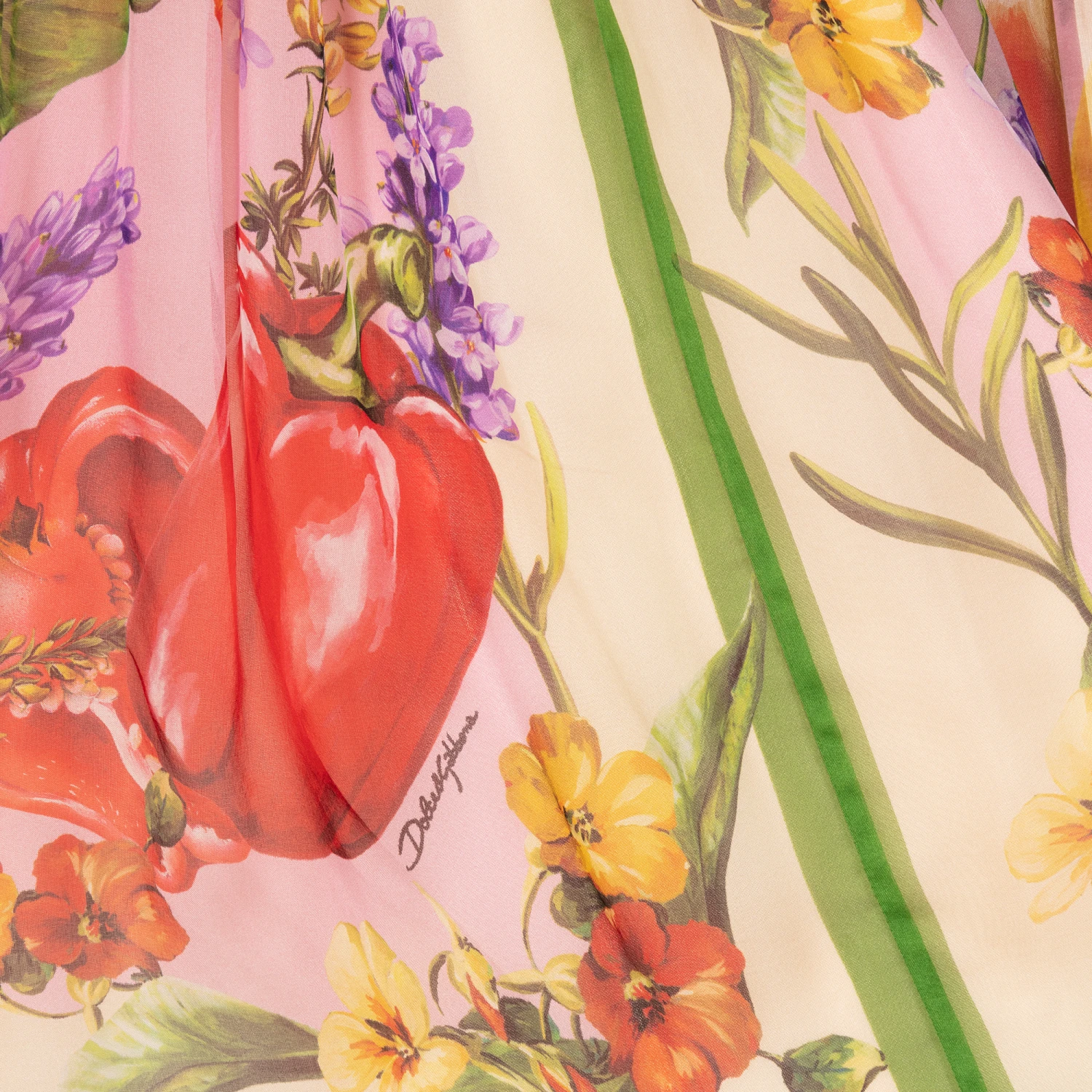 So beautiful for teen girls, this pink dress from luxury Italian designer Dolce & Gabbana, is made from the finest silk chiffon. Inspired by the charming Sicilian garden, it features vibrant vegetable and floral prints in a striking colourful pattern. For timeless elegance, this statement dress has a ruffled neckline, sheer puffed sleeves and a ruched, ruffled waist. It is fully lined for comfort and fastens with a concealed zip on the back for a neat finish.
