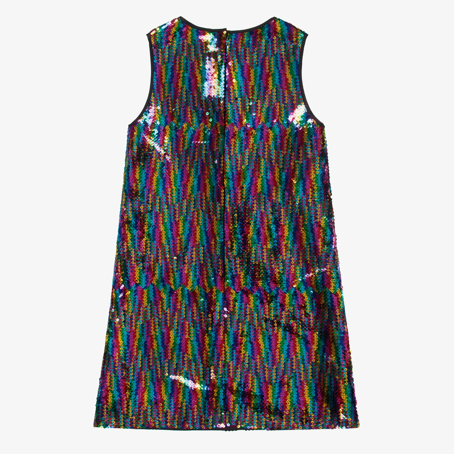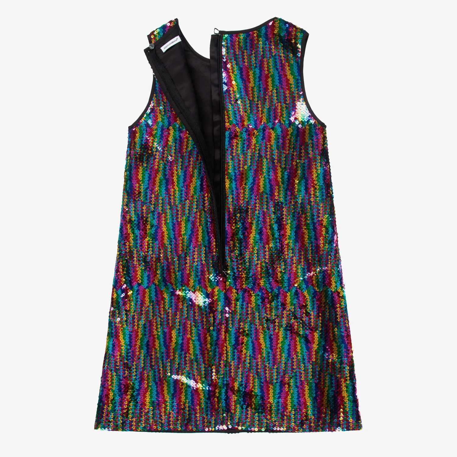 Stunning sleeveless shift dress for teen girls from Italian luxury brand Dolce & Gabbana, made in soft satin. With a gold crossover DG logo charm on the bodice, it has a show-stopping multi-coloured sequin design that shimmers in the light. Fully lined in soft viscose satin, it fastens with a concealed zip on the back.