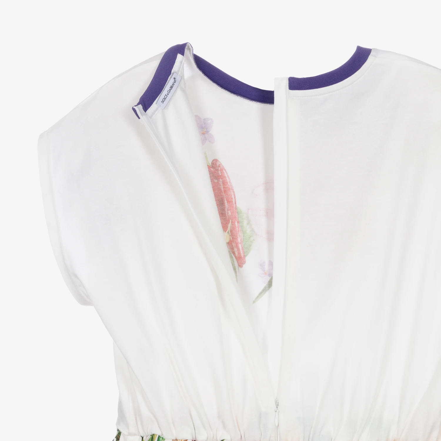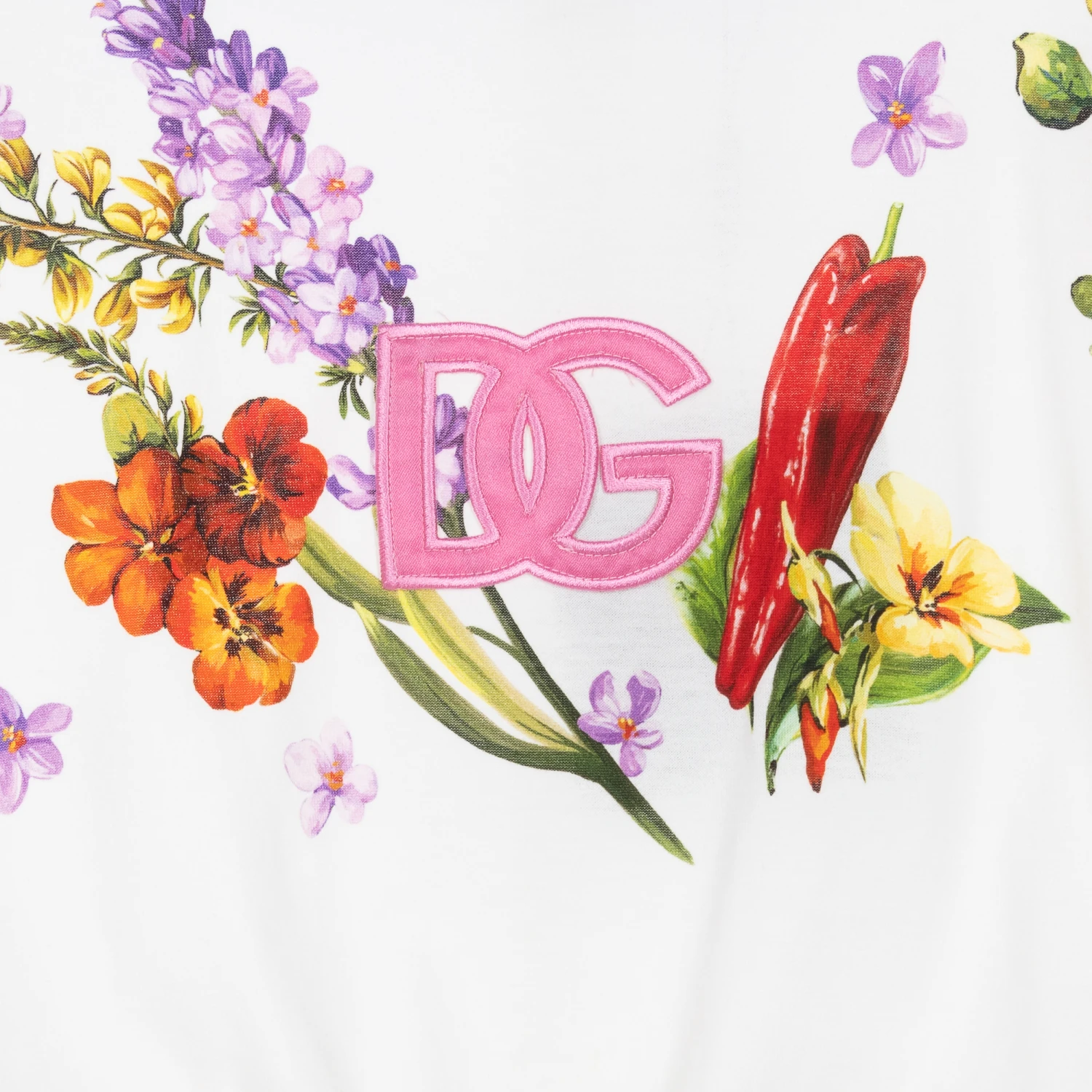 From luxury Italian brand Dolce & Gabbana, a white dress for teen girls with a colourful vegetable and floral print inspired by Sicilian gardens, and a pink crossover DG logo patch on the front. This fashion-forward dress has a cotton jersey top and a smooth poplin skirt with a cut-out middle. A concealed zip fastening on the back makes dressing fuss-free with a neat finish.