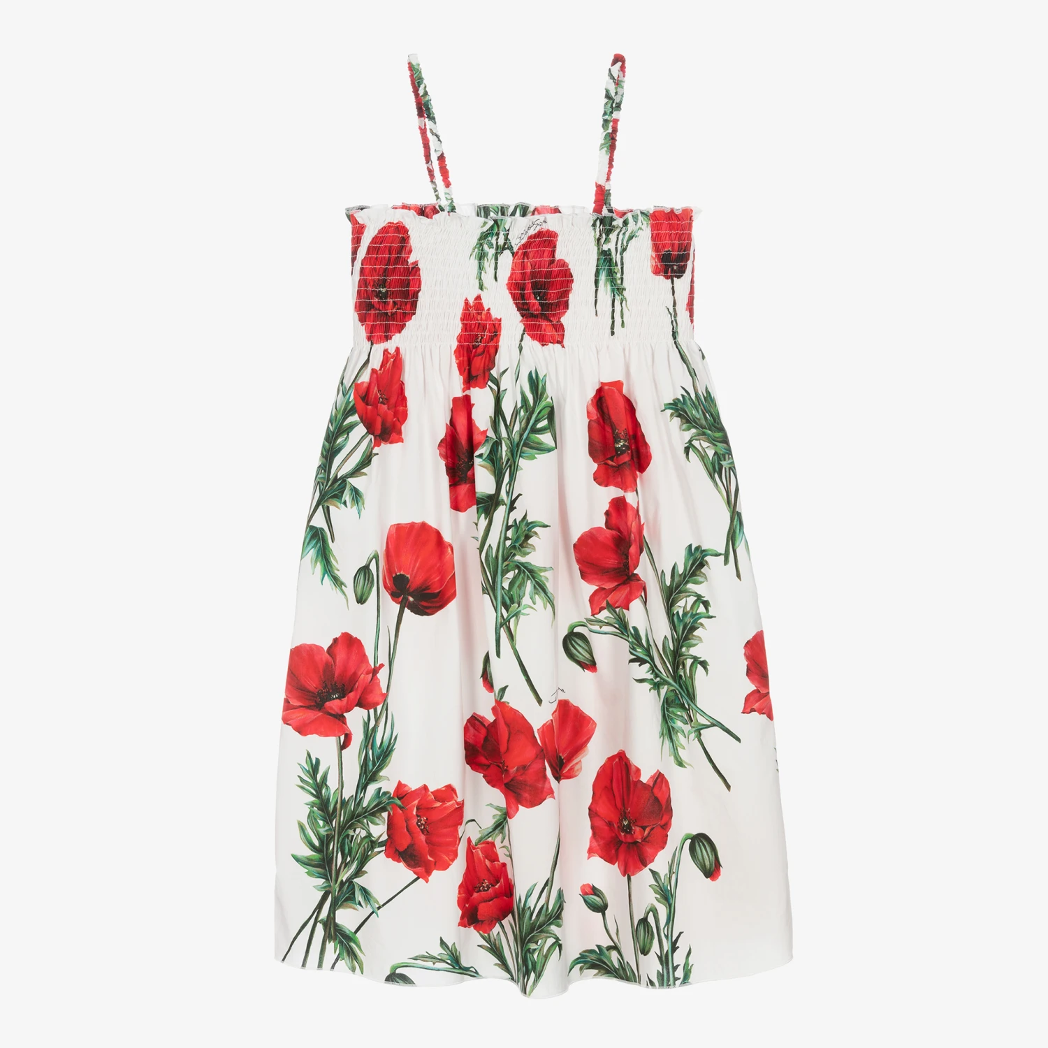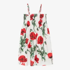 White cotton poplin sundress for teen girls by luxury Italian brand Dolce & Gabbana. Strikingly beautiful, it is patterned with red and green poppy flowers and small script logos, delicately blended into the pattern for a subtle designer flair. It has a pretty, shirred panel around the chest and stretchy straps for comfortable wear on the shoulder.