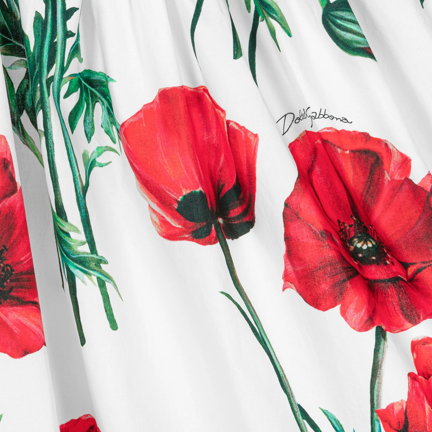 Blooming in sophistication, this white dress for teen girls is from luxury brand, Dolce & Gabbana. It is patterned in the brand’s iconic red poppy floral design, with a delicate script logo printed throughout. A bold black crossover DG logo is printed on the jersey bodice for a distinctive designer look. This dress is made from the softest cotton, with a paperbag-style poplin skirt and a concealed zip fastening on the back.