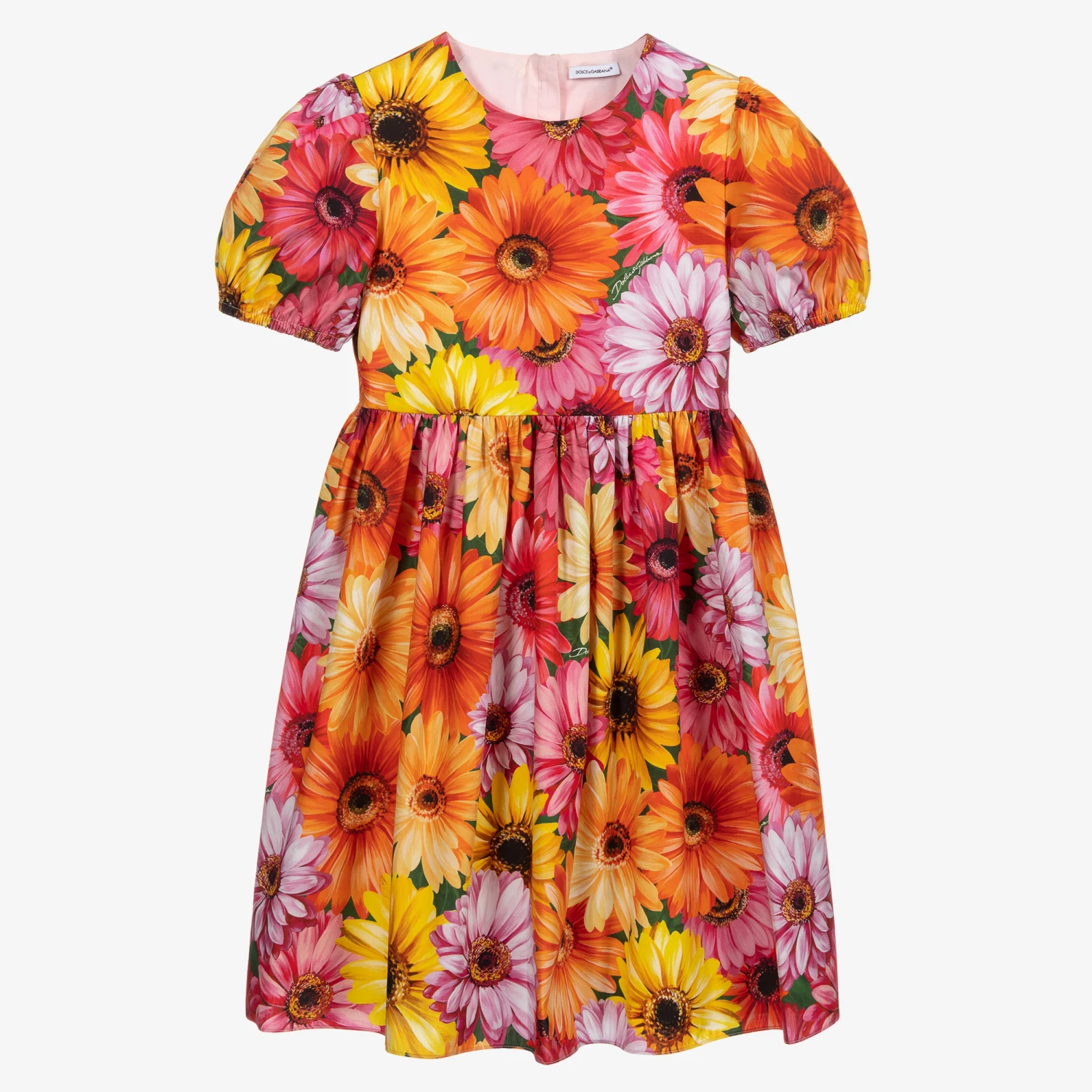 Teen girls orange and pink summer dress, by luxury Italian brand Dolce & Gabbana, patterned with the iconic Gerbera print. Lightweight and floaty this effortless cotton dress has puffy sleeves and is cut just below the knee. It fastens continently with a concealed zip on the back.