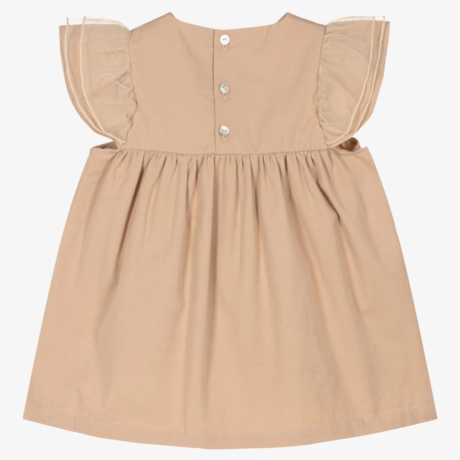 Dark beige dress for baby girls by Donsje, beautifully handmade in soft and lightweight organic cotton twill. A simple classic style, it has pretty flutter sleeves with layers of ruffled tulle, and a full gathered skirt. The brand’s embroidered logo tab is on the front hem and the dress fastens with mother-of-pearl buttons on the back.