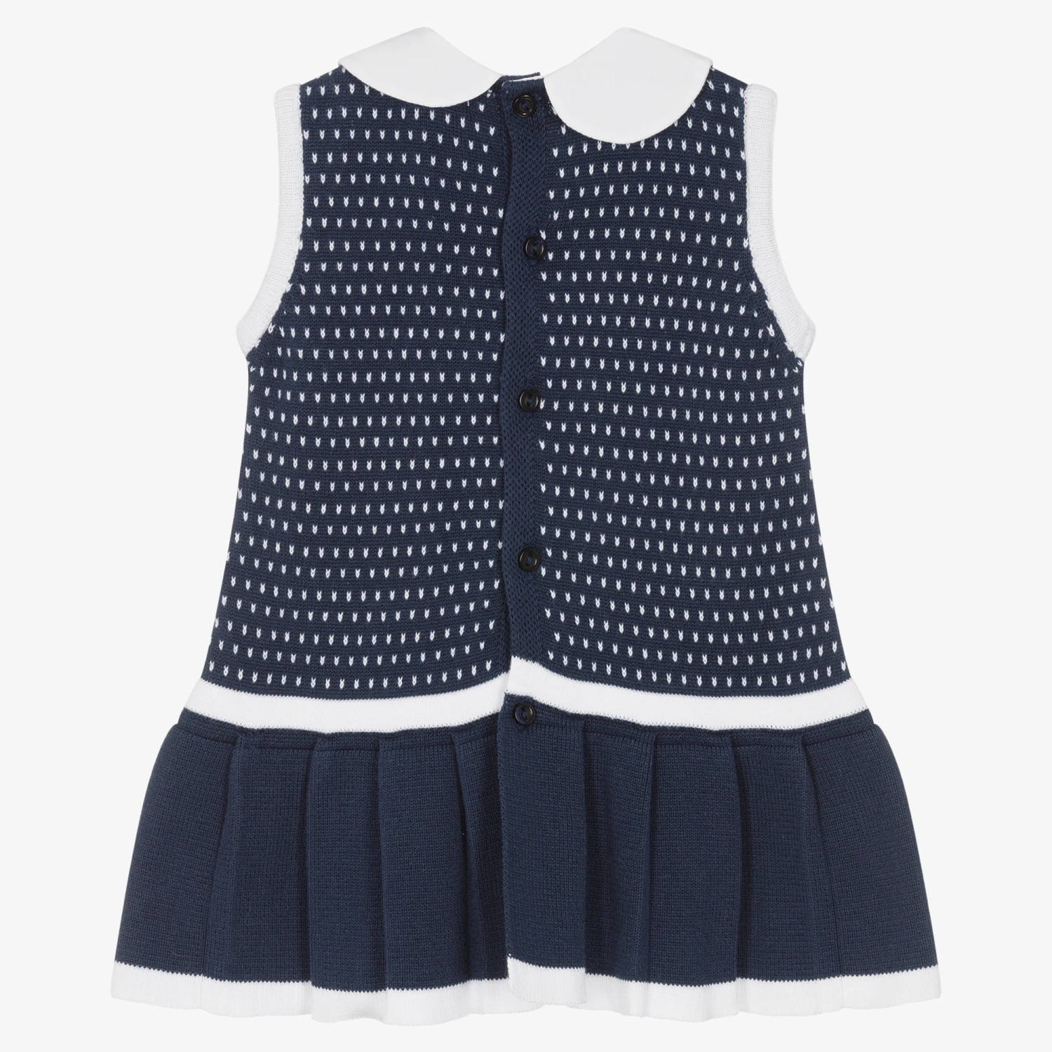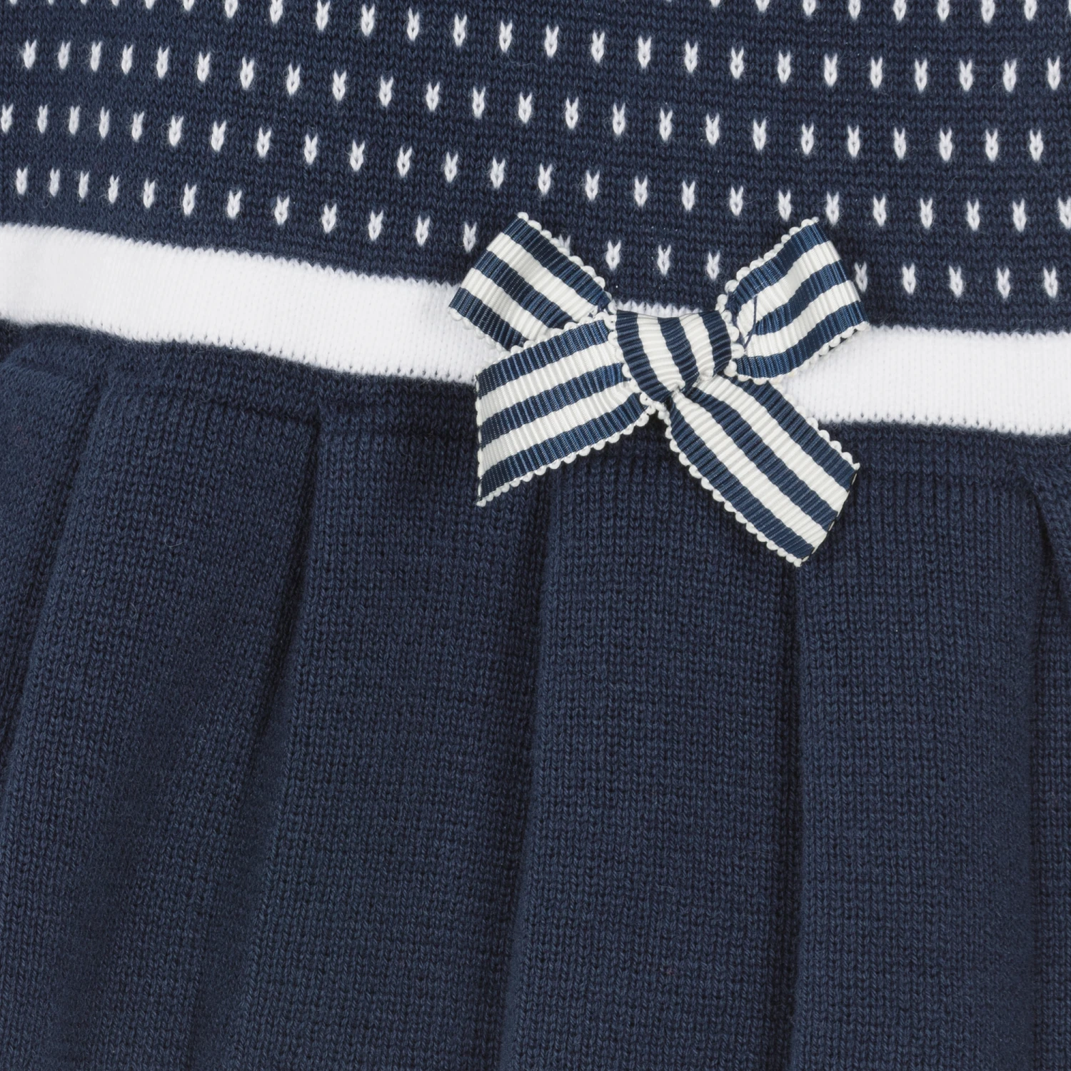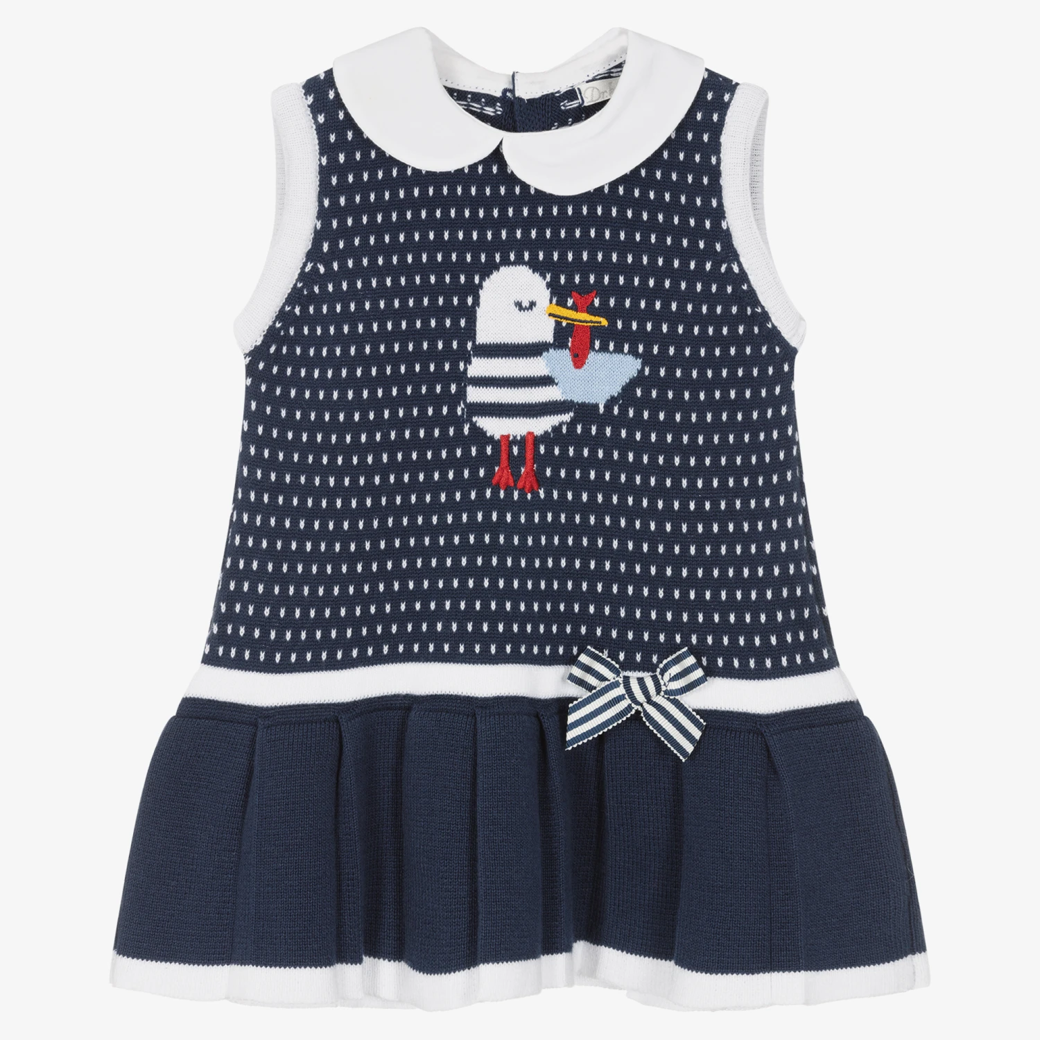 Pretty navy blue and white dress for baby girls by Dr. Kid, knitted in soft cotton. The bodice has a white poplin collar, white spots and a sweet intarsia seagull with embroidered detailing. There is a stiped grosgrain ribbon bow on the dropped waist, with a pleated skirt below. It fastens on the back with buttons and comes with useful, coordinating, striped knickers.