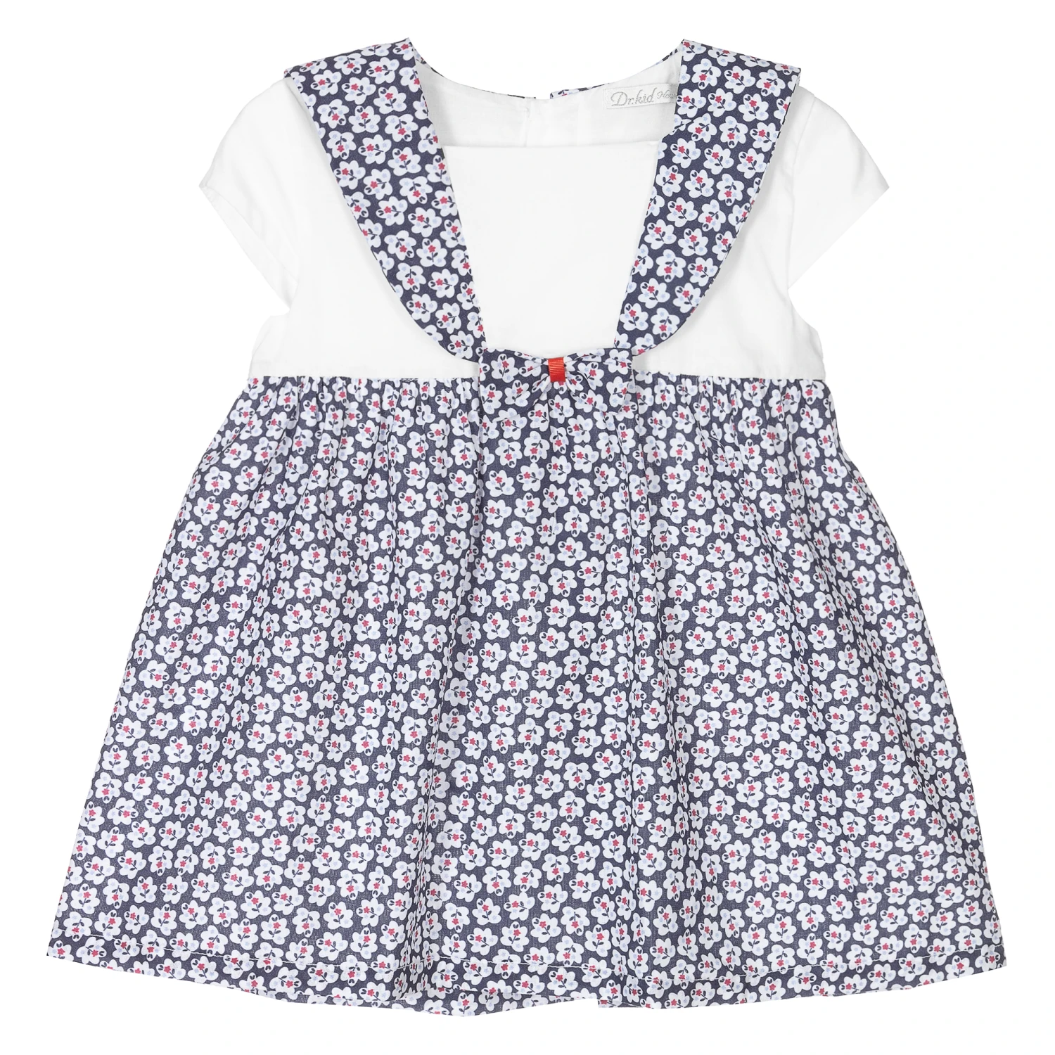 So pretty for baby girls, a navy blue and white dress set from Dr. Kid, made in lightweight cotton. The navy blue dress has a pretty floral pattern in white, blue and red. The white bodice has a sailor-style collar and there are button fastenings on the back. The matching knickers are gently elasticated.