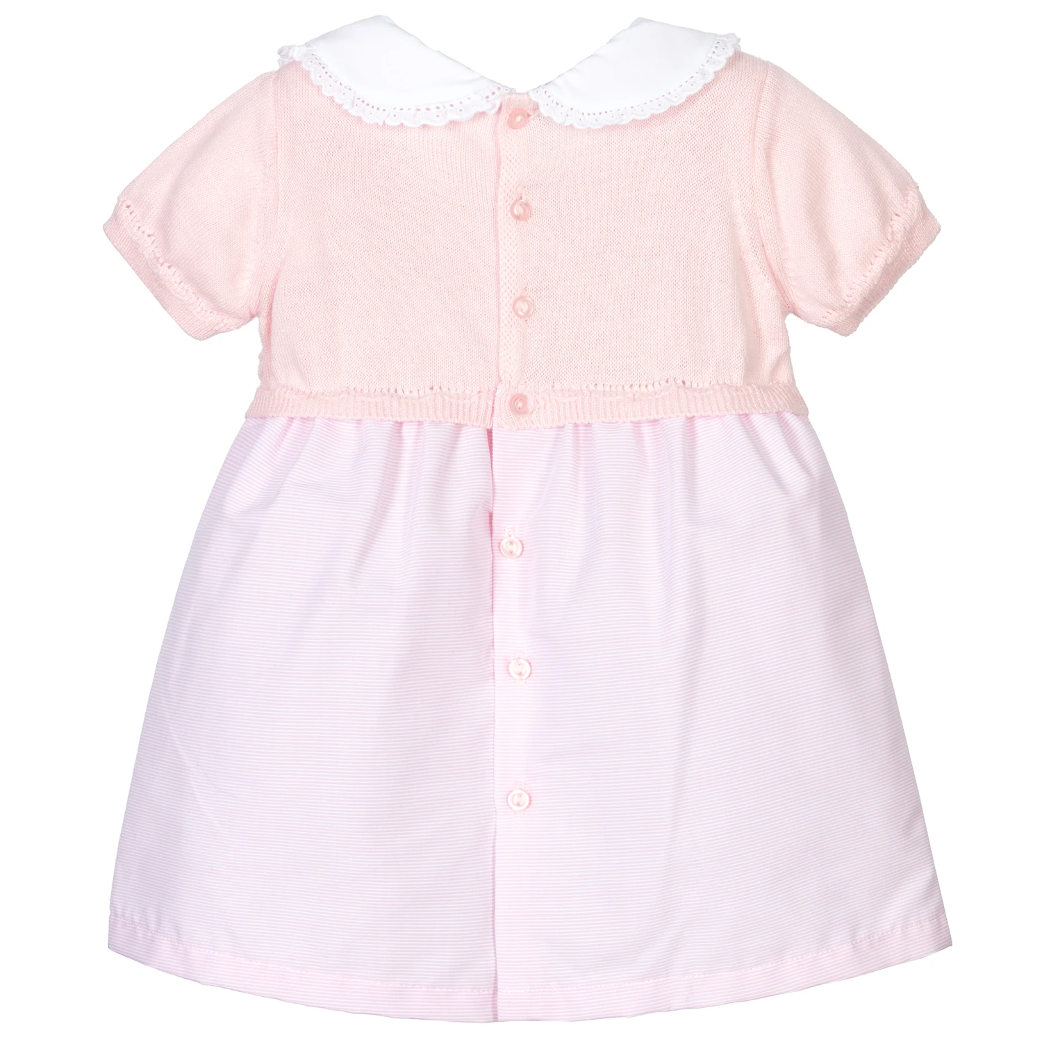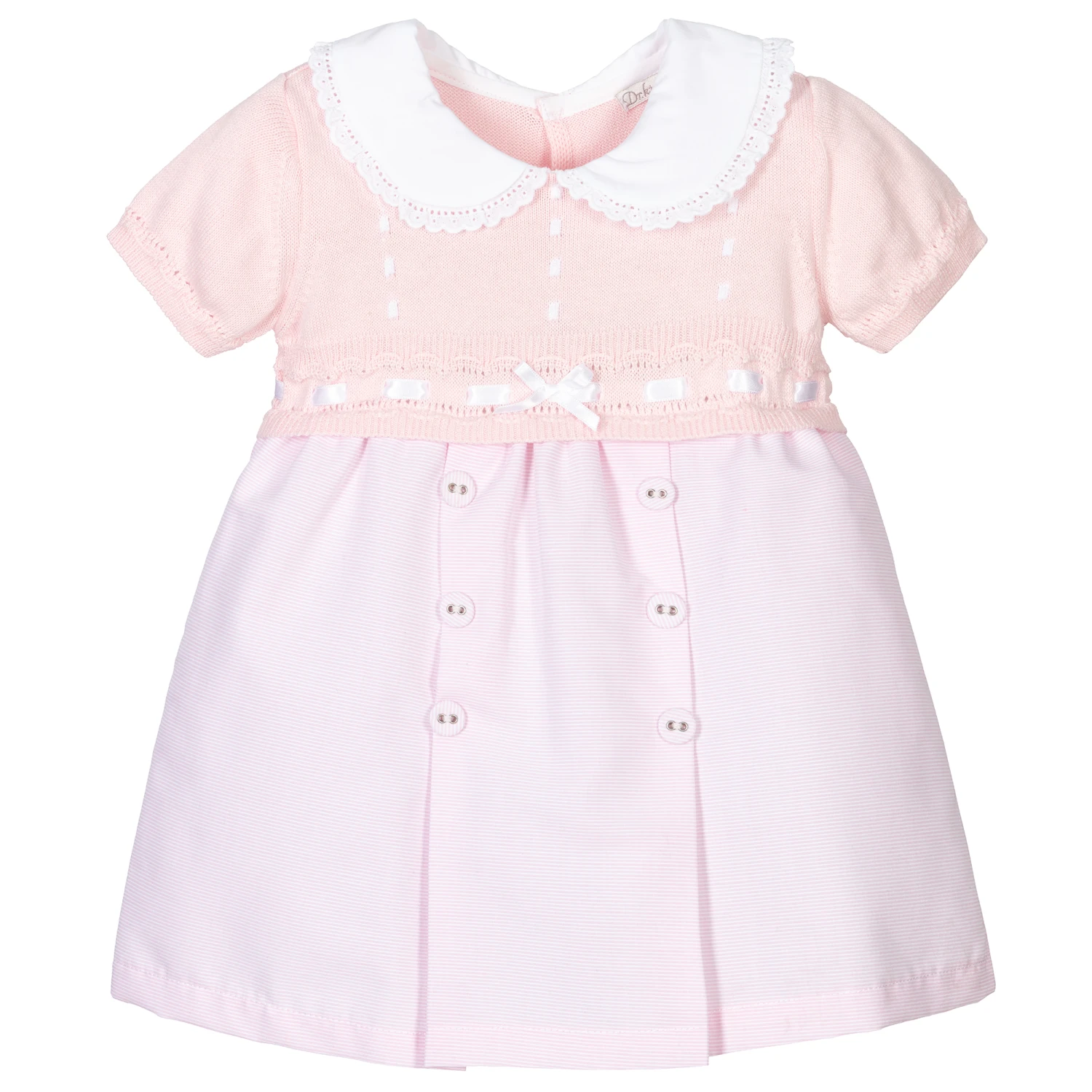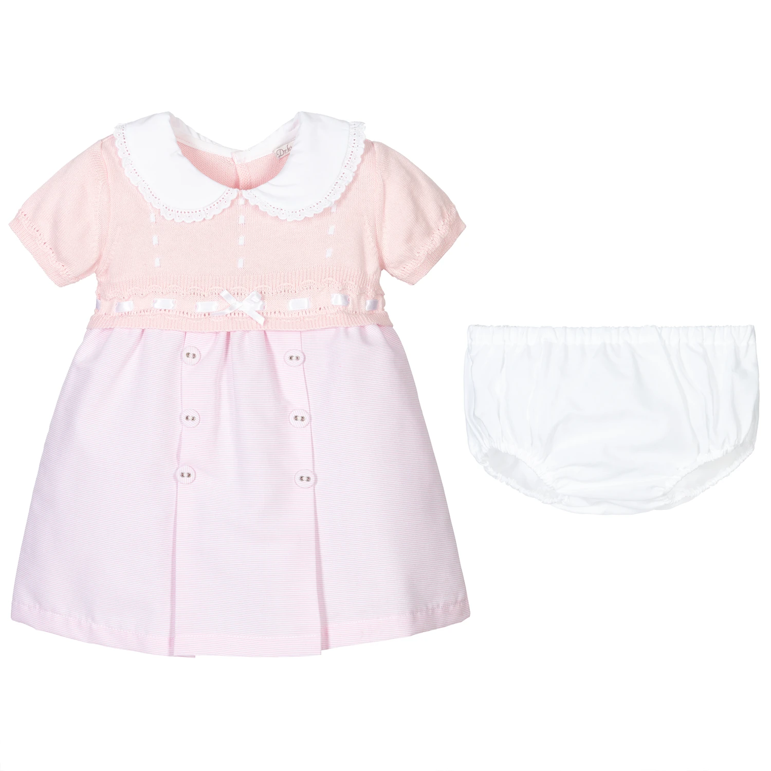 A lovely dress and knickers set for baby girls by Dr. Kid. The pink dress has a softly knitted cotton bodice, with white satin ribbon trim. It has a white woven collar, edged in pretty broderie anglaise. The finely striped skirt has a pleated panel on the front, with decorative buttons. A pair of white cotton knickers completes the outfit.