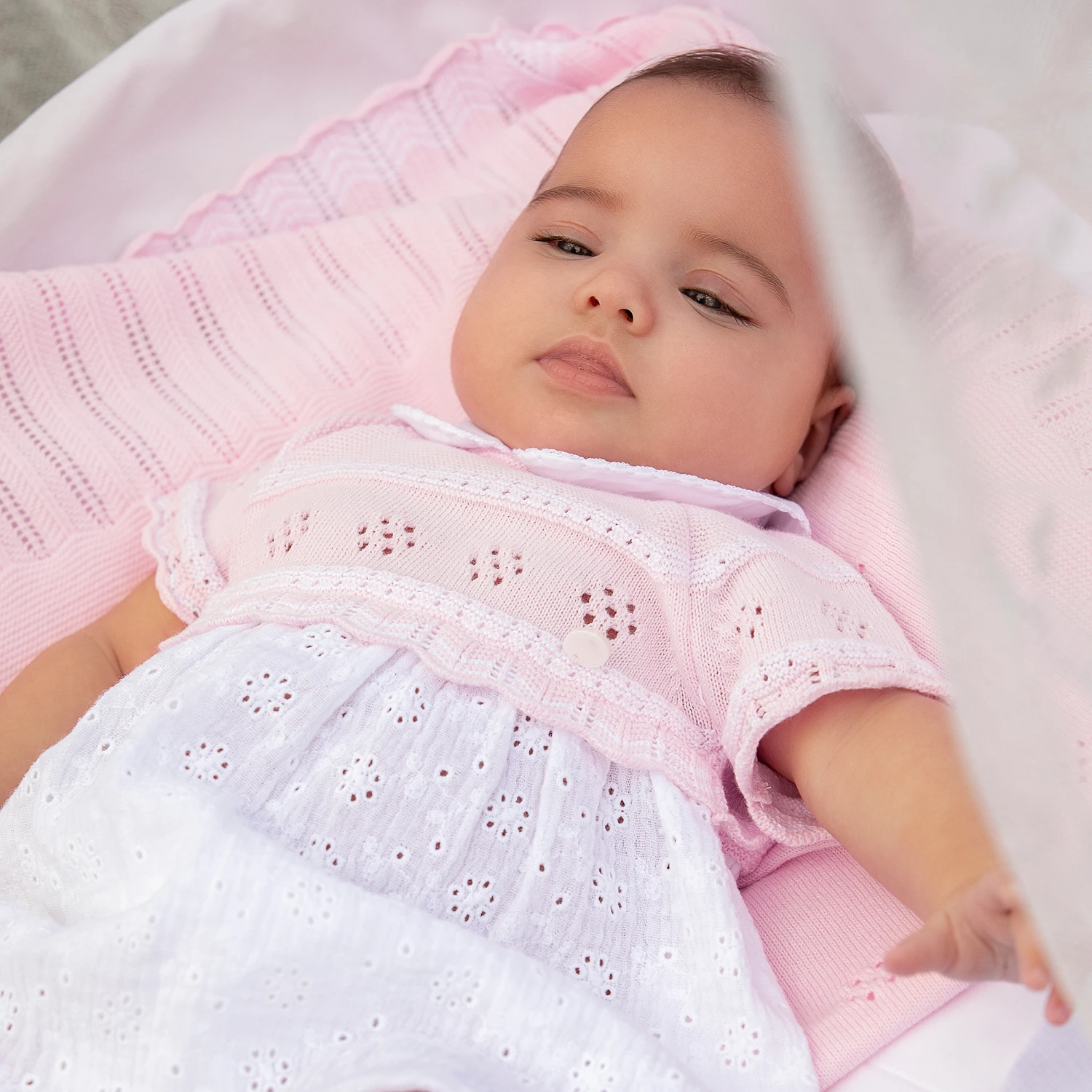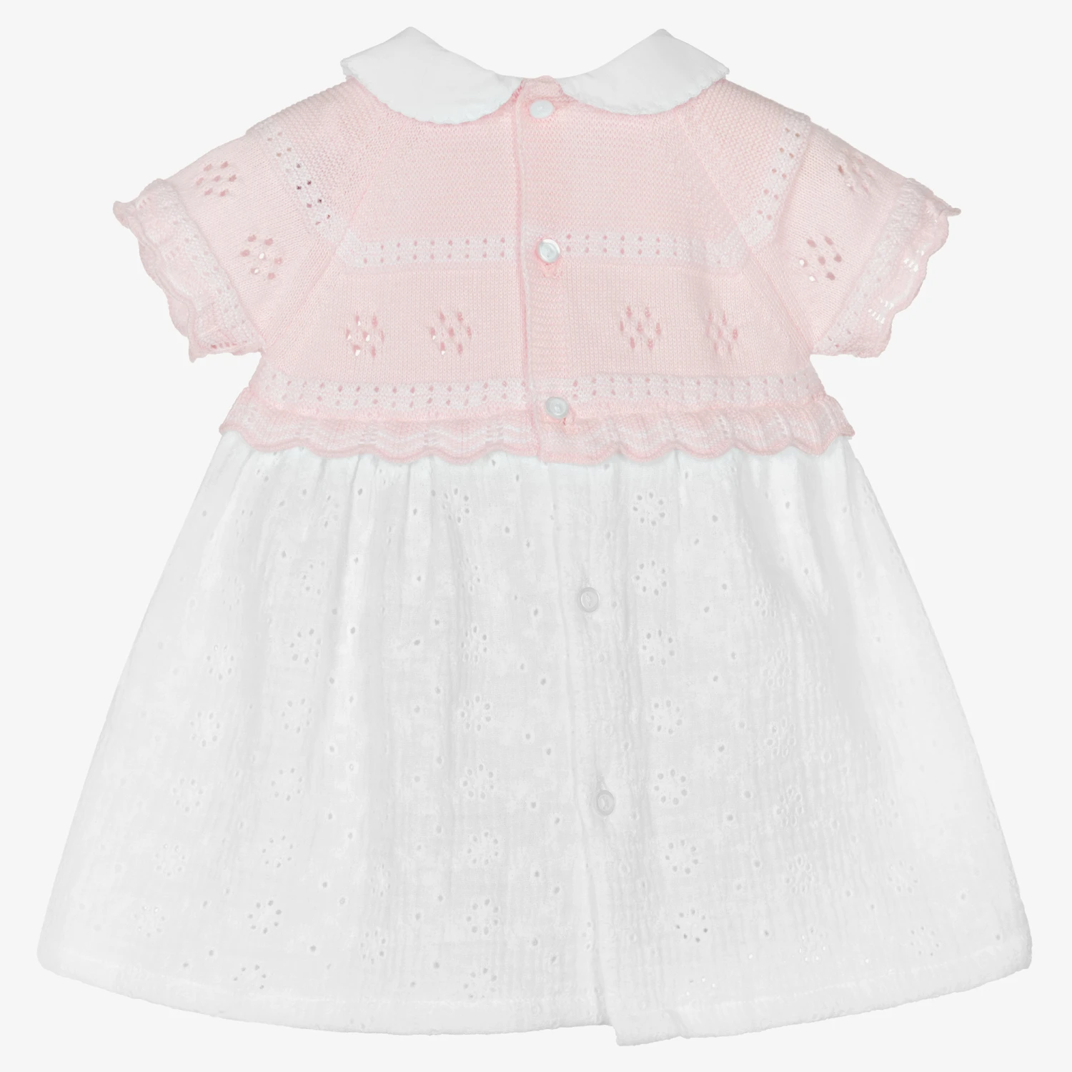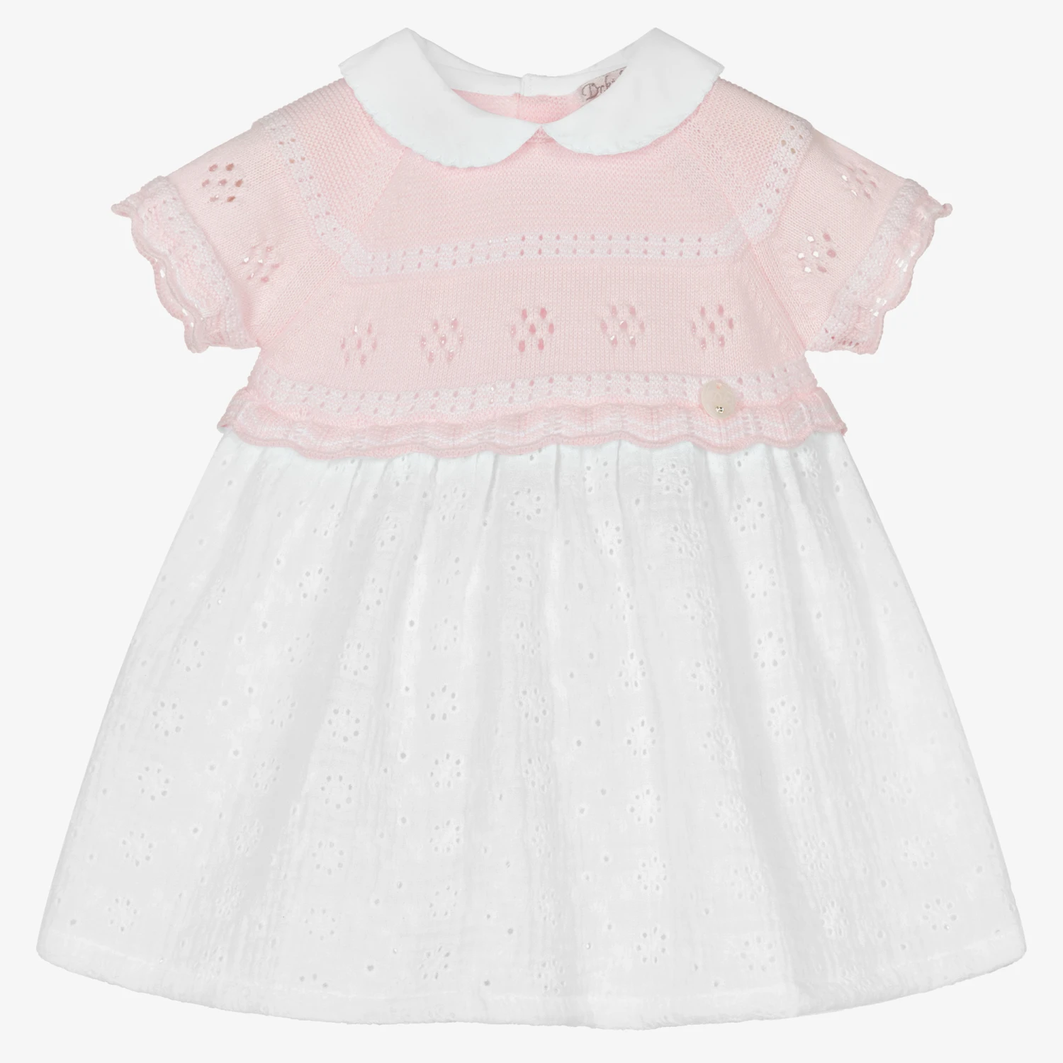Soft and comfortable for baby girls, this pretty pink and white cotton dress is by Dr. Kid. The bodice is in a fine pointelle knit with beautiful scalloped edges, and the broderiie anglaise skirt is made in lightweight cheesecloth. There is a sweet Peter Pan collar and back button fastenings. The dress comes with a pair of white cotton voile knickers that are gently elasticated around the waist and leg openings.