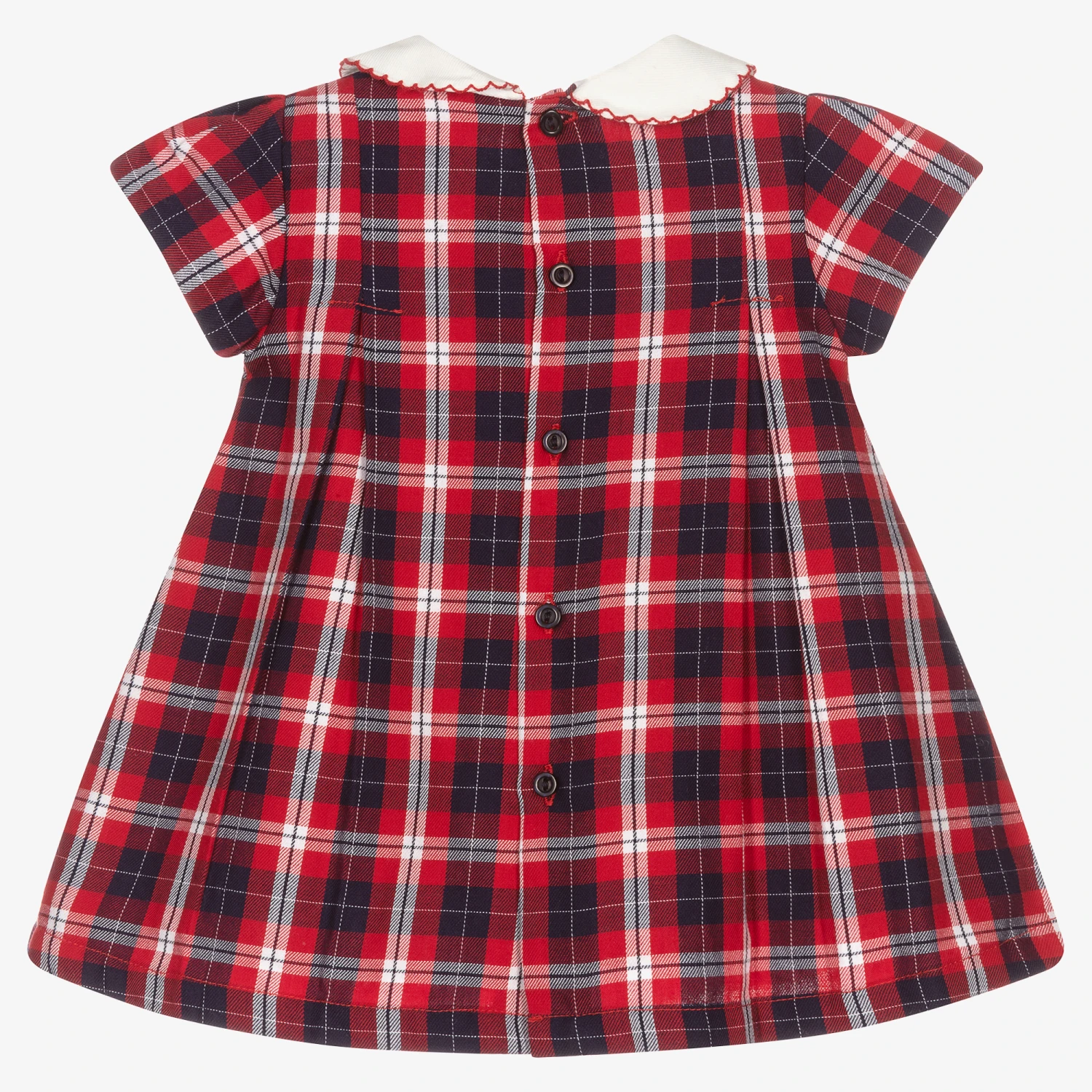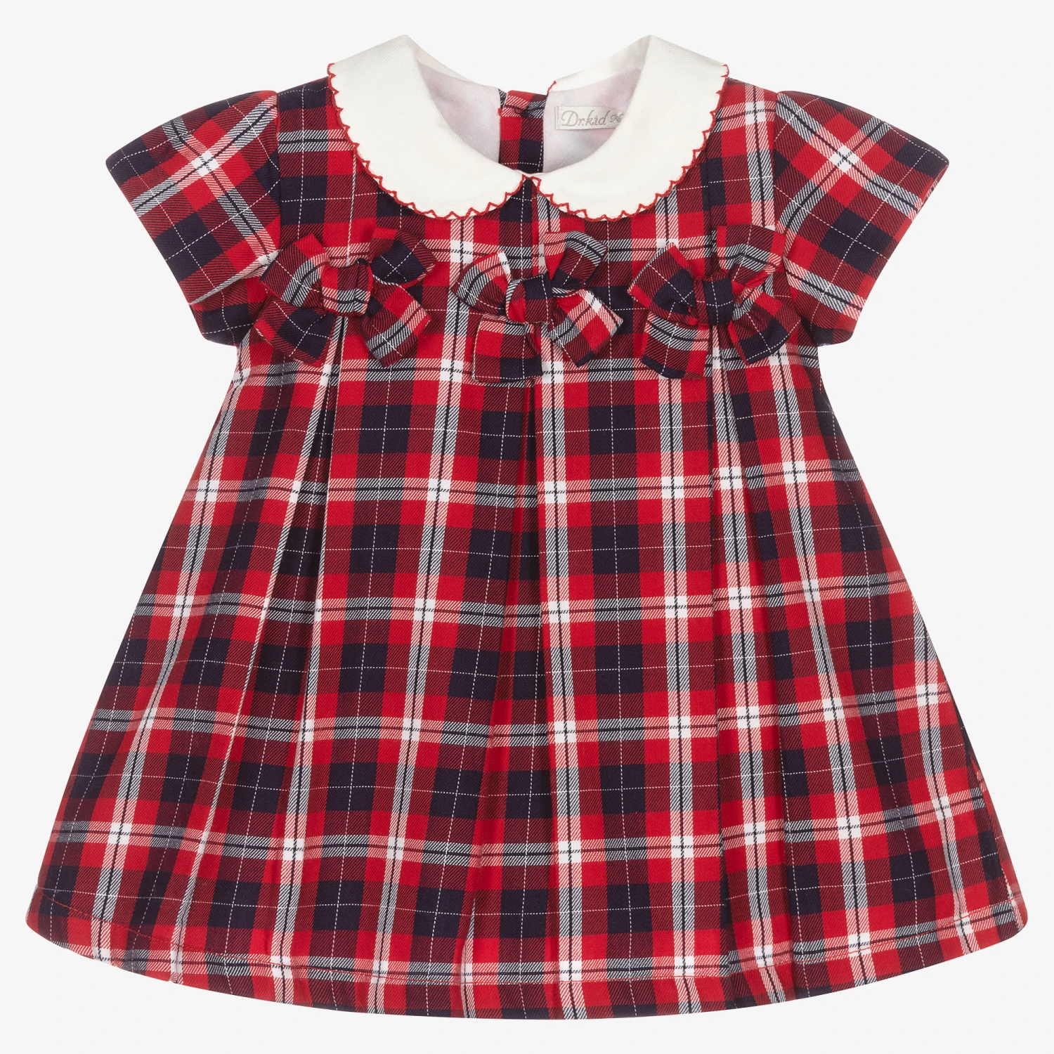 Red, white and navy blue tartan dress for baby girls by Dr. Kid. Made in soft cotton twill and fully lined, it has a white collar with red trim, pleats from the bodice, and three appliqué bows across the front.