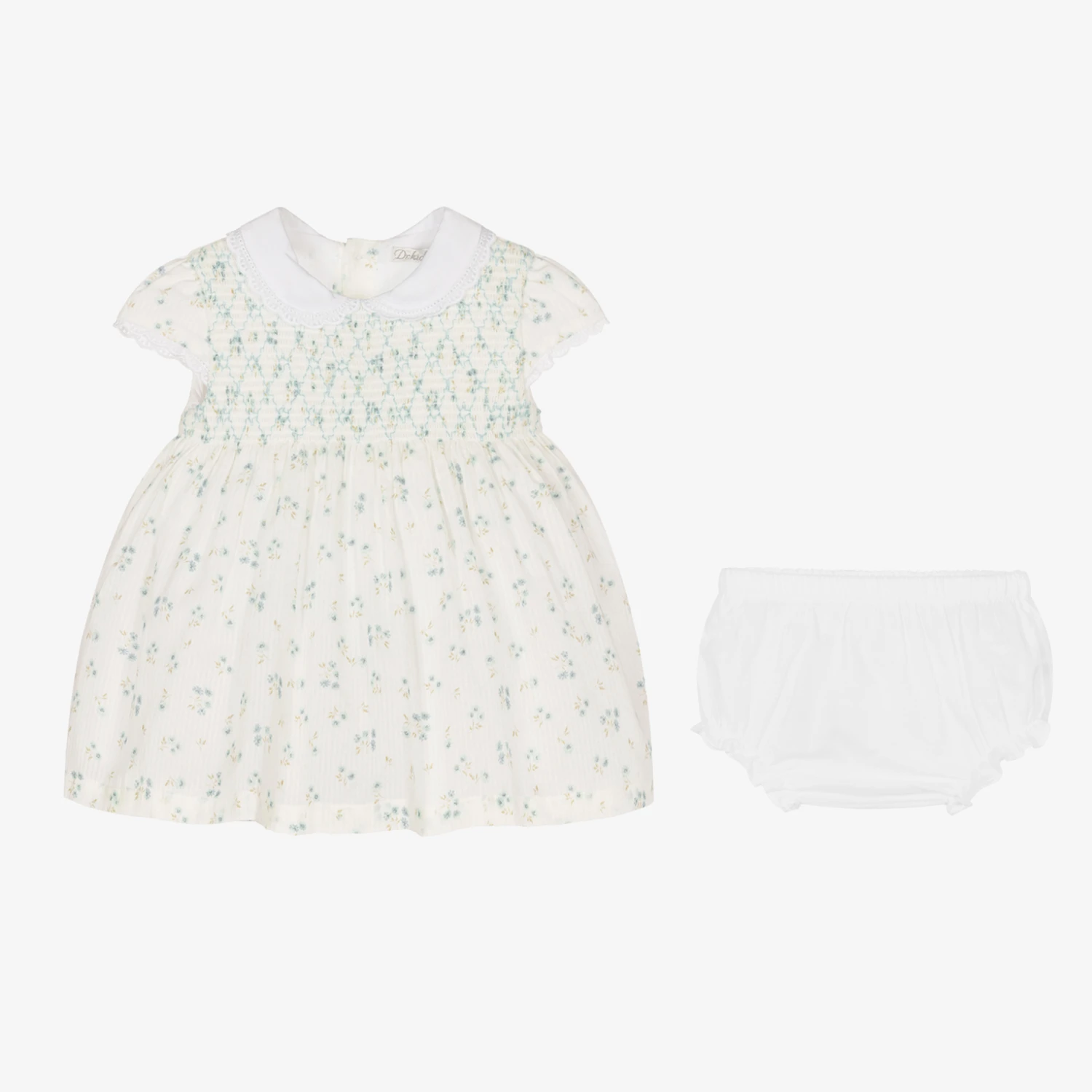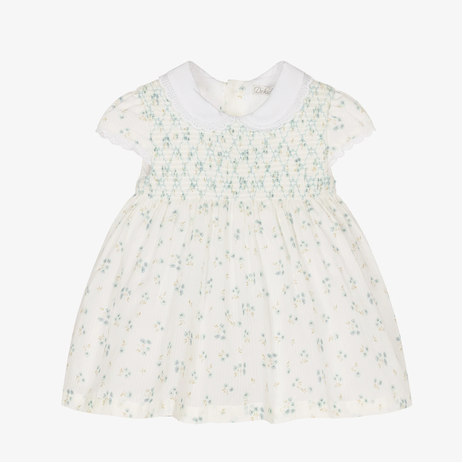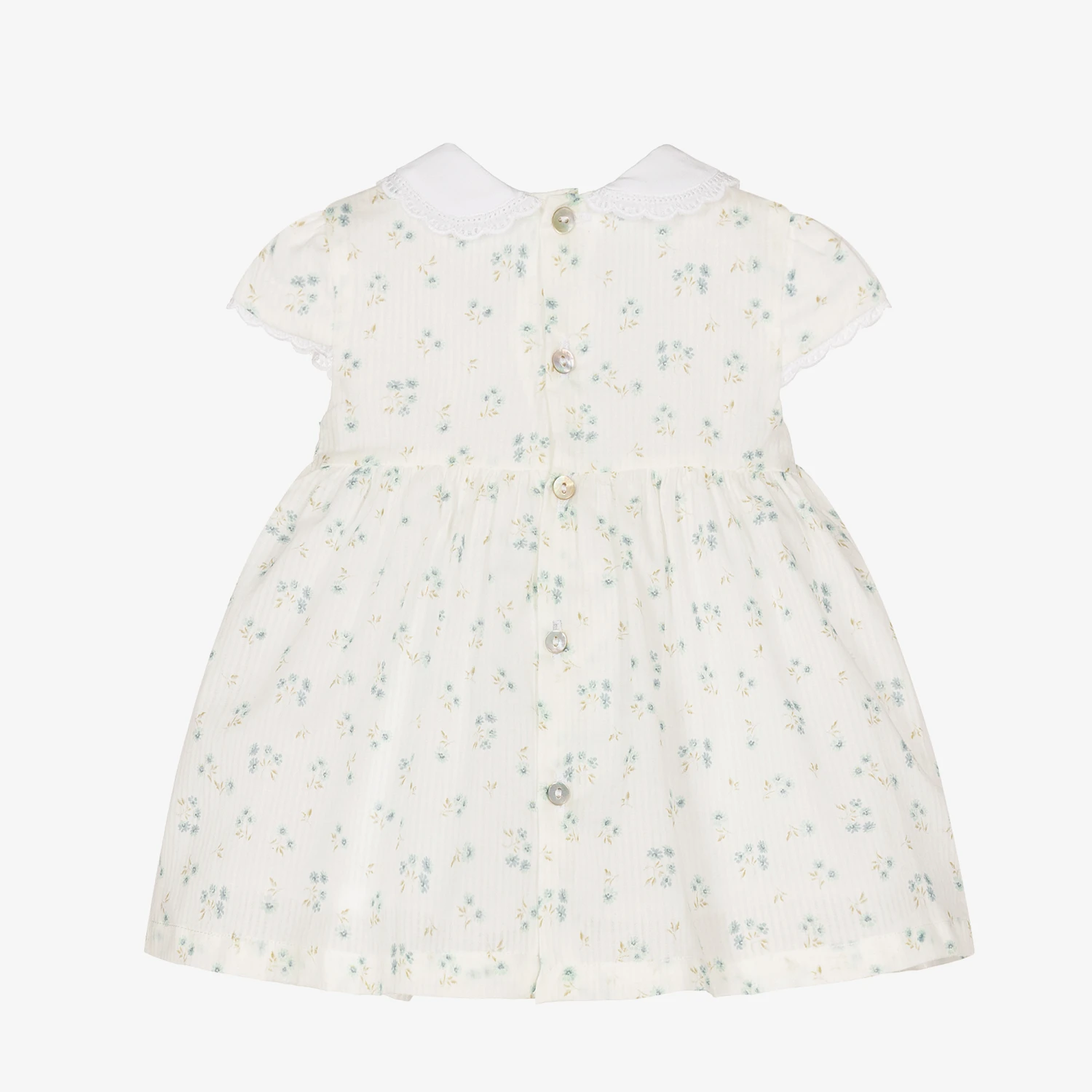 White with a dainty blue and green floral print, this pretty dress for baby girls is by Dr. Kid. Made in lightweight cotton, it features a subtle stripe within the fabric. The bodice has beautiful ruching detail and the Peter Pan collar and capped sleeves are edged in delicate lace trims. The dress fastens with traditional mother-of-pearl buttons on the back and comes with a pair white cotton voile knickers.