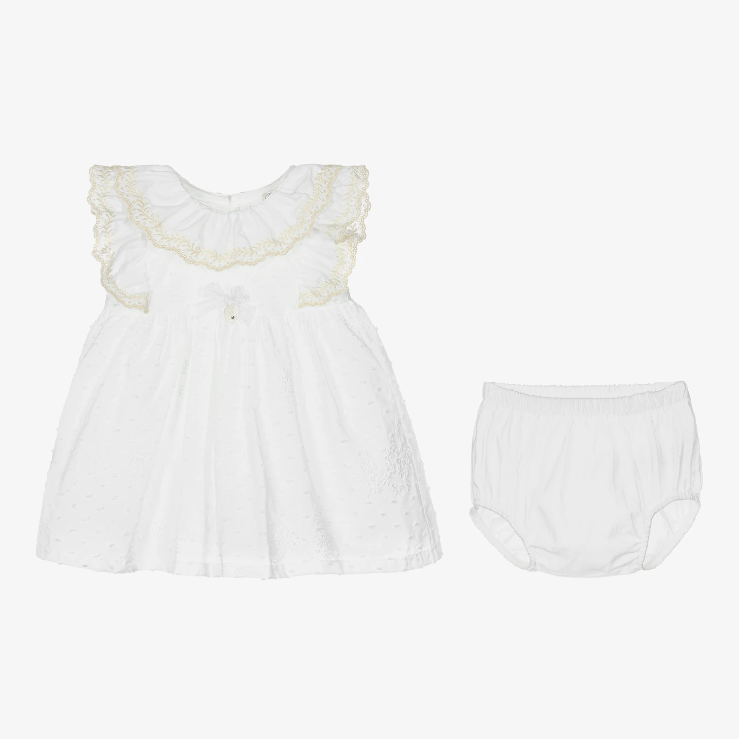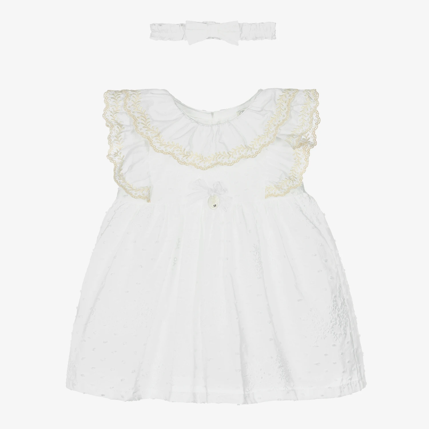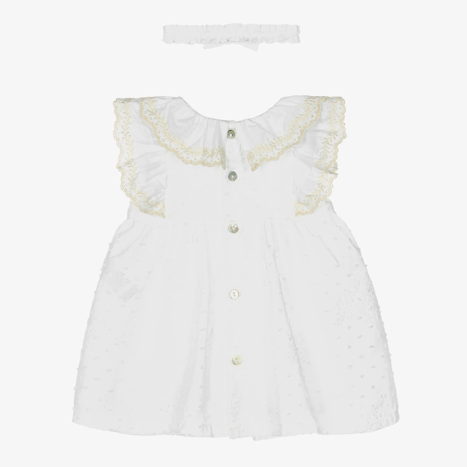 A lovely white dress and headband set for baby girls by Dr. Kid, made in lightweight cotton. The dress has pretty ruffle trims with ivory embroidery, and delicate plumeti and broderie anglaise detailing. It fastens with traditional mother-of-pearl buttons on the back. The matching headband is gently elasticated and has a pretty bow decoration. This charming outfit comes with a pair of white cotton voile knickers.