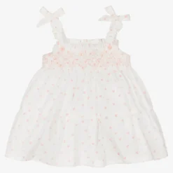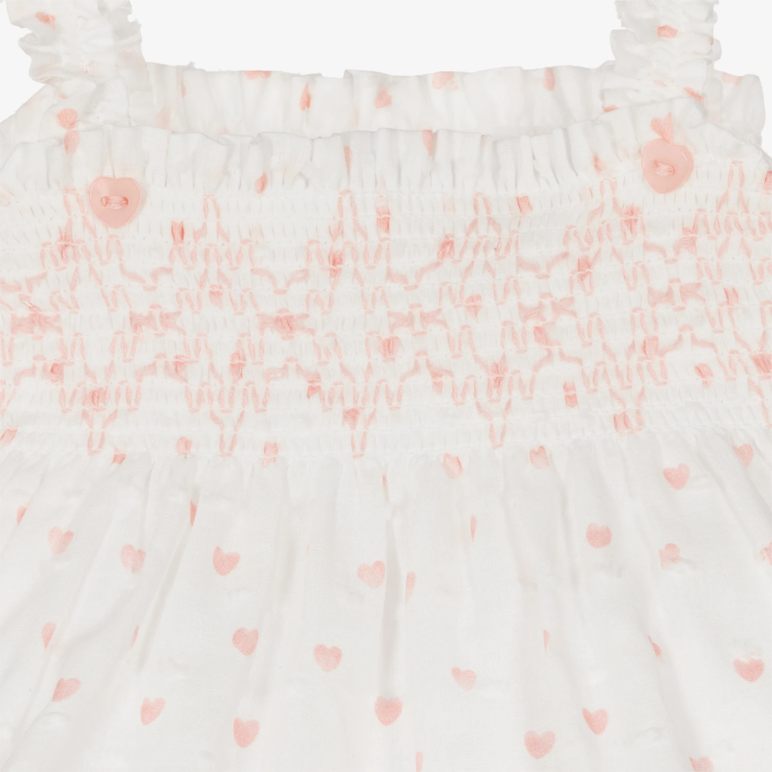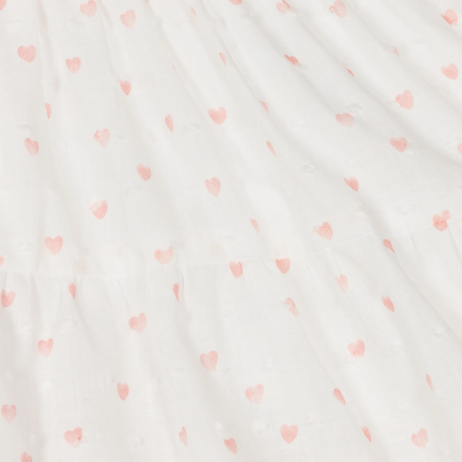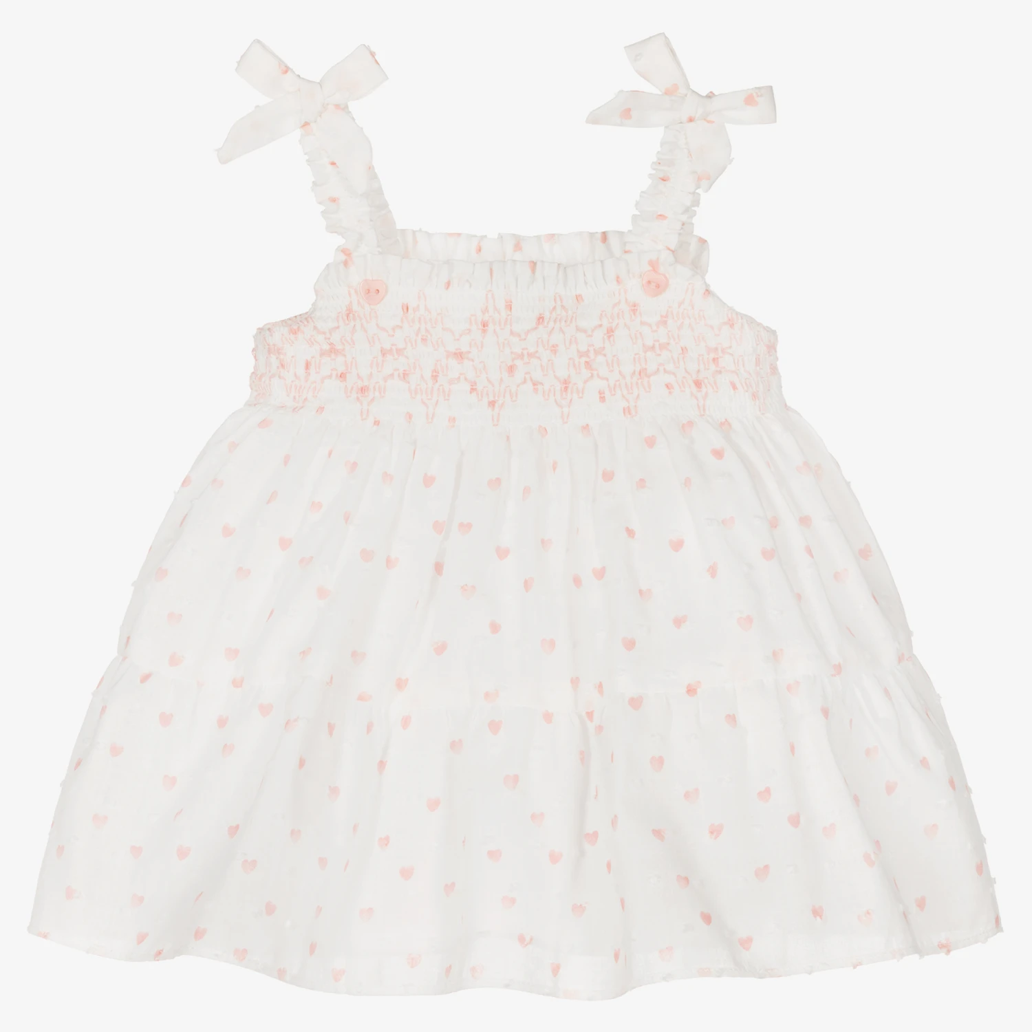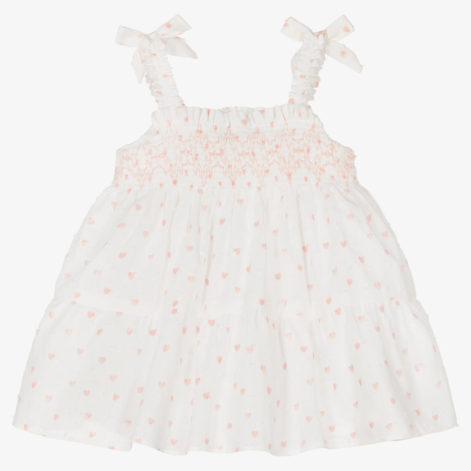 White with a pink heart pattern and delicate plumeti detailing, this charming dress for baby girls is by Dr. Kid. It is made in lightweight cotton and has a shirred bodice and a tiered skirt. The shoulder straps are gently elasticated and have pretty bow trims. Fully lined for comfort, the dress slips on easily over the head and comes with a pair of matching knickers.