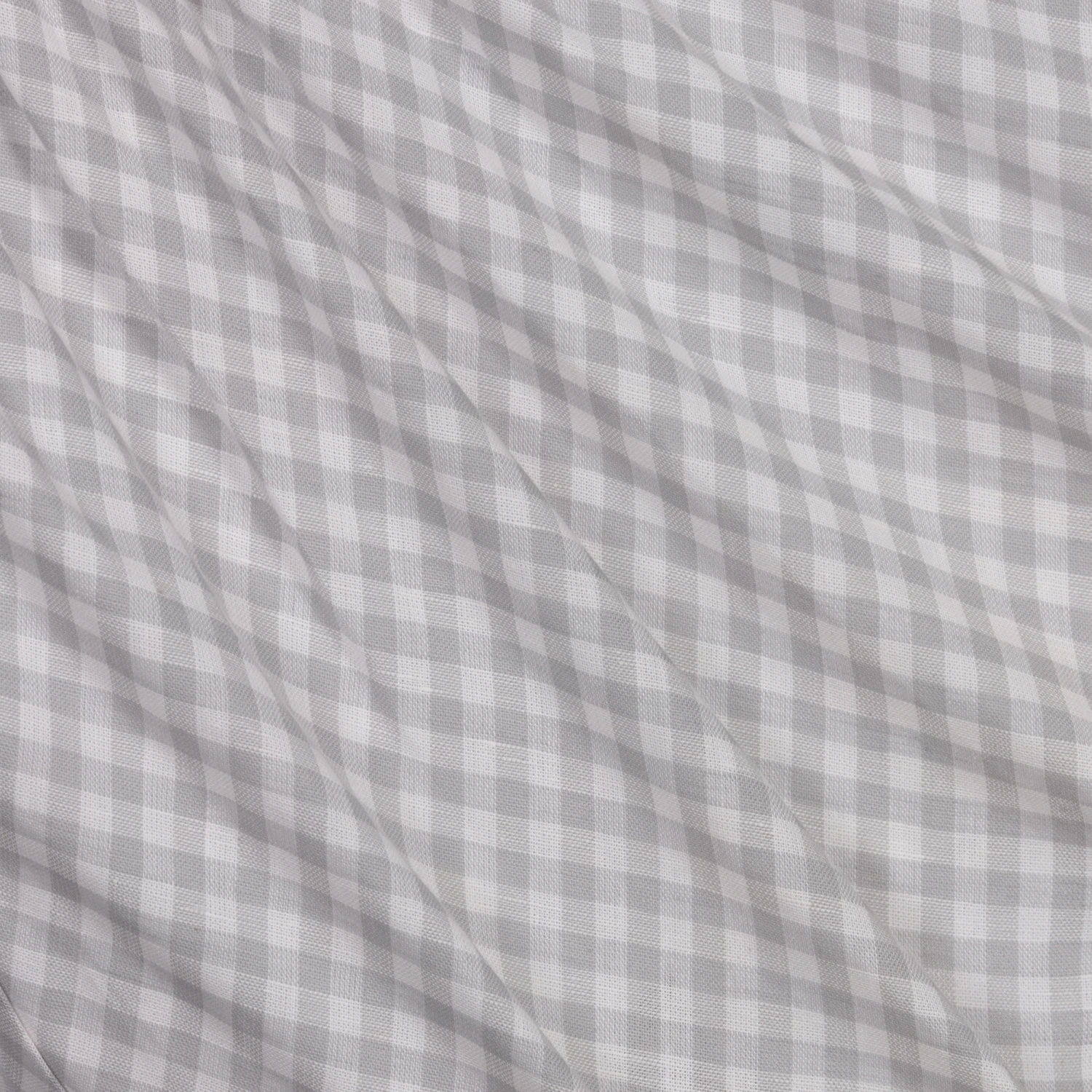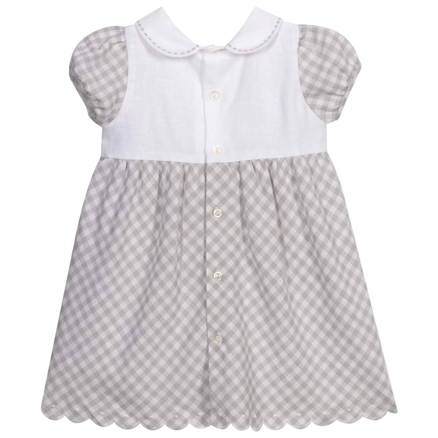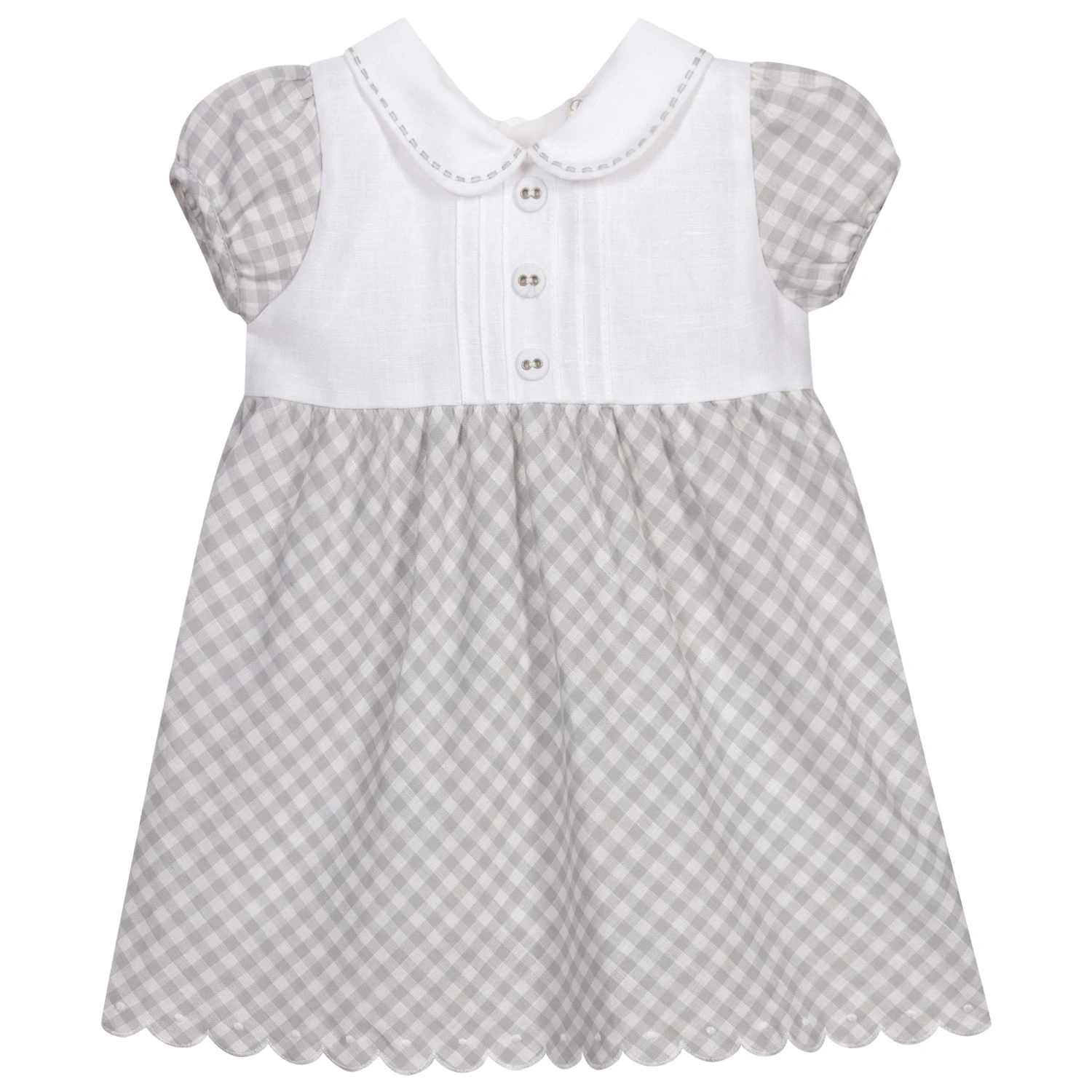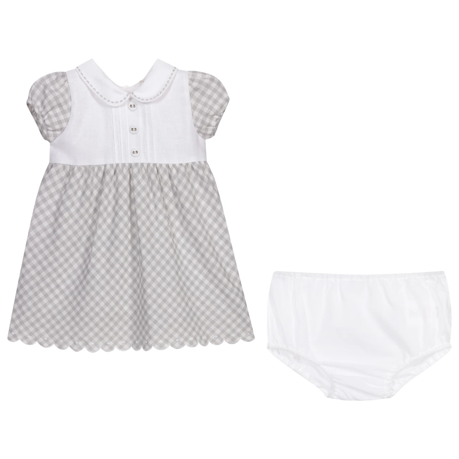 Pretty grey and white checked dress and knickers set for baby girls by Dr. Kid, made in lightweight linen. The white bodice has pintuck detail, decorative buttons and rounded collar with grey embroidery. The gathered skirt has a pretty scalloped hem and the dress fastens with buttons on the back.