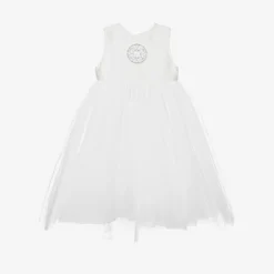 A beautiful sleeveless dress for girls by Elie Saab, ideal for a special occasion. The silk bodice is embellished with the brand’s signature logo on the front in sparkling diamantés. The skirt is made from layers of tulle to create a voluminous and feminine silhouette, and it is lined with a silky and smooth cupro for comfort. It effortlessly fastens with a concealed zip on the back for smooth, discreet dressing.