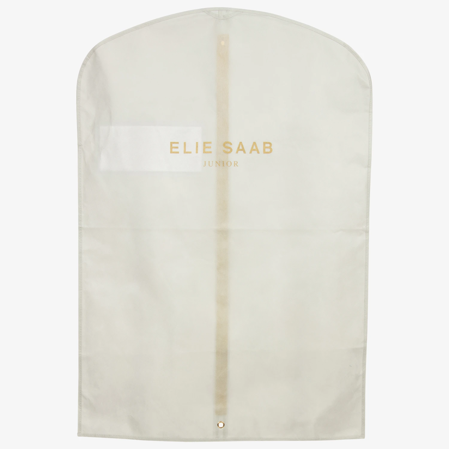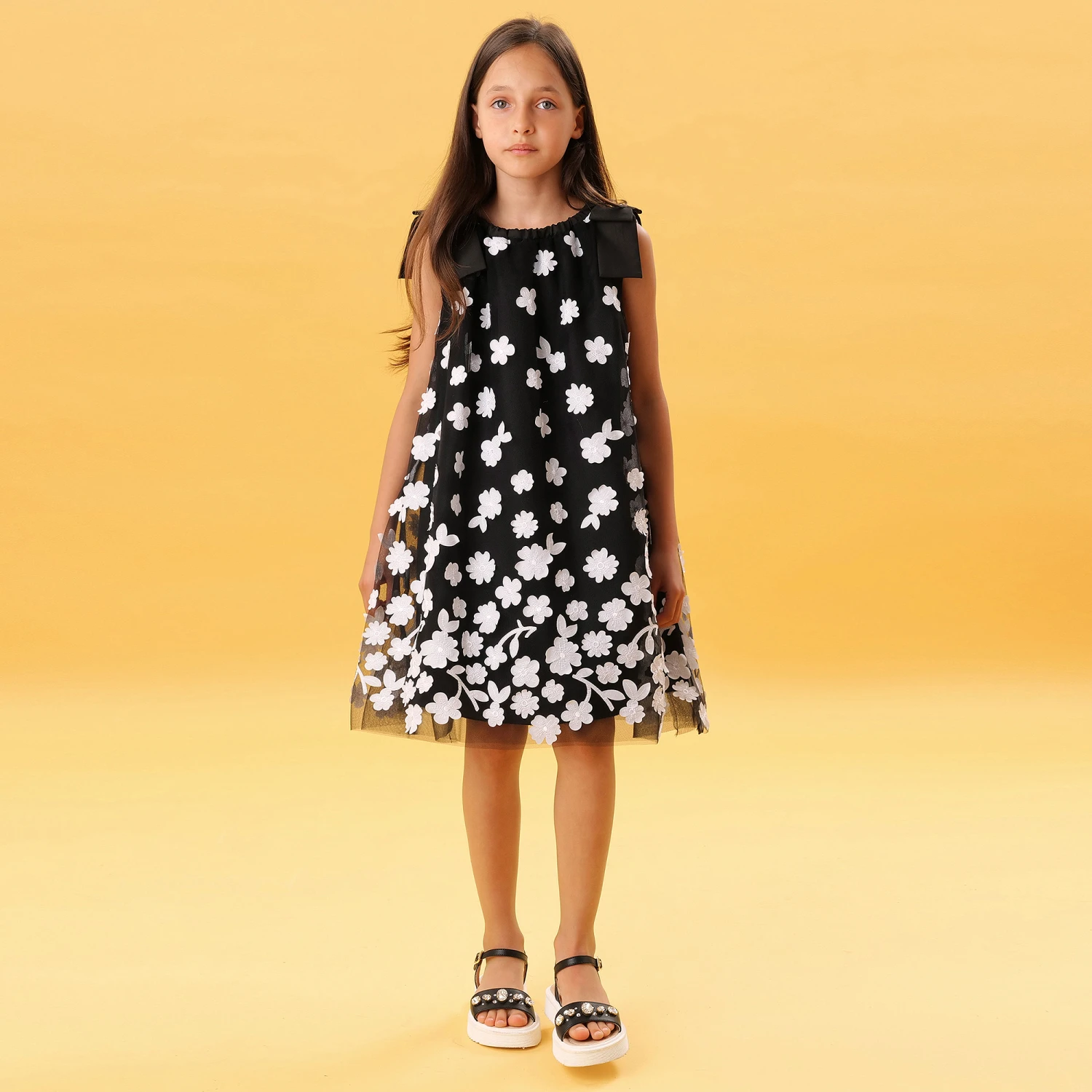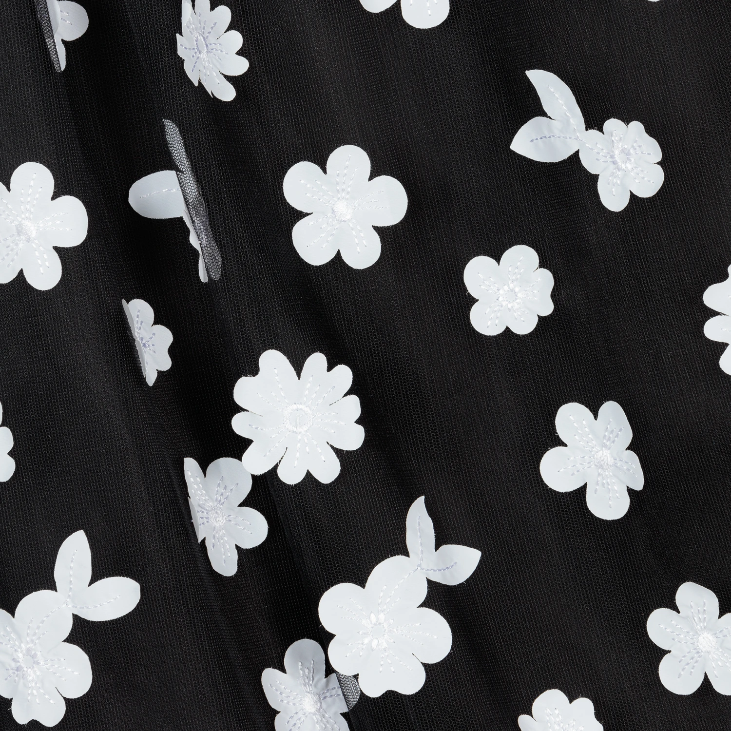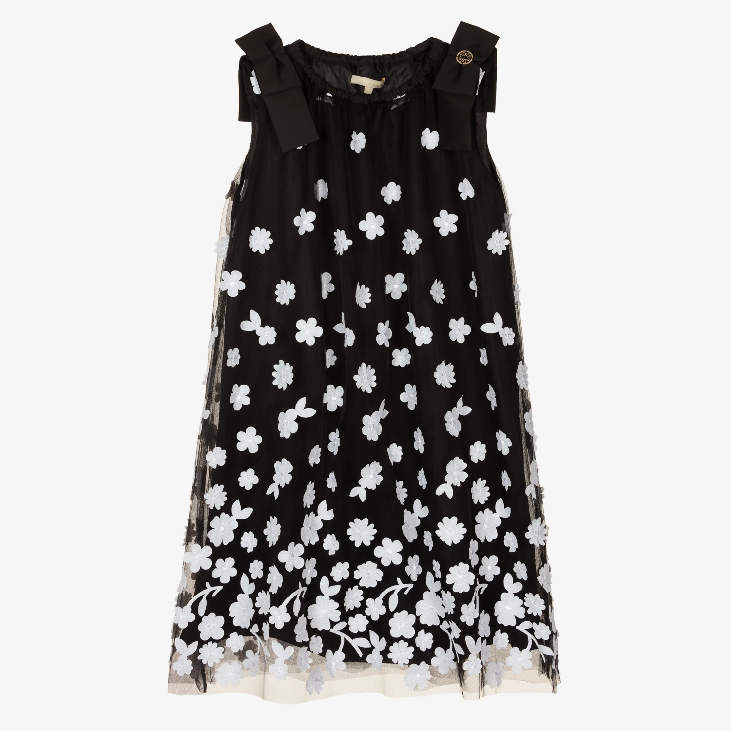Teen girls black tulle dress by luxury brand Elie Saab, lined in silky viscose. Ideal for a special occasion, this chic dress has pretty white floral appliqués all-over with embroidered details, and oversized black bows on the shoulders with a gold logo charm.