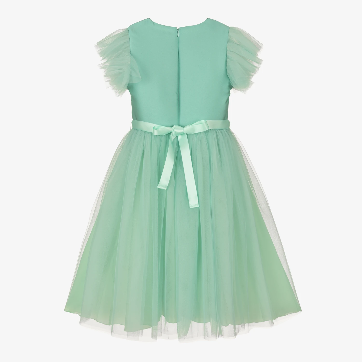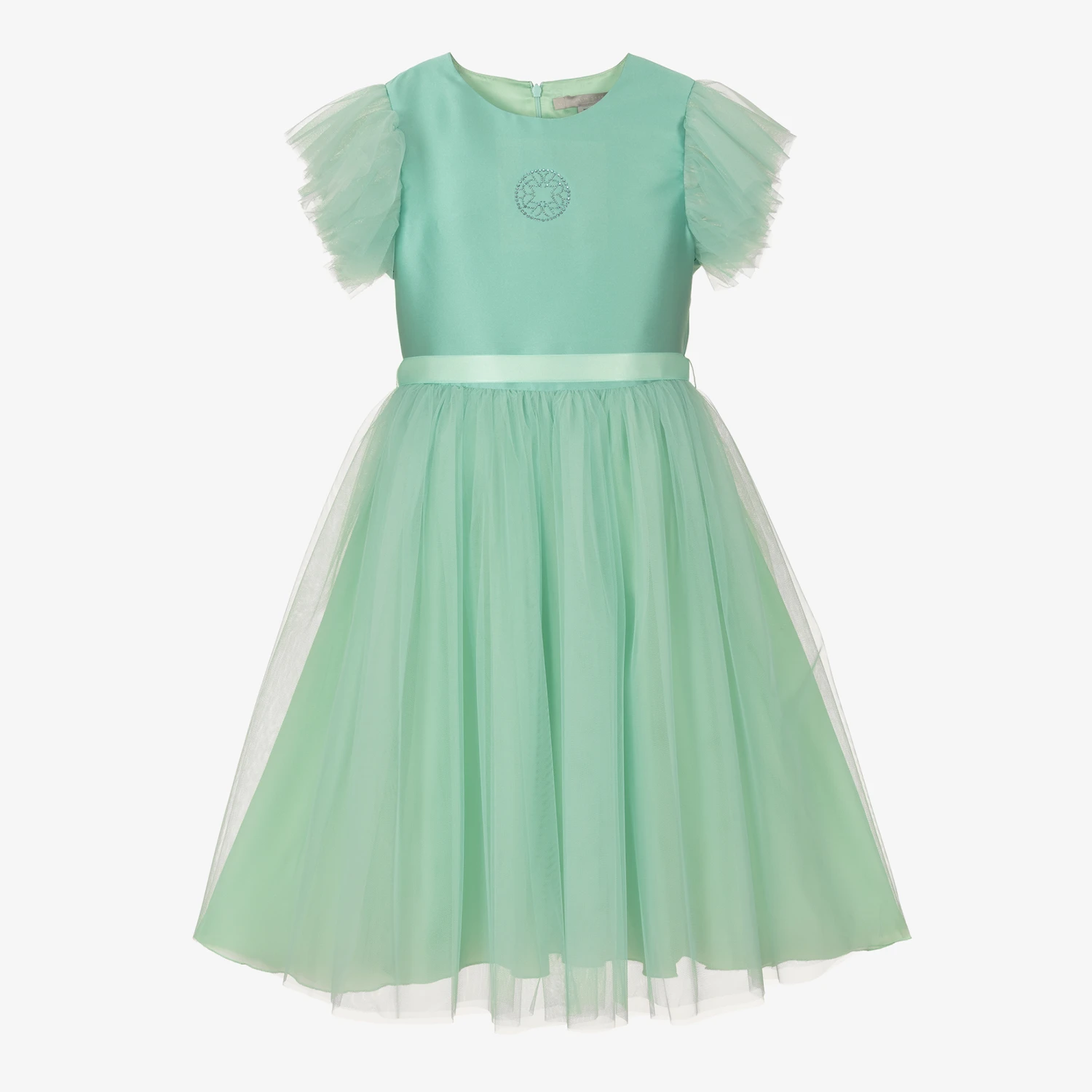 An elegant aqua blue dress for teen girls by luxury brand Elie Saab, embellished with a diamanté logo on the chest. Woven in a beautifully soft silk blend, the satin bodice has a rounded neckline, layered tulle sleeves and a concealed zip fastening on the back. The tulle skirt is lined with silky satin cupro fabric and gently gathers at the waist. A matching sash belt can be tied around the waist for that all-important finishing touch.