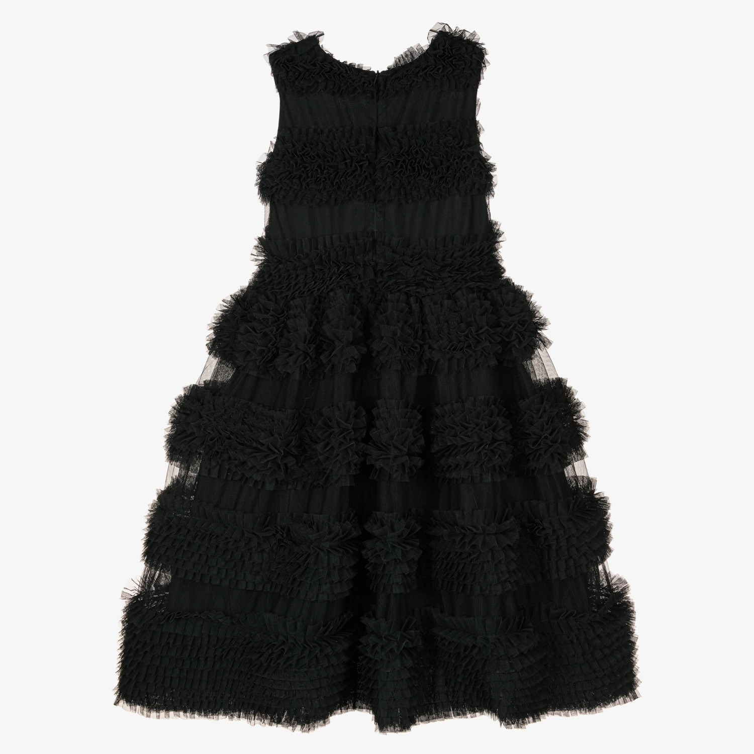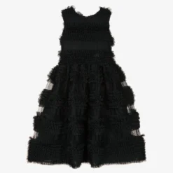 Fabulous black special occasion dress for teen girls by luxury brand Elie Saab, made in lightweight tulle decorated with bands of pleated tulle ruffles and ideal for making an entrance. The beautifully full skirt is has a tulle underskirt and a tulle frill on the voile lining for masses of extra volume and swish. There is a shiny golden logo sewn on the waist and a discreet, concealed zip fastening on the back.