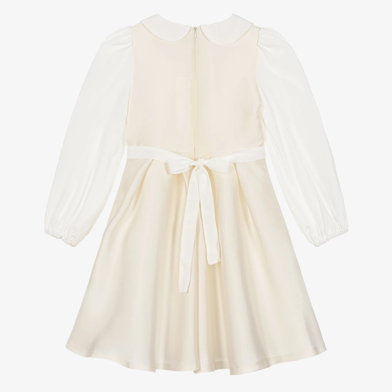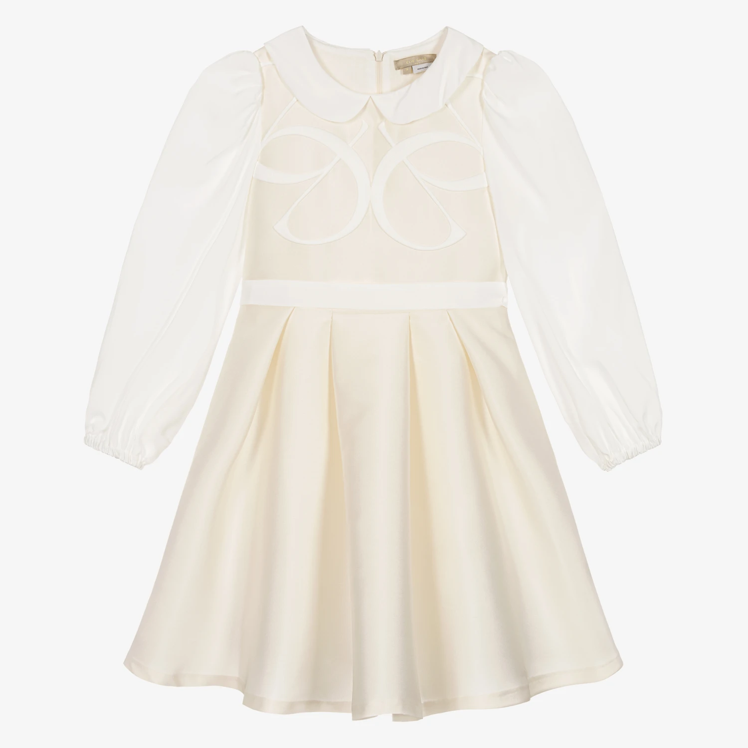 Elegant ivory dress for teen girls from luxury brand Elie Saab, crafted in a beautifully soft silk blend. With a traditional look, this collared dress has tonal logo embroidery on the chest and delicate chiffon sleeves that gather on the shoulder. A detachable sash belt can be worn around the waist for a pretty finish. The A-line skirt is accented with structured box pleats and a tulle underskirt, which together create volume and flare. A concealed zip fastening on the back and a soft voile lining complete this charming, occasion dress.