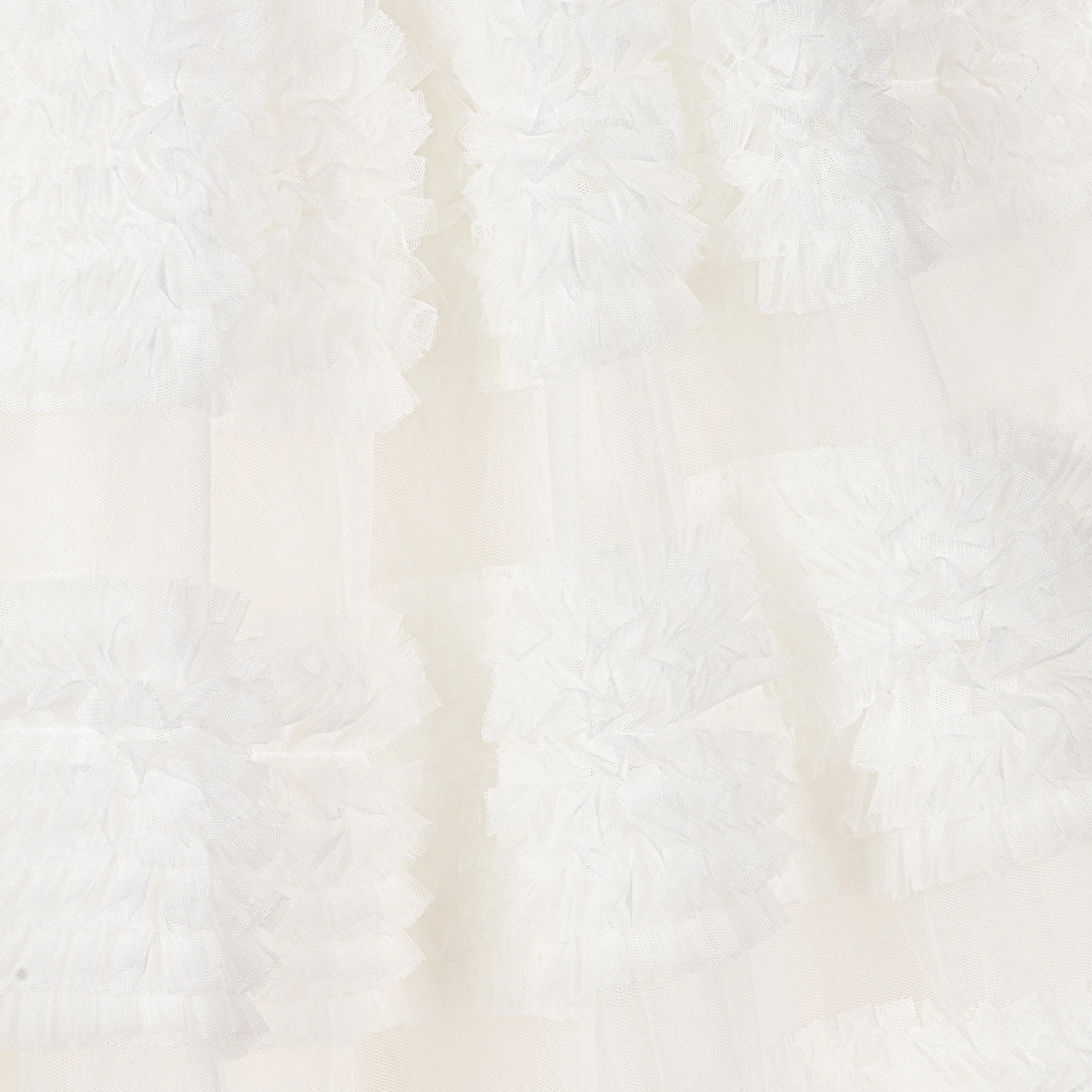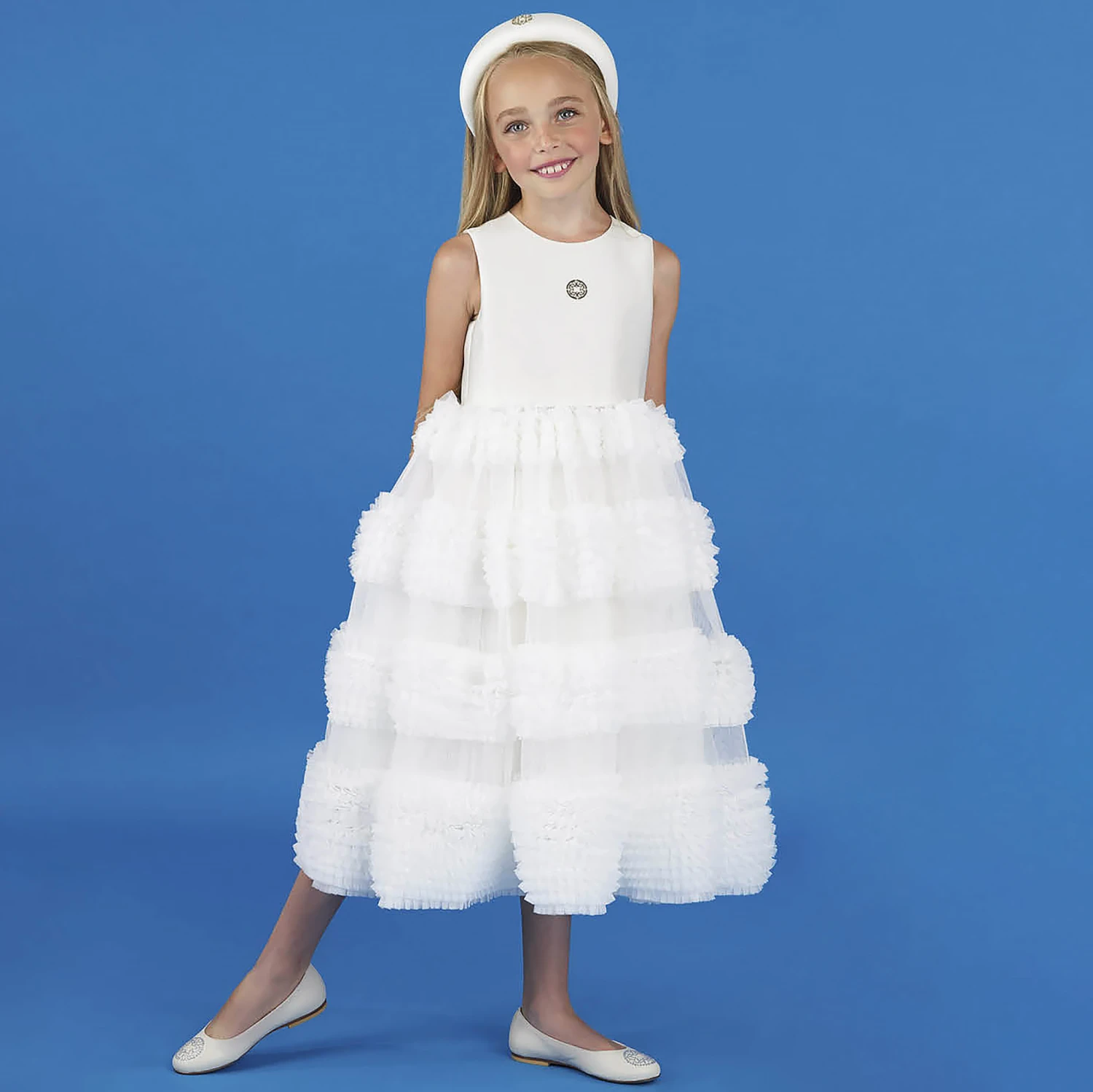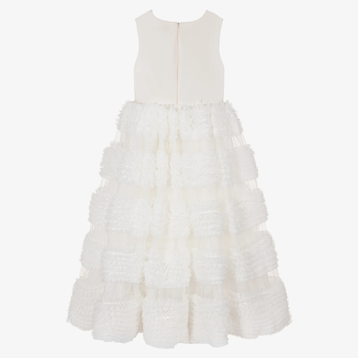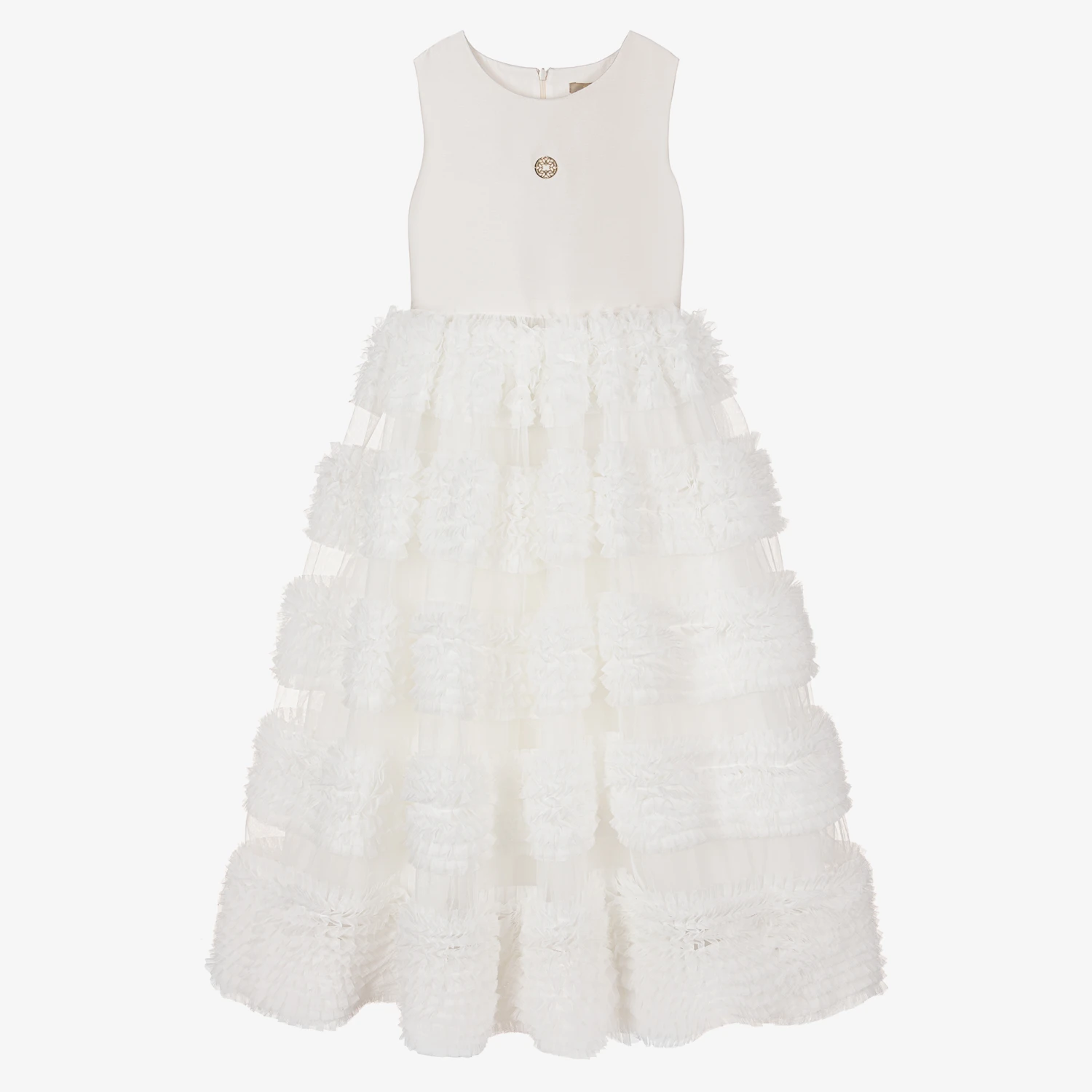 Beautiful special occasion dress for teen girls by luxury brand Elie Saab, just right for making an entrance. For instant brand recognition, it has a shiny golden metal logo sewn on the ivory, silk-blend, satin bodice. Fully lined in lightweight voile for comfort, the wonderfully full tulle skirt has bands of pleated tulle ruffles all around, with an underskirt of tulle and a tulle frill on the voile lining for extra volume and swish. It fastens with a discreet, concealed zip around the back.