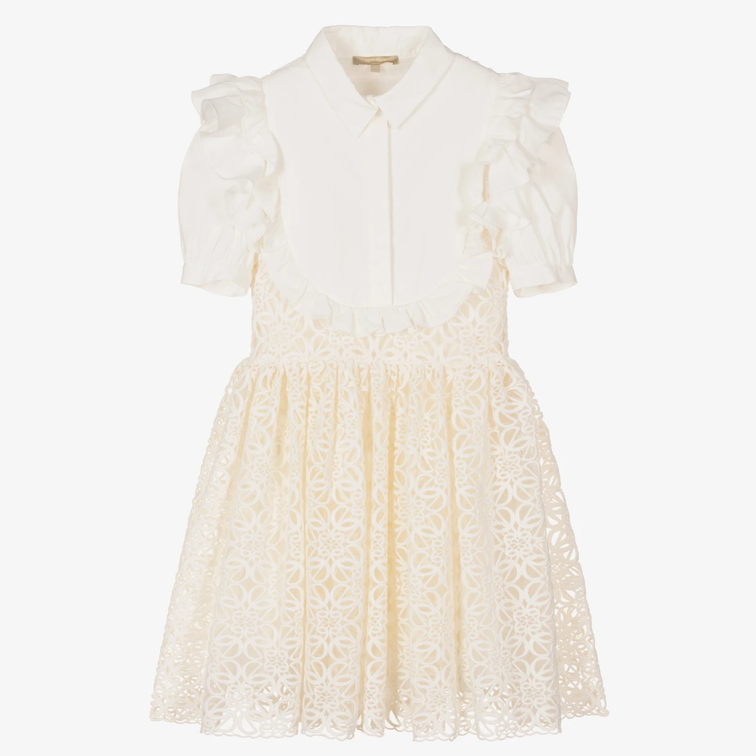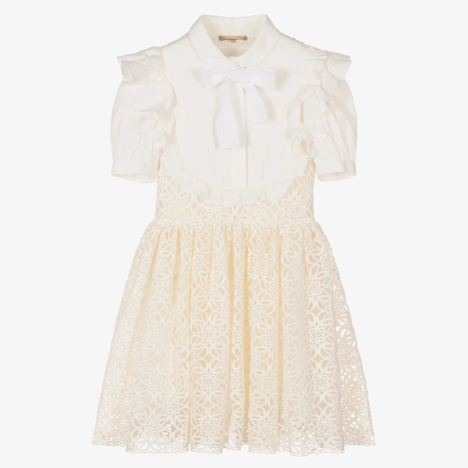 Teen girls ivory cotton dress by luxury designer Elie Saab, with a beautifully embroidered wool and cashmere monogram design. Lovely for a special occasion, it has a frilled white cotton shirt bodice, with frilly puffed sleeves for a feminine look. Stylish and elegant, the dress fastens with a discreet side zip and mother-of-pearl buttons. There are small gold logo buttons on the sleeves for a further branded touch and a comfortable cotton lining with tulle trims for extra volume. There is a detachable bow tie, ideal for creating different looks.