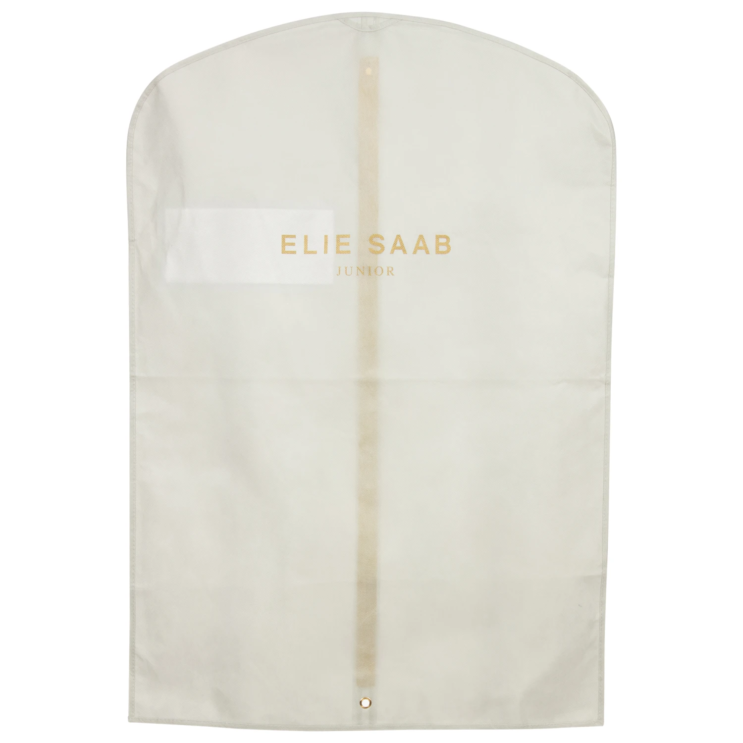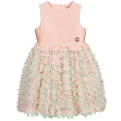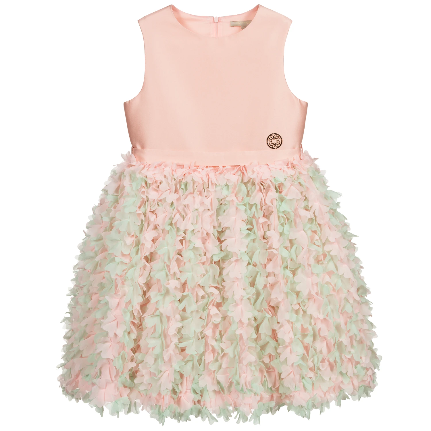 Luxurious fit and flare dress for teen girls by Elie Saab. The pink silk blend bodice has a gold logo badge sewn on one side. The full chiffon skirt is covered in pink and green floral appliqués and has a tulle underskirt with frills for extra volume. There is a removable sash belt that ties in a bow on the back.