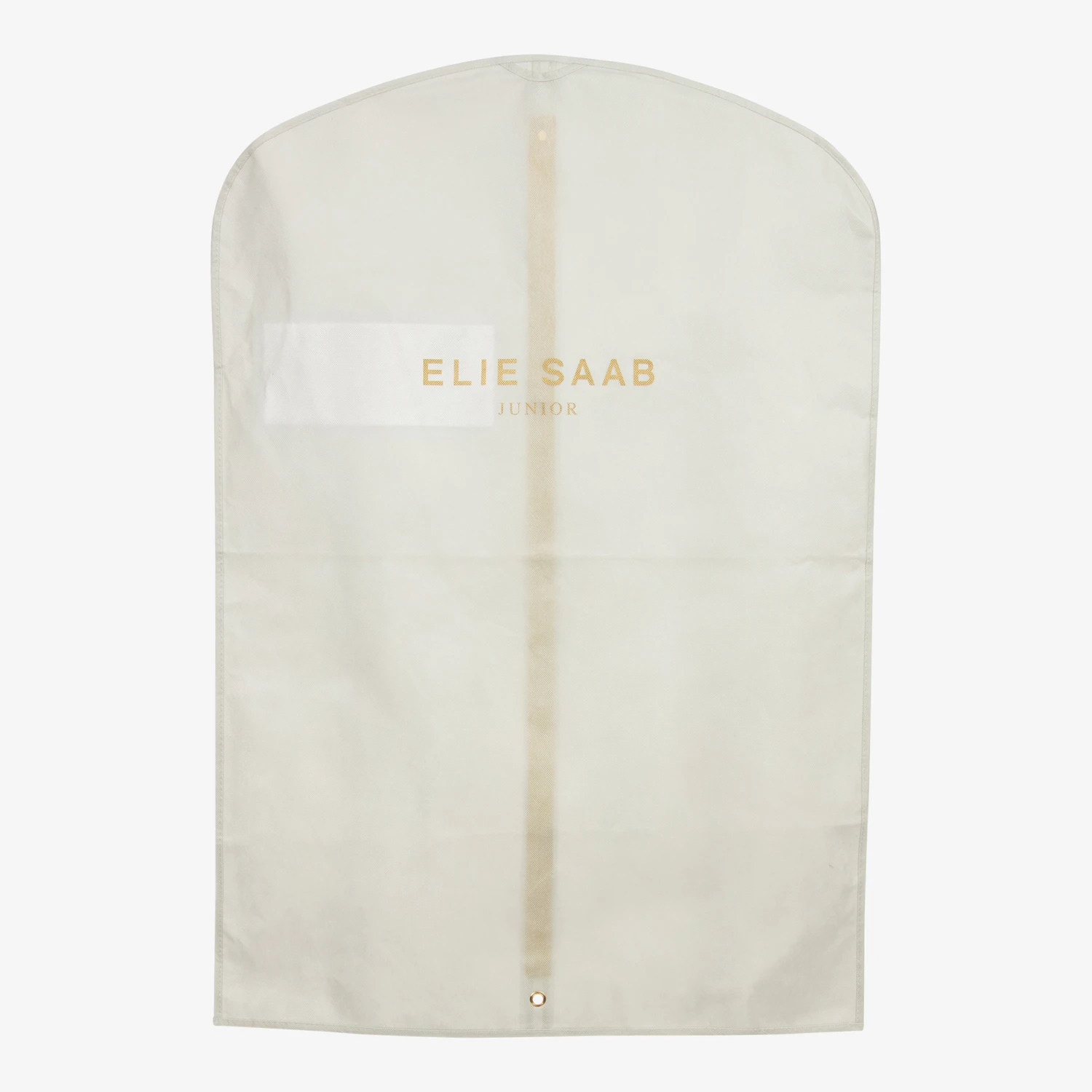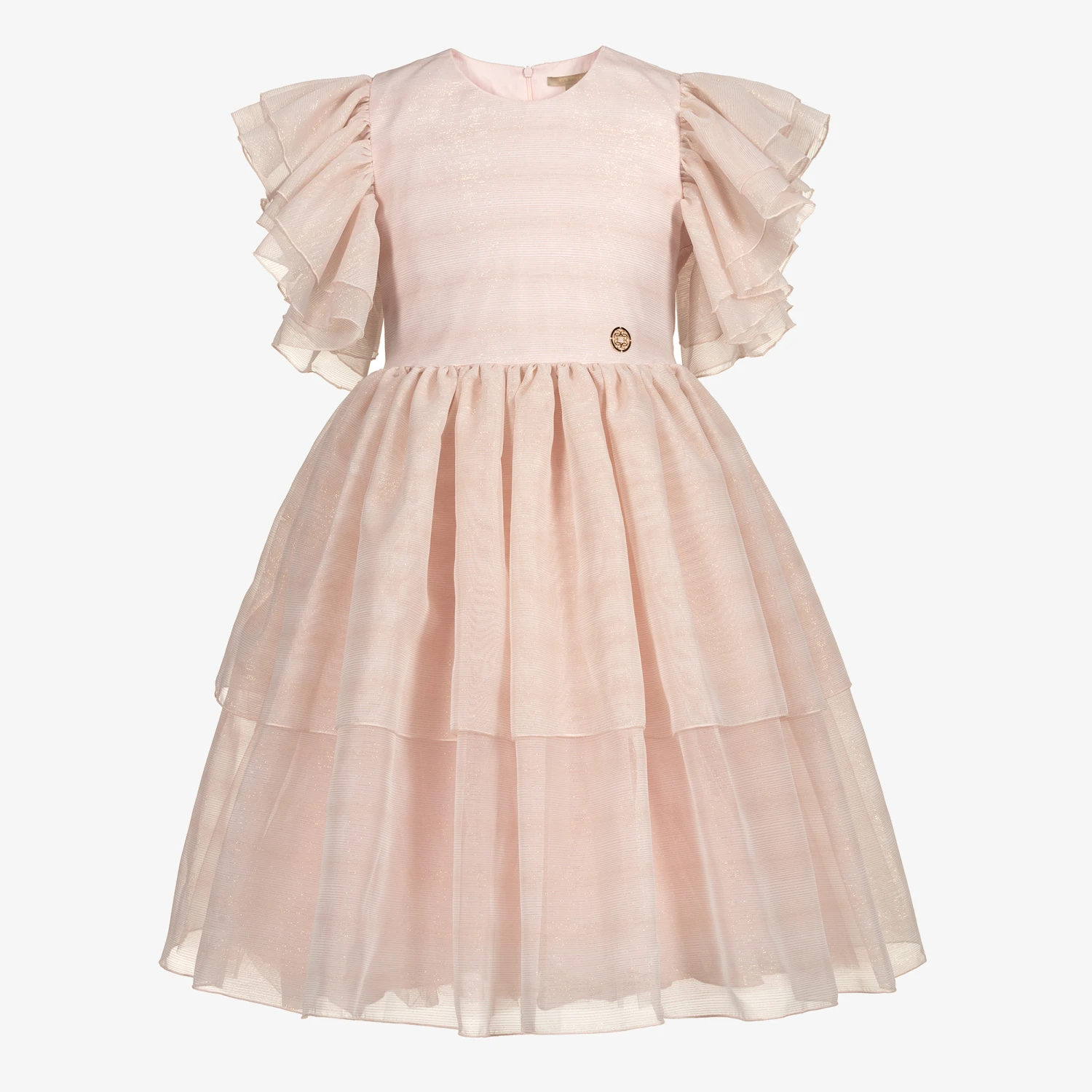 Beautiful pale pink chiffon dress for teen girls with fine gold lurex stripes, by luxury designer Elie Saab. Perfect for a special occasion, it has pretty ruffled sleeves, a gold logo charm on the front, and gathered tulle layers on the skirt for a full silhouette.