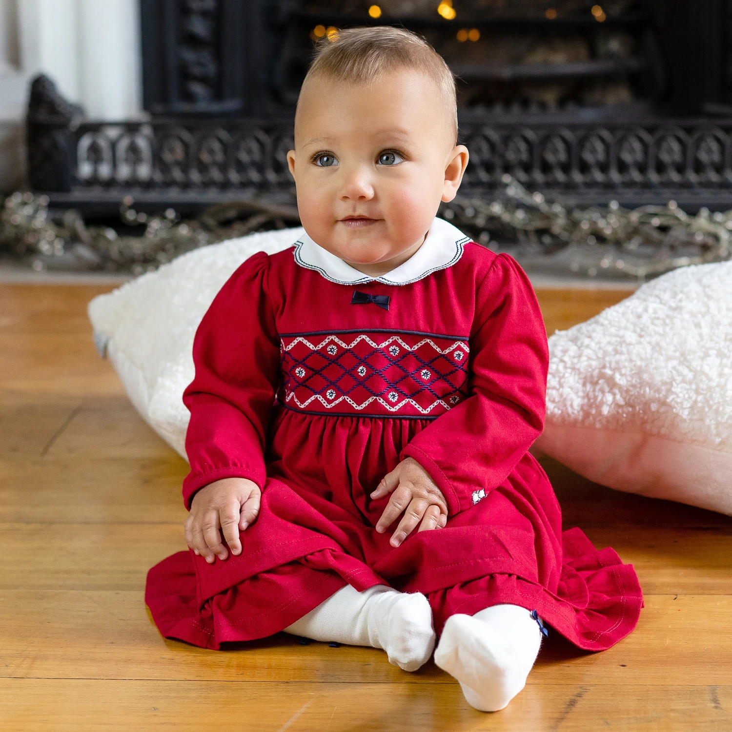Sweet red dress and tights set for baby girls by Emile et Rose, made in soft cotton. The red jersey dress has a traditional design, with a white scalloped collar and navy blue embroidery on the front. fastening with poppers on the back, it also has teddy bear logo embroidery on one sleeve. The soft and stretchy cotton blend ivory tights have navy blue bows on the ankles.