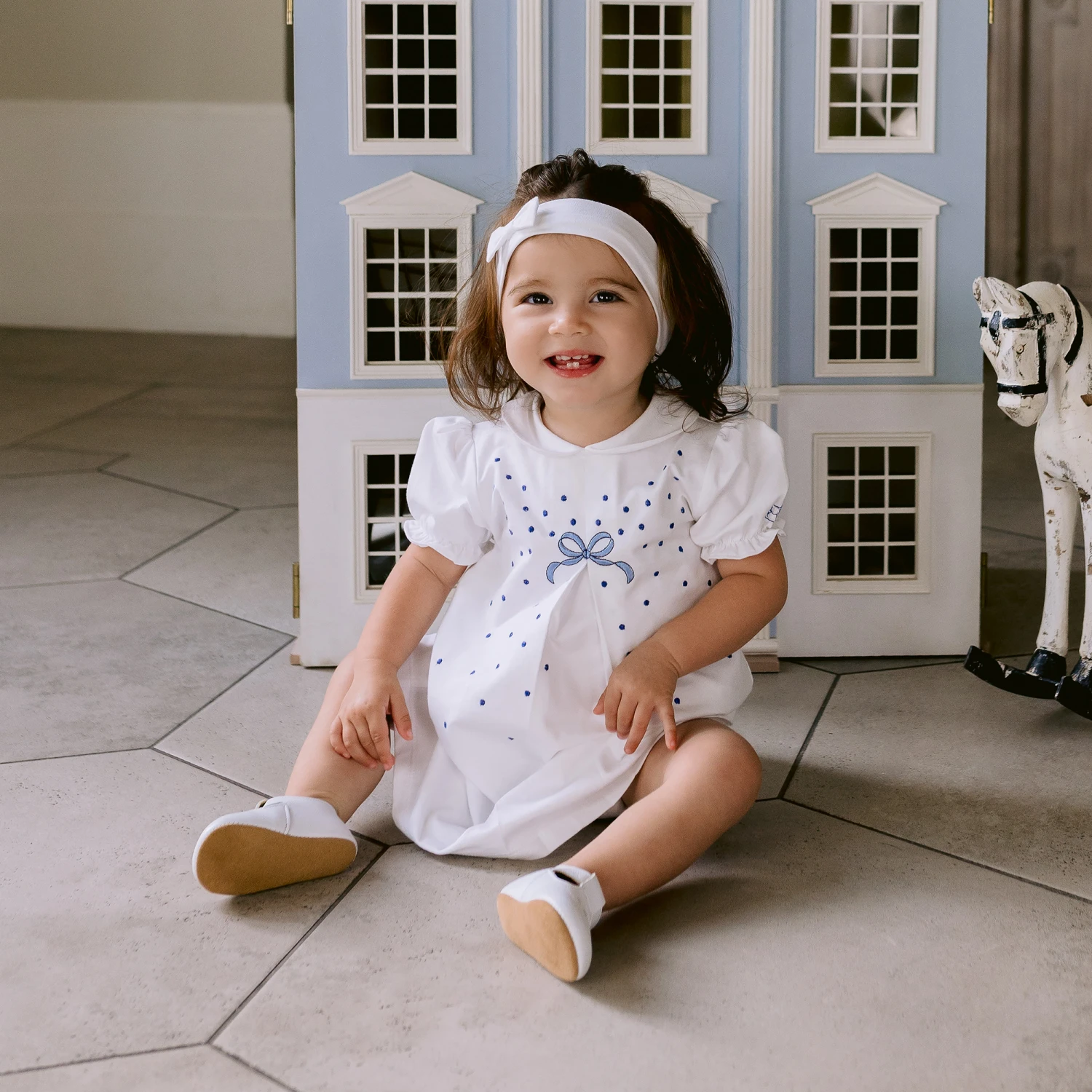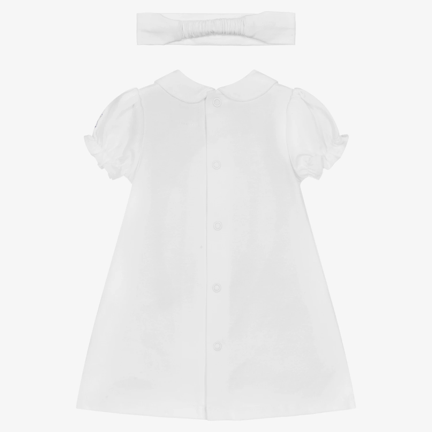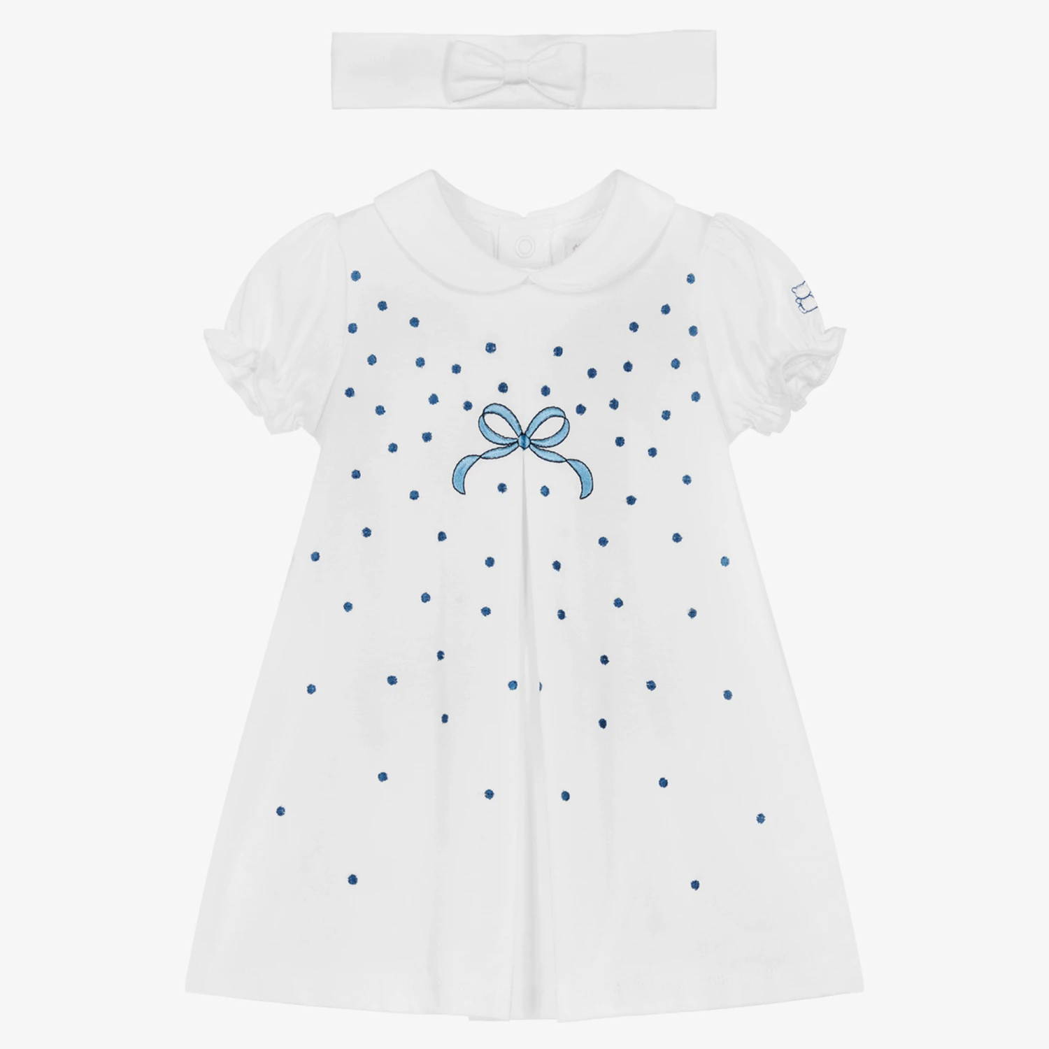 Adorable white dress and headband set for baby girls by Emile et Rose, made in soft cotton jersey. The sweet dress has an embroidered blue spot pattern, with an elegant bow in the middle. Fastening with poppers, it also as a sweet rounded collar and puffed sleeves, for a feminine look. It comes with plain white knickers and a headband with a bow on the front.