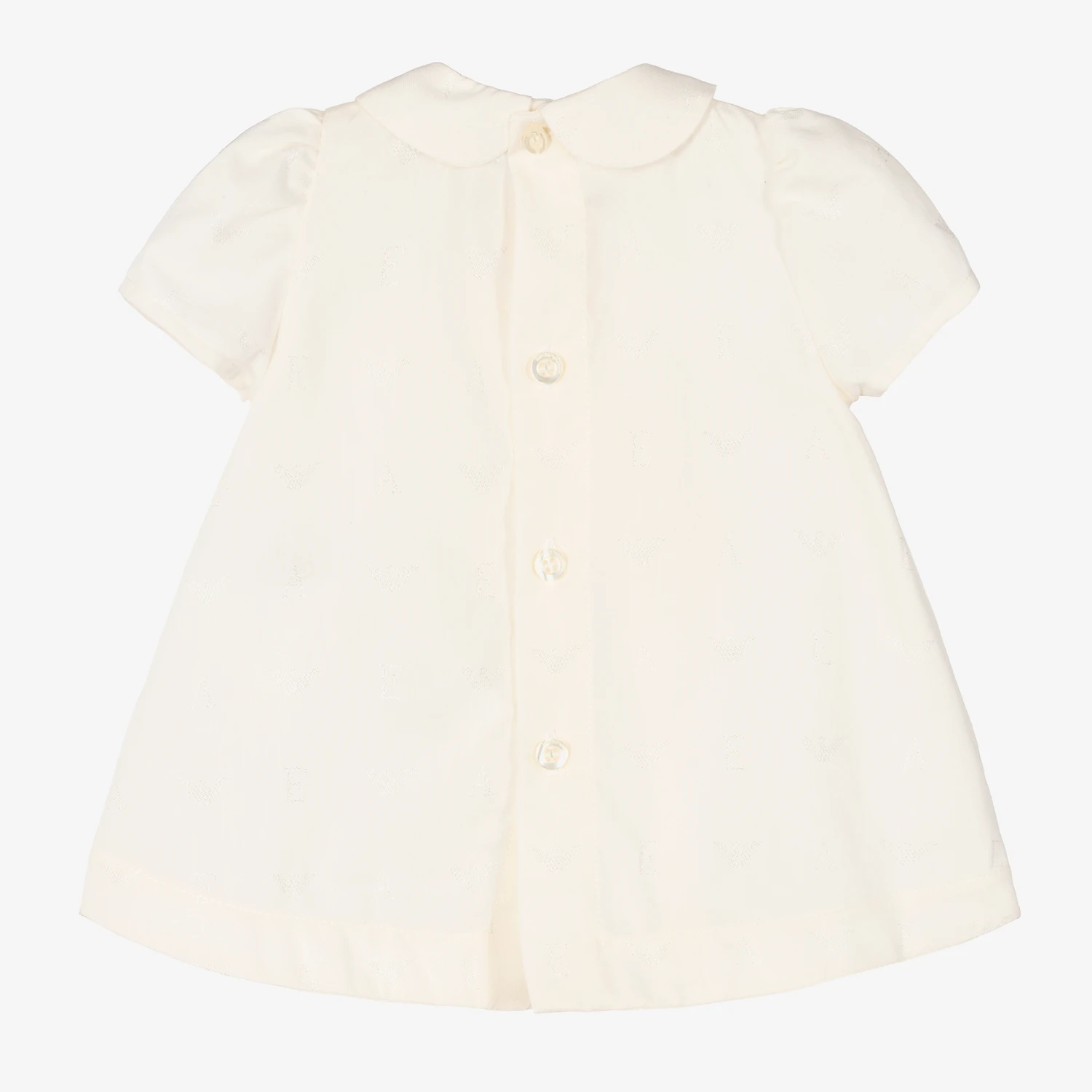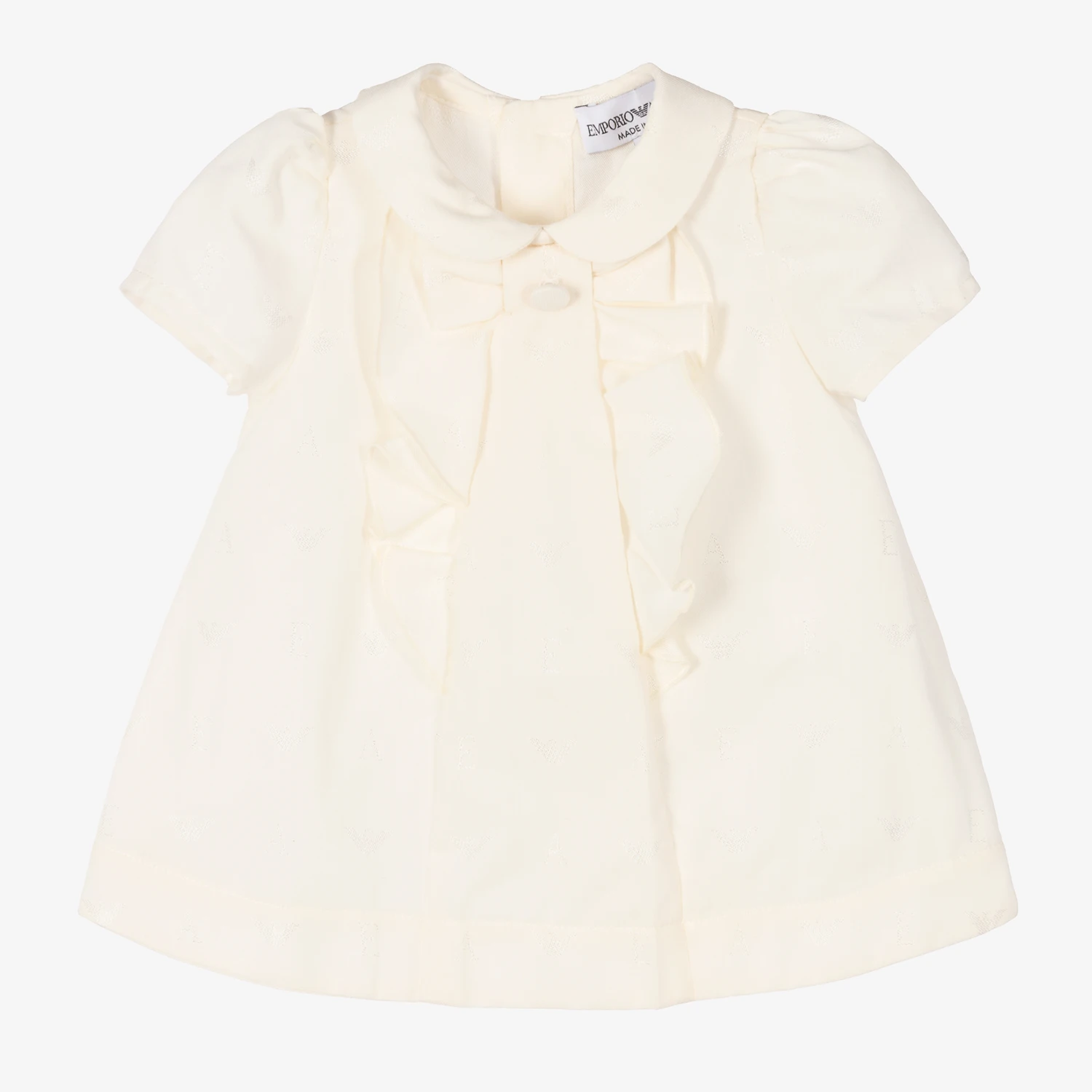 Pretty ivory dress for baby girls by Emporio Armani, made in a luxuriously soft cotton blend. The smart dress has a delicate EA and Eagle logo embroidered throughout with a subtle ivory shimmer. The traditional pointed collar and statement ruffle trims give this dress a girly look, and there is a fixed button and bow on the front. Fastening with buttons on the back, the lovely dress pairs with matching elasticated knickers to complete the special look.
