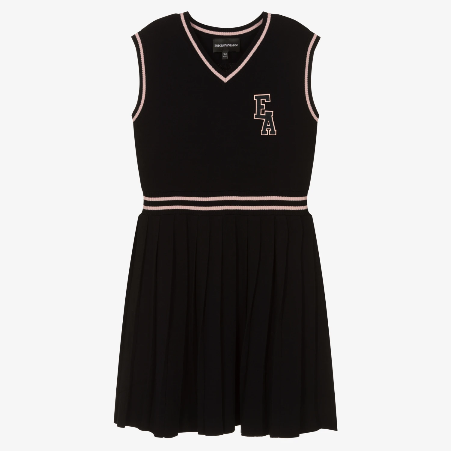 Teen girls smart navy blue college-style dress by Emporio Armani. Knitted in a mid-weight stretchy viscose blend, this V-neck preppy design has pink edging and matching trims around the waistband. The brand’s EA logo initials are embroidered at the chest in 3D appliqué, with a silicone Eagle logo badge on the back. The flippy pleated skirt allows for plenty of movement and ease of wear.