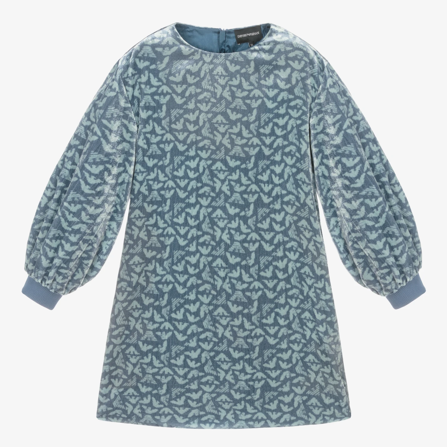 Unmistakeably Emporio Armani, blue velvet dress for teen girls by the Italian designer. In a relaxed shape, it has a stylish intarsia Eagle design all-over, and stretchy ribbed trims. Fastening with a concealed zip on the back for a seamless finish, it has a silky viscose lining for comfort.