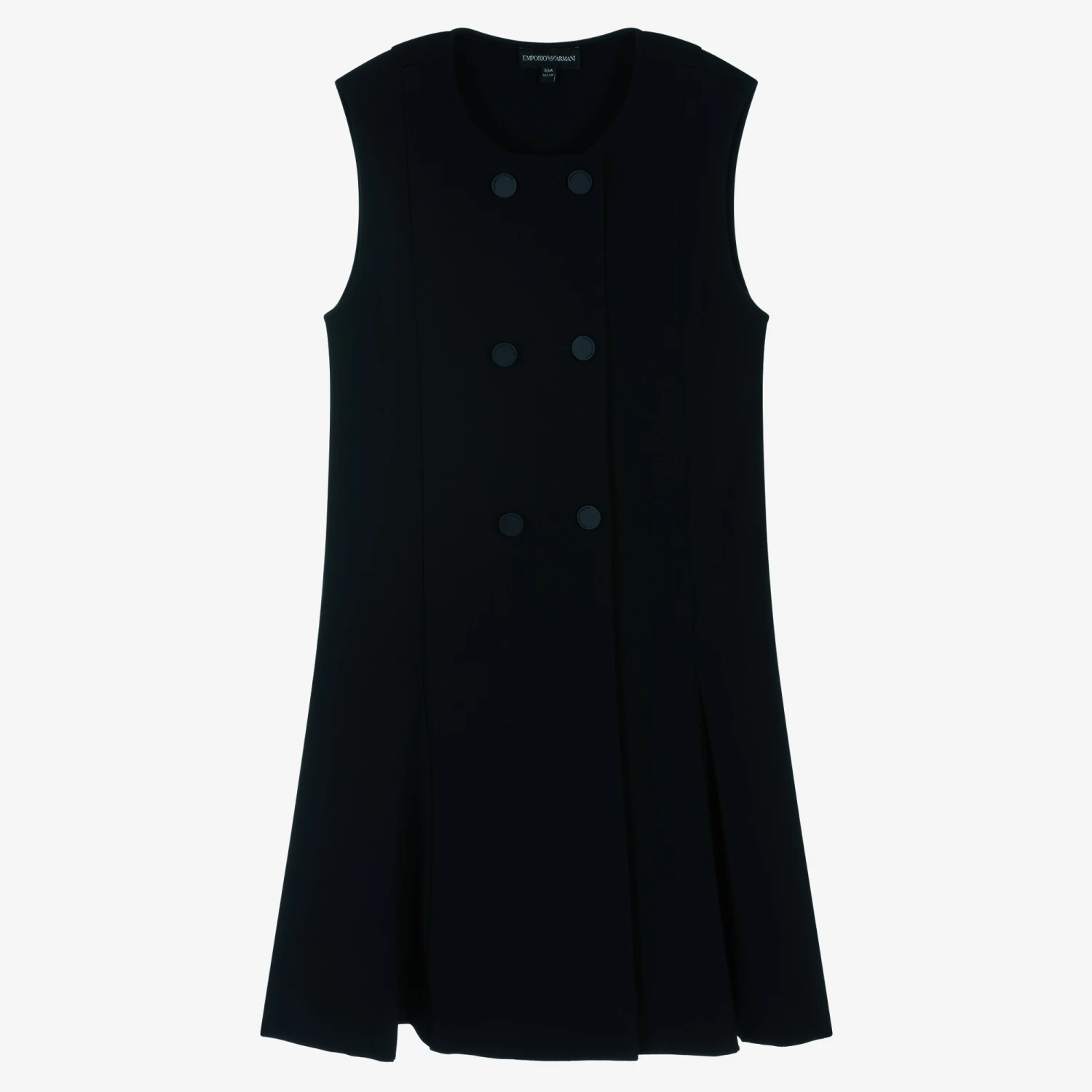 Teen girls preppy navy blue pinafore dress by Emporio Armani, made in soft viscose Milano jersey, which hangs beautifully. With lovely pleated details on the front and back, it has stylish logo embossed button fastenings, for that added branded touch.