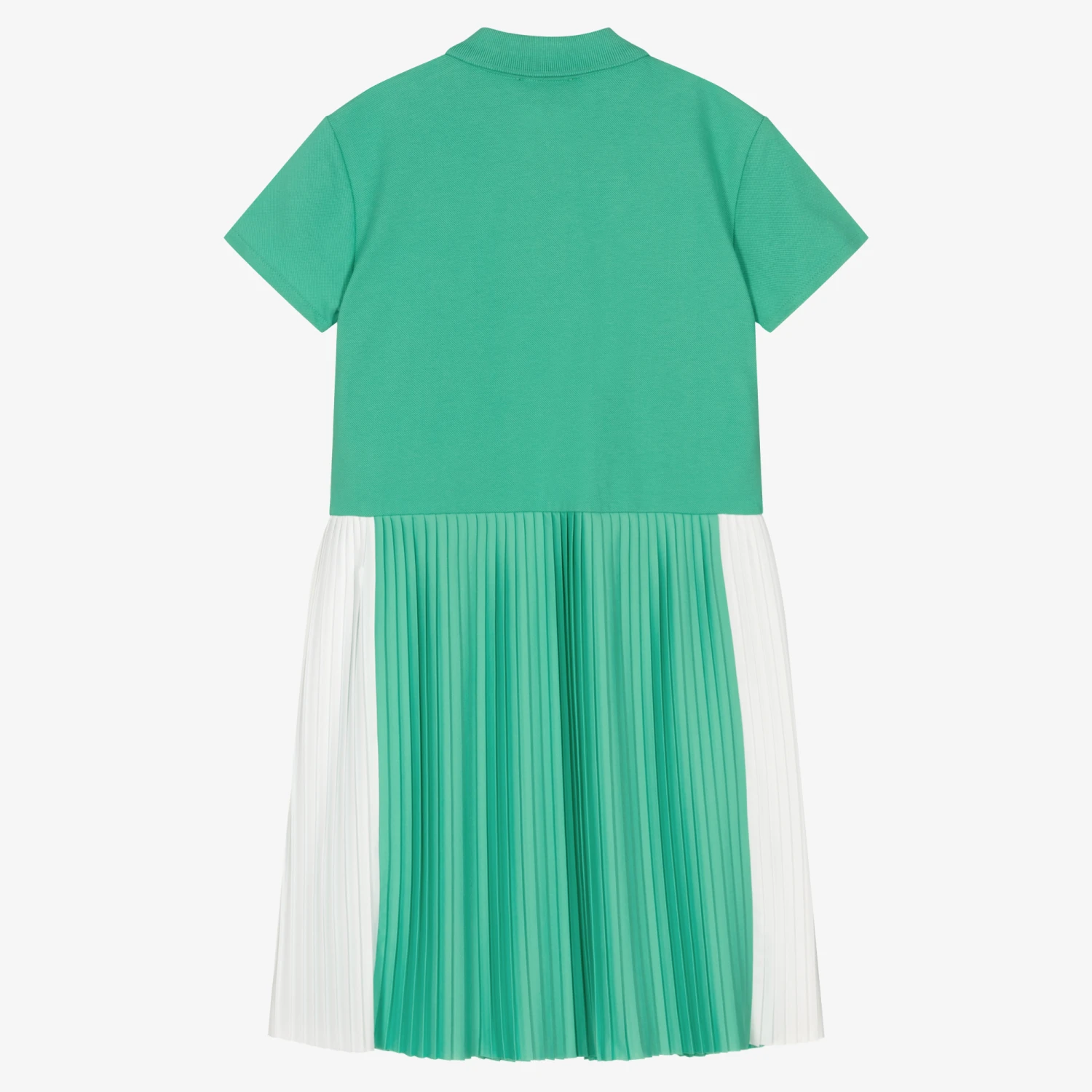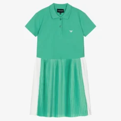 A gorgeous green polo dress for teen girls, by luxury Italian brand Emporio Armani. Channelling that sport luxe vibe, this tennis-inspired dress features an iconic Eagle logo embroidery, and a silky pleated skirt with white side panels. It is made from soft and breathable cotton piqué, and is casually finished with a button-up collar.