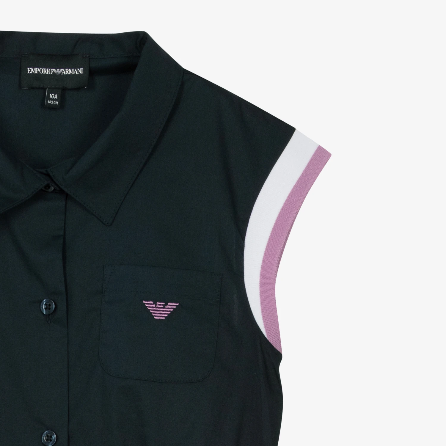 Navy blue dress for teen girls by Emporio Armani, with a purple embroidered Eagle logo on the chest pocket. Made in lightweight cotton poplin, this ankle length dress is styled with branded button fastenings on the front and a gently elasticated waistband. The cap sleeves are trimmed with lilac purple and white stripes for a sporty touch.