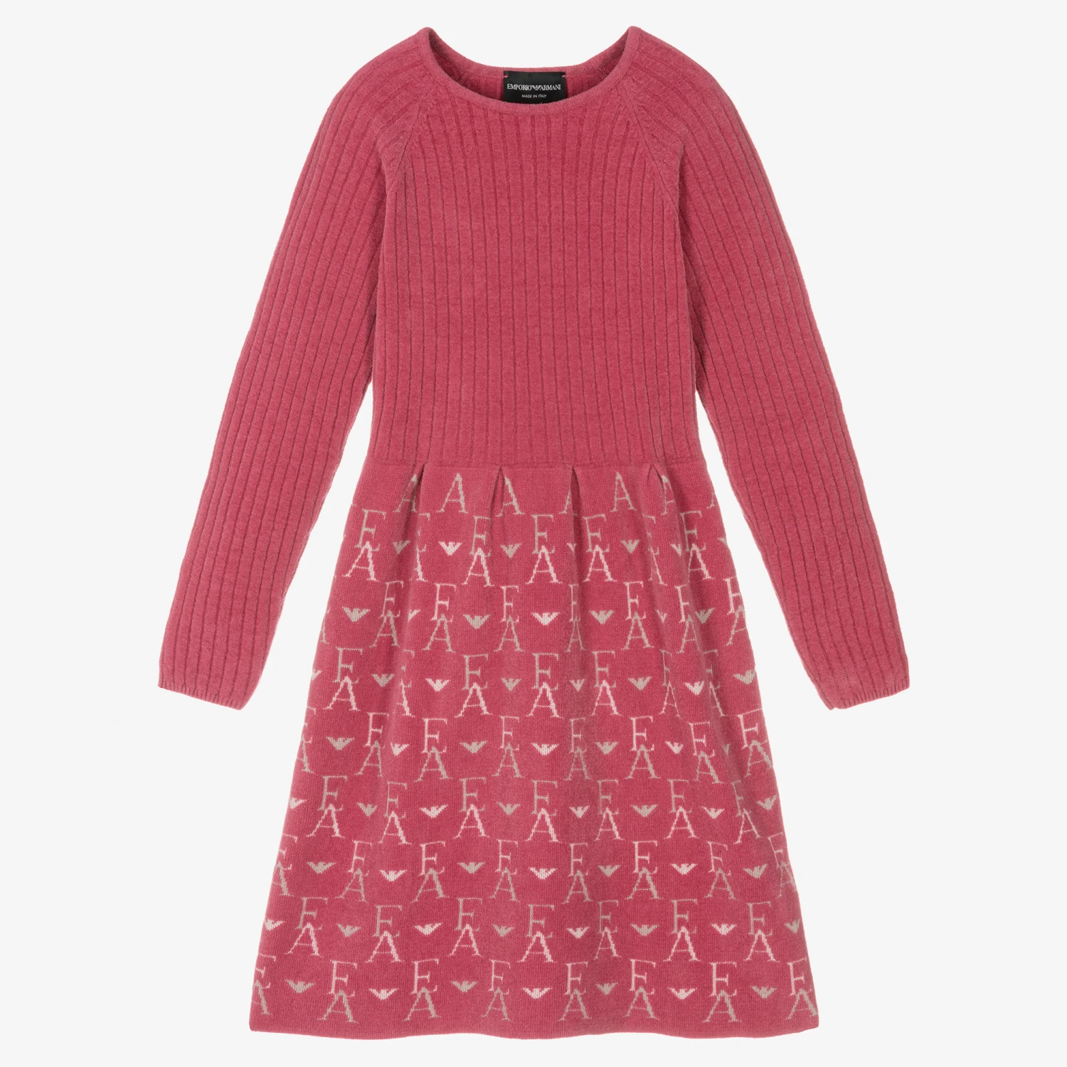 Cosy and comfy pink dress for teen girls by Emporio Armani, knitted in soft and stretchy chenille. It has a ribbed bodice and a gathered skirt with a grey and white logo pattern. Easy to wear, the dress simply slips over the head.