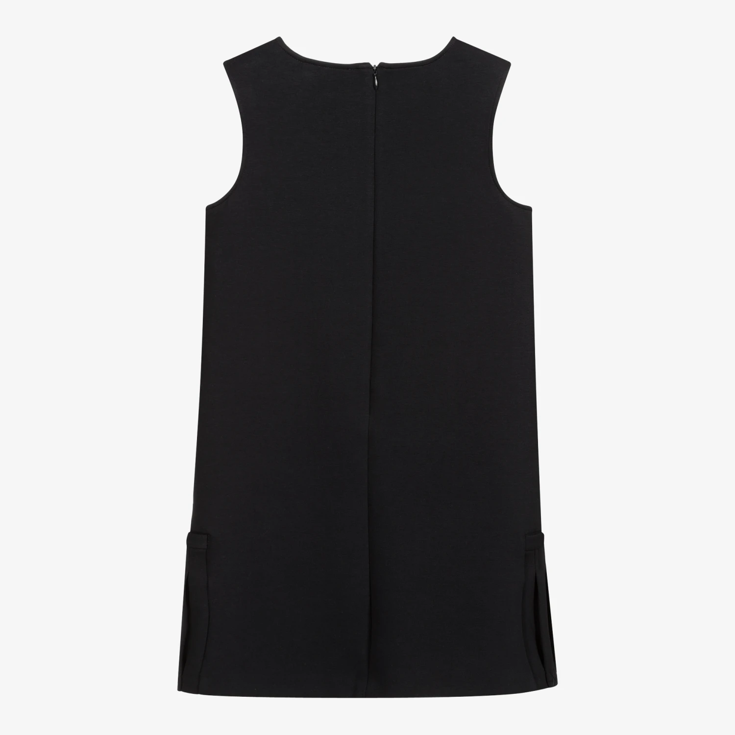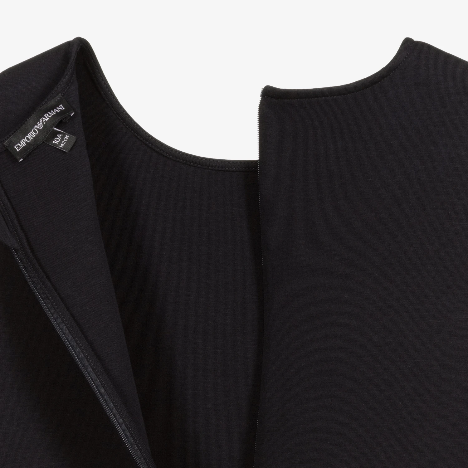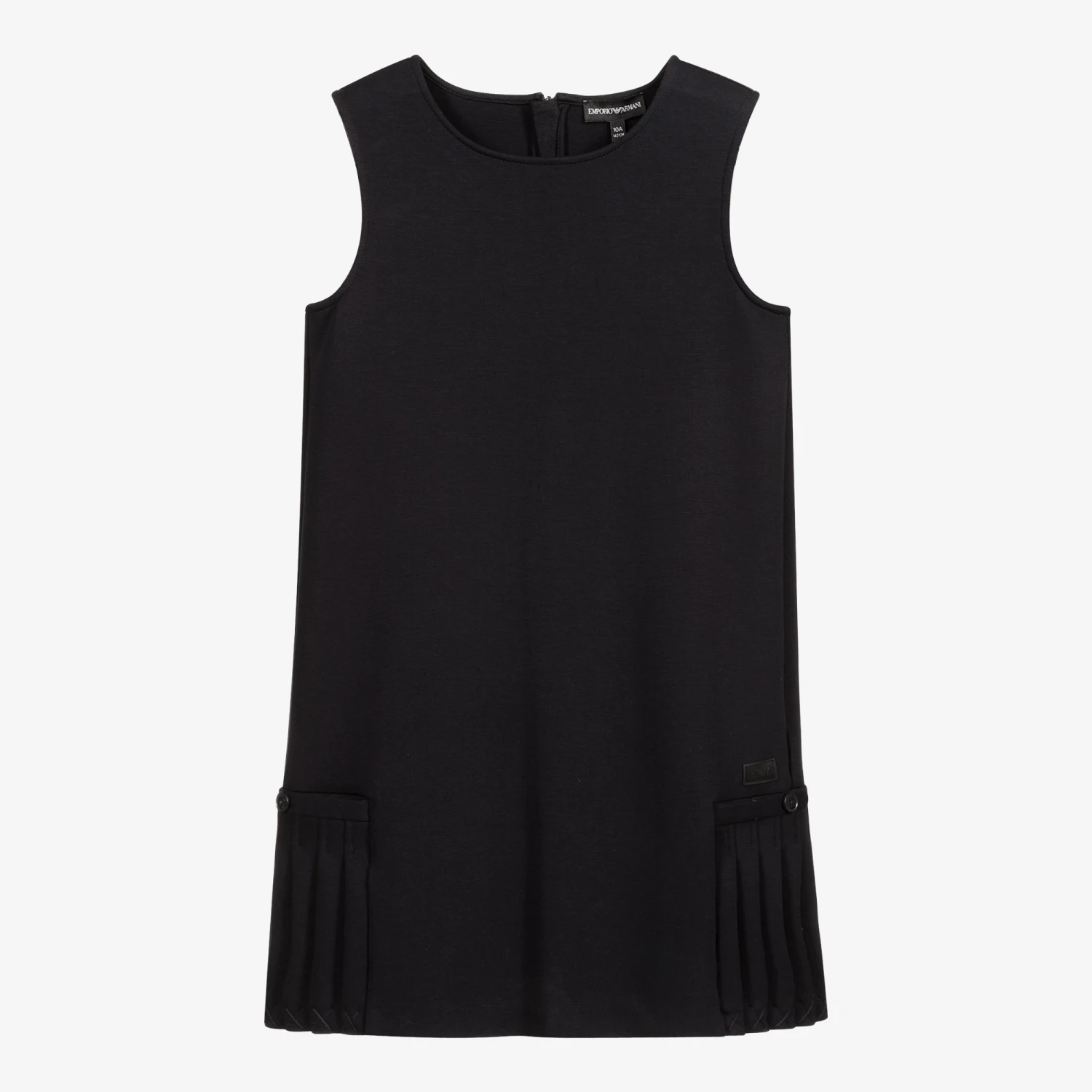 Teen girls classic navy blue shift dress by luxury designer Emporio Armani. It is made in mid-weight jersey with a zip fastening on the back. There are front button-fastening pockets concealed beneath pleated inserts, with the designer’s logo tab above. This versatile design may be worn with or without a top underneath.