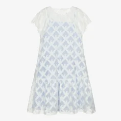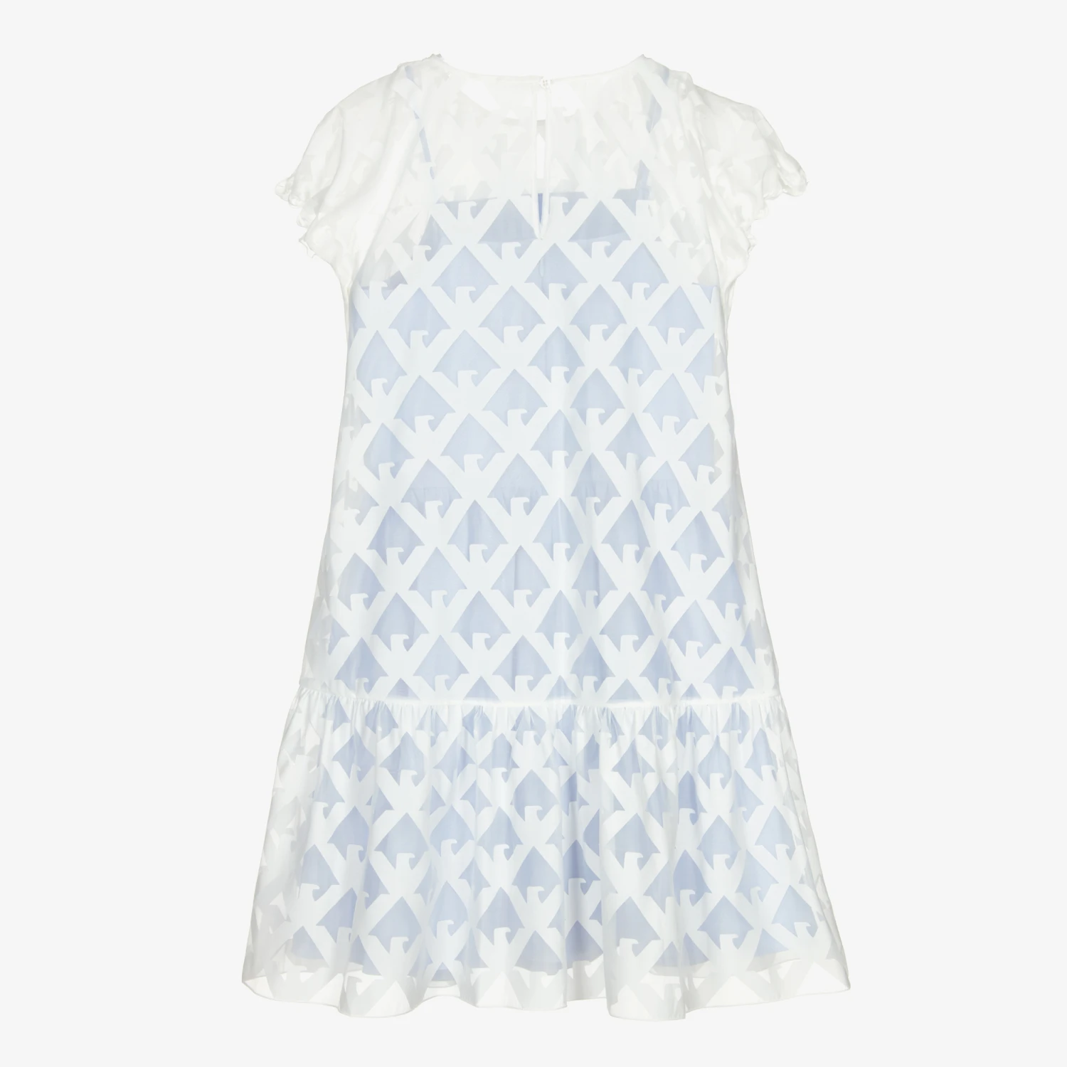 Teen girls white and blue dress by Italian brand Emporio Armani, made in soft cotton with a little stretch and a beautiful sheer organza overlay. It is patterned with a jacquard Eagle logo design. The white overlay has sweet puff sleeves, a stylish dropped waist and a branded button fastening on the back.