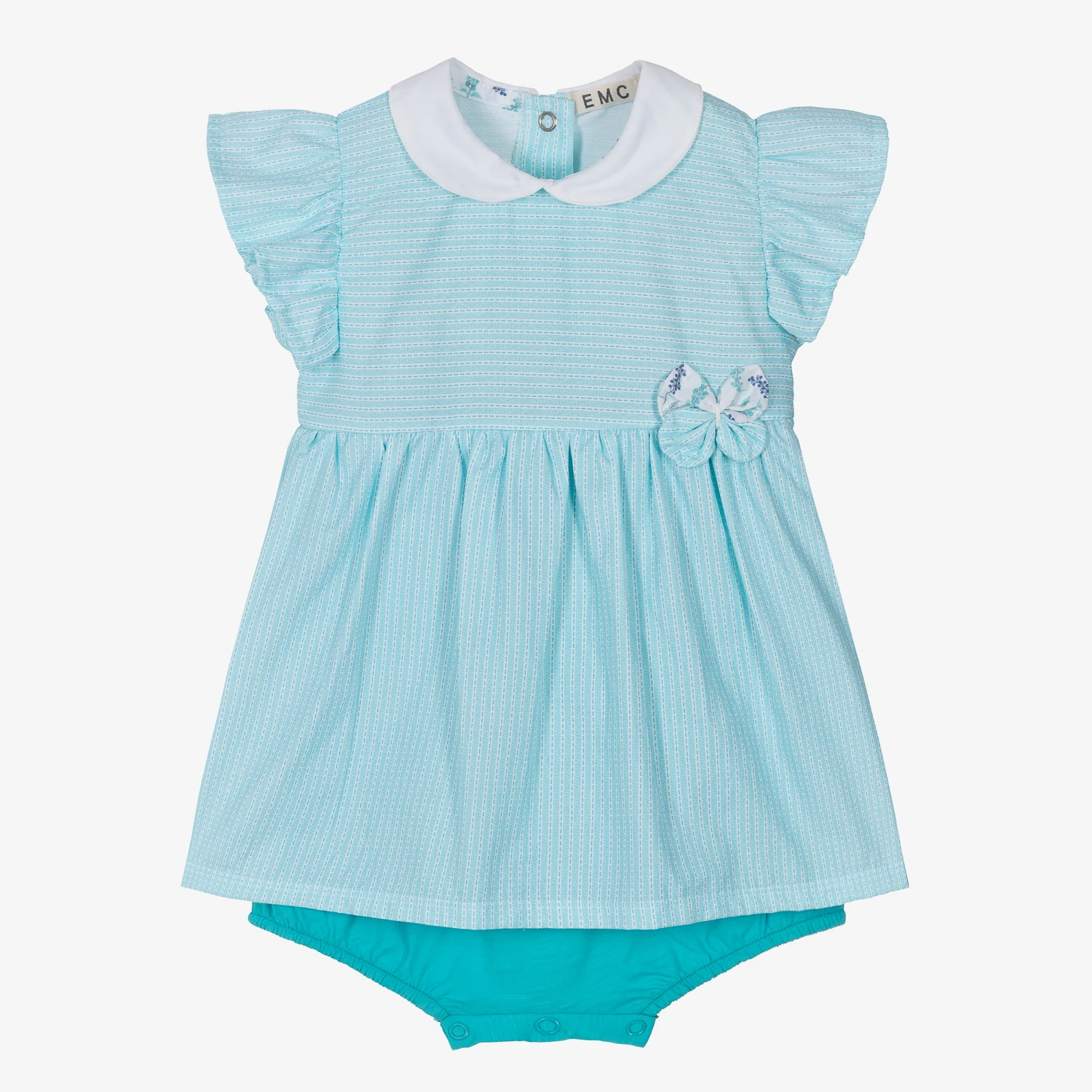 Pretty blue and white striped dress for baby girls by Everything Must Change, made in soft cotton. It has a sweet white Peter Pan collar, ruffle sleeves and a striped and floral print fixed bow on the front. It has attached knickers made in soft and stretchy cotton jersey with popper fastenings between the legs for easy dressing. This pretty dress fastens with poppers on the back