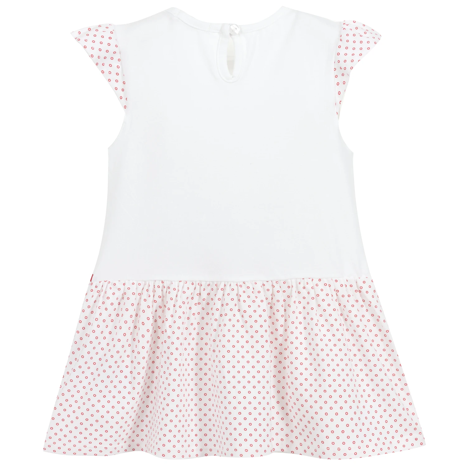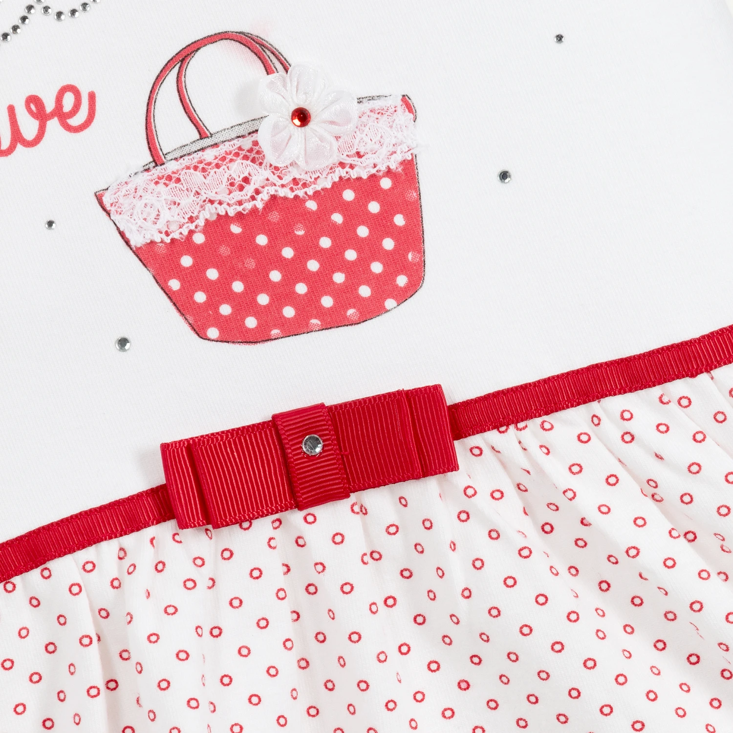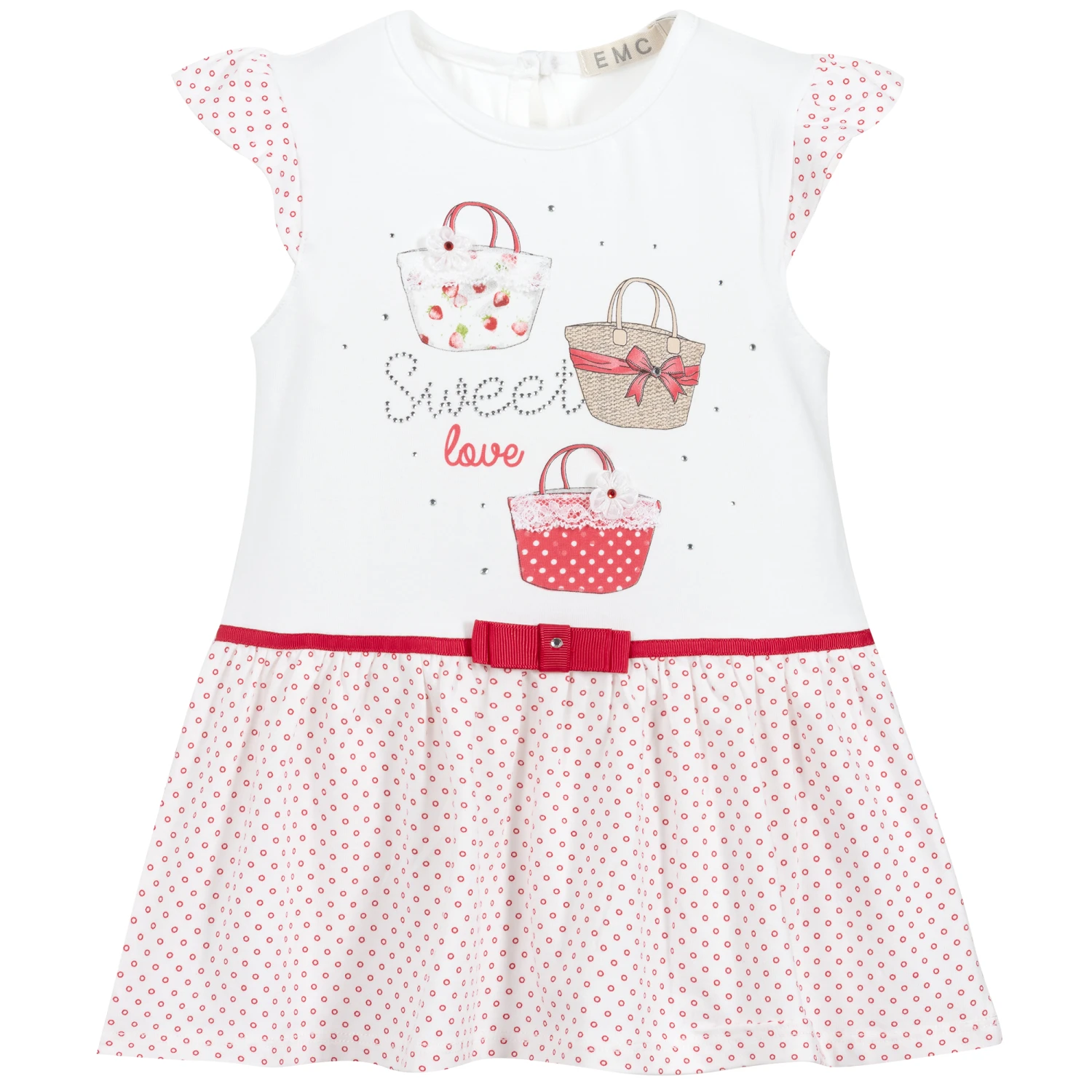 Baby girls white cotton jersey dress with red polka dots by Everything Must Change, with bag print, flower appliqués and diamantés.