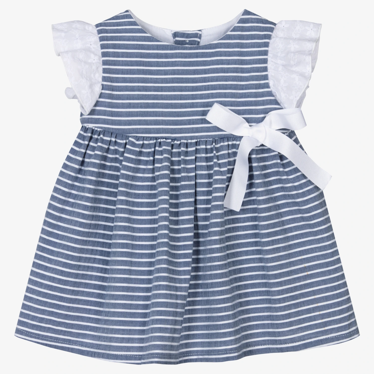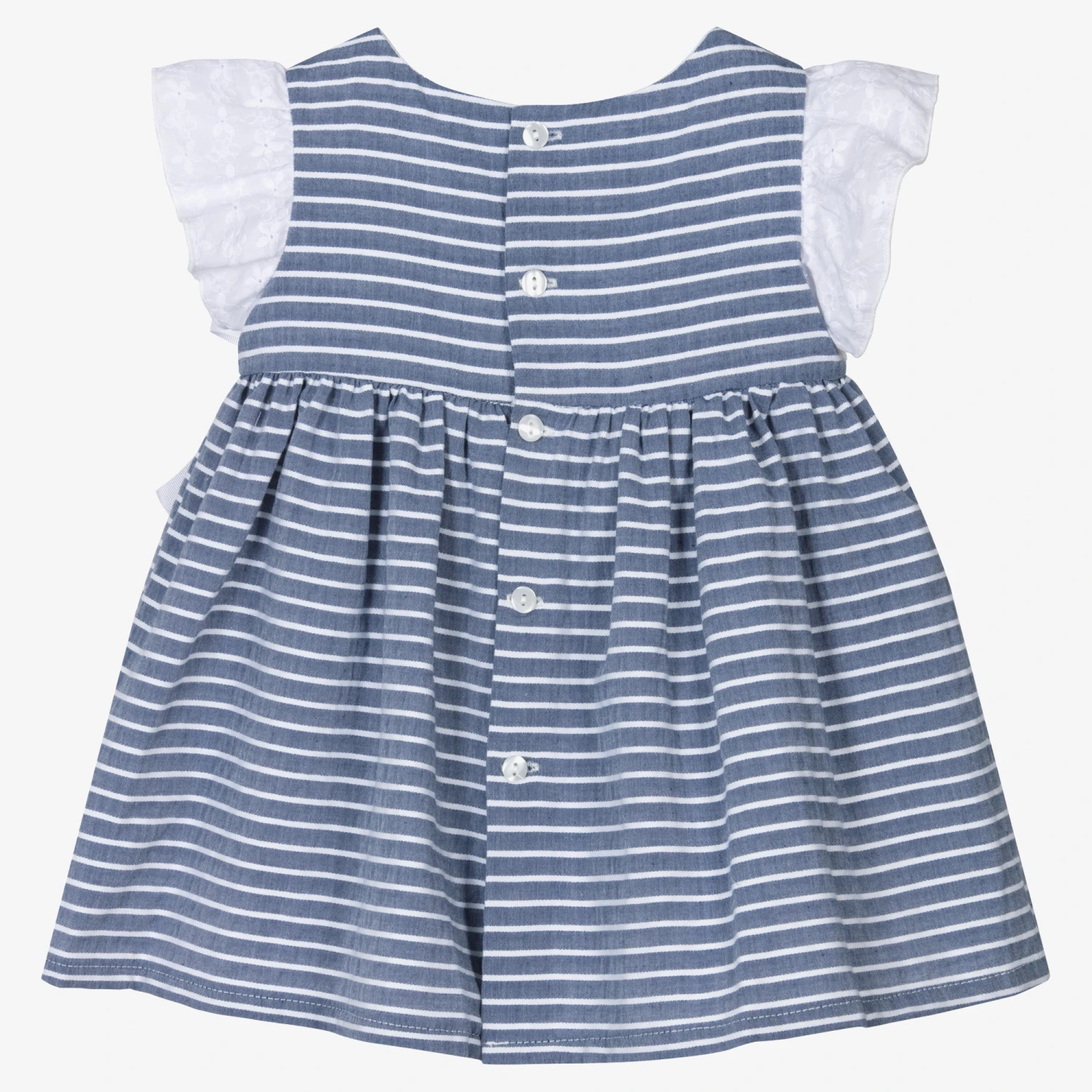 Blue striped dress for baby girls by Fina Ejerique, woven from soft and lightweight cotton. With a lined bodice, this sweet style has a white grosgrain bow on the waistline and pretty embroidered sleeves for a contrasting finish. It fastens with iridescent buttons on the back.