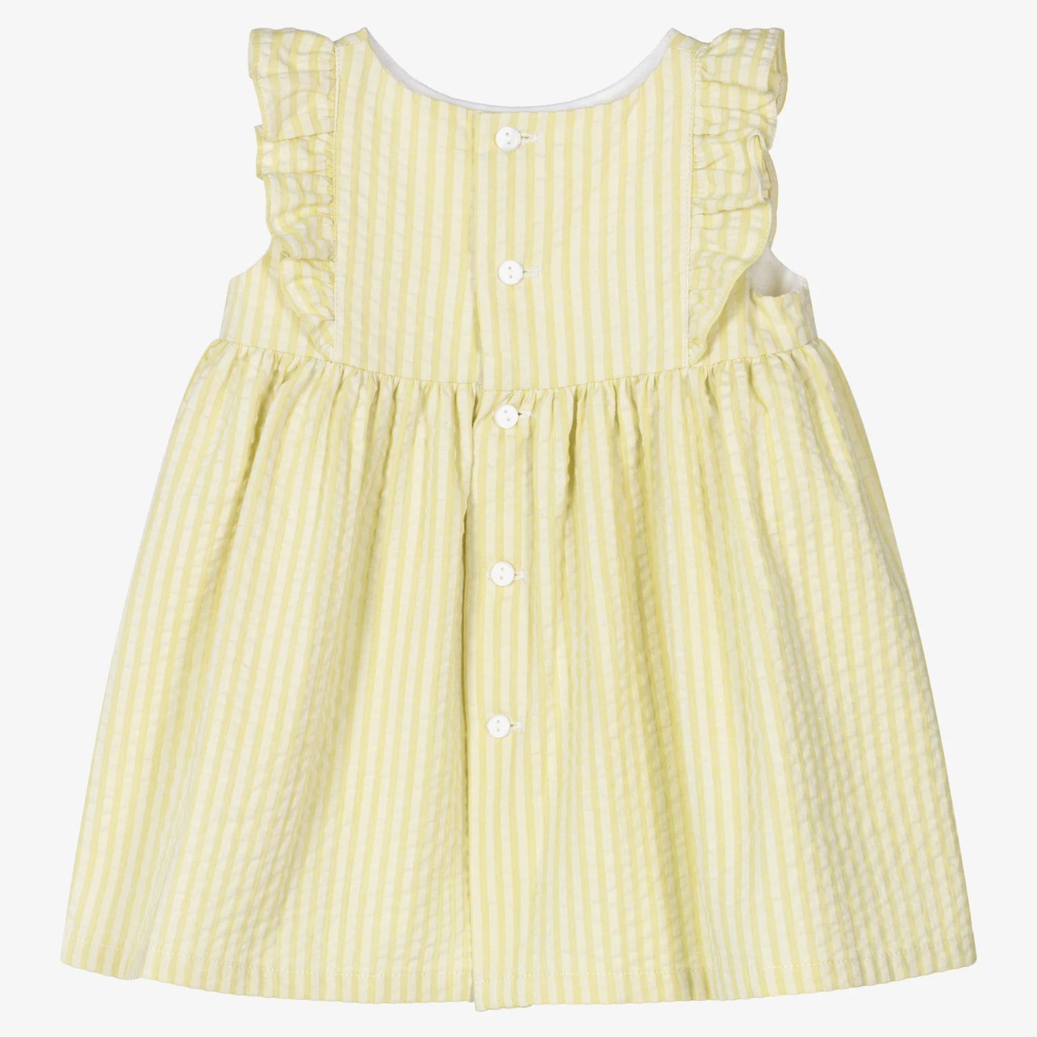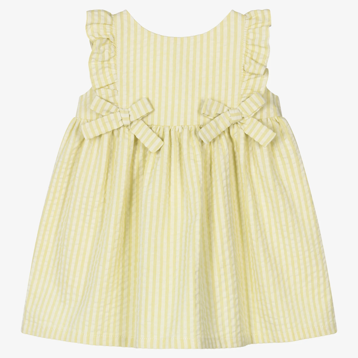 Lime green dress for baby girls by Fina Ejerique, made from soft and lightweight cotton seersucker. Fastening with buttons on the back, this classic style has bows on the front and sweet ruffles over the shoulders. The bodice is lined with soft voile for added comfort.