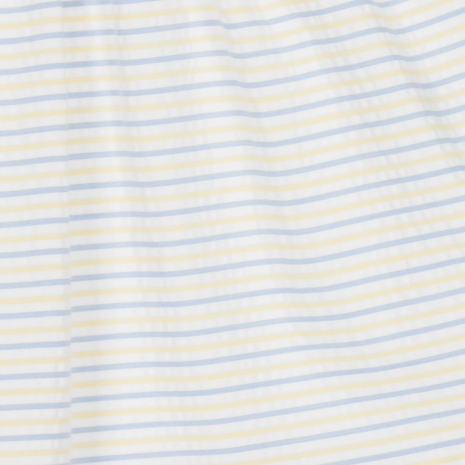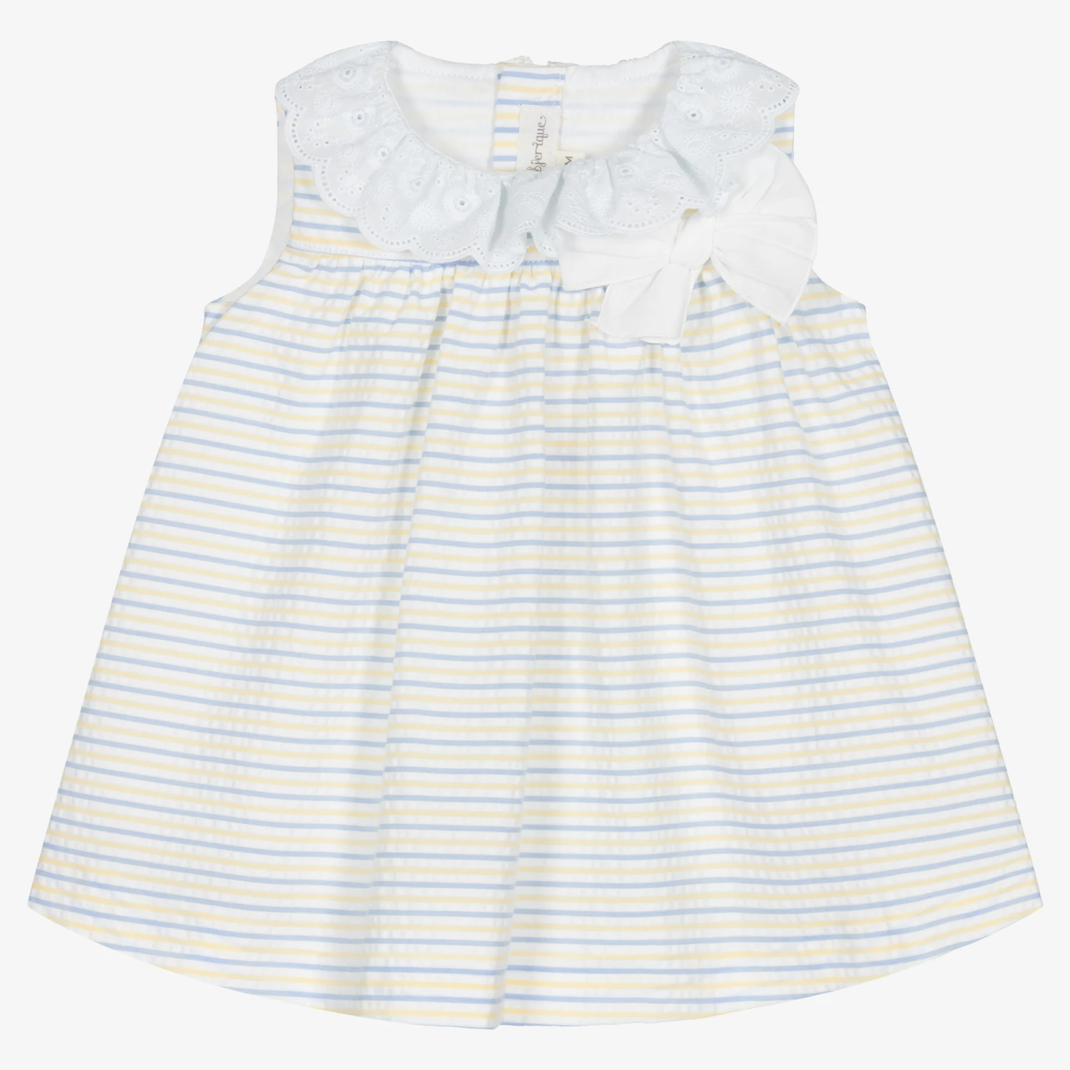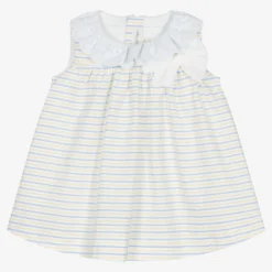 Sweet white dress for baby girls by classic Spanish brand Fina Ejerique, with yellow and pale blue stripes. Made in lightweight cotton seersucker, it has a lovely embroidered ruffle collar with scalloped edges and a fixed bow on one side. The dress has a lining on the bodice for comfort, a gathered skirt and button fastenings around the back.